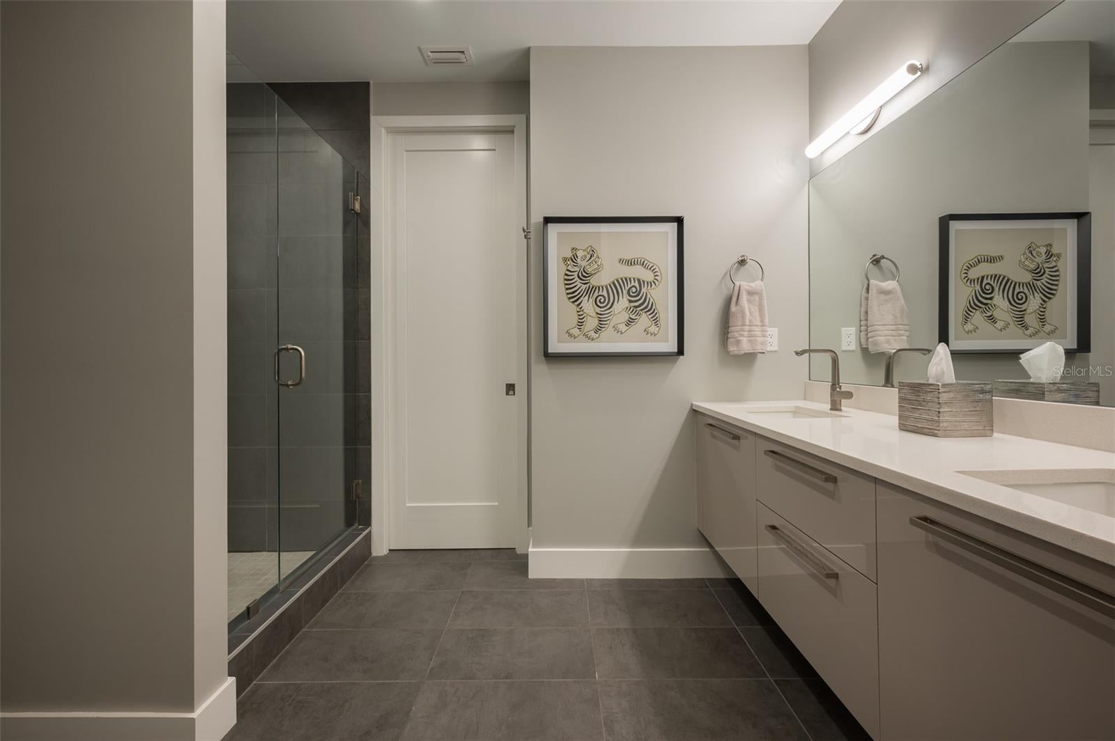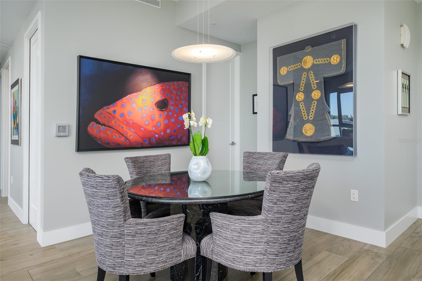 This desirable top-floor residence in the exclusive Orange Club community seamlessly blends modern design with everyday comfort. In a prime downtown location within a boutique building of only 15 residences, this sought-after Sunrise floor plan offers over 1,500 square feet of open and airy living space. The main living areas feature elegant wood-look porcelain tile flooring, complementing the home’s contemporary aesthetic. An open-concept layout enhances the flow of natural light, with floor-to-ceiling sliders leading to an expansive private balcony. Designed for relaxation and entertaining, the balcony includes an overhead fan, and a natural gas grill with ample room for outdoor dining and lounging. The chef-inspired kitchen is stylish and functional, featuring a natural gas cooktop, premium dark wood-grain cabinetry, stainless steel appliances, and a large island that provides additional workspace and seating. The adjacent dining area is open and spacious, seamlessly integrating with the kitchen and living area for effortless entertaining. The primary suite spans the width of the residence, offering a tranquil retreat with abundant natural light, a spa-inspired en-suite bath and a generous walk-in closet. The primary bath is thoughtfully designed with a glass-enclosed walk-in shower, an extra-long floating double vanity and built-in storage, all complemented by large-format porcelain tiles. One of the additional bedrooms serves as a dedicated study with a closet, making it easily adaptable as a guest space or private media den. Positioned for privacy, the additional bedrooms are on the opposite side of the home, separated from the primary suite by the main living areas. High-end features throughout include shades, premium fixtures and wood-look porcelain tile flooring in the main living spaces. This residence also includes a deeded, assigned covered parking space, climate-controlled ground-level storage and access to ample guest parking. Residents of Orange Club enjoy a heated pool and patio area, ideal for year-round relaxation. Furniture is available for purchase under a separate bill of sale. In the heart of Sarasota, near the historic Burns Court neighborhood, this exceptional residence offers the blend of urban convenience, privacy and tranquility, all within a short distance of downtown Sarasota and Sarasota Bay.