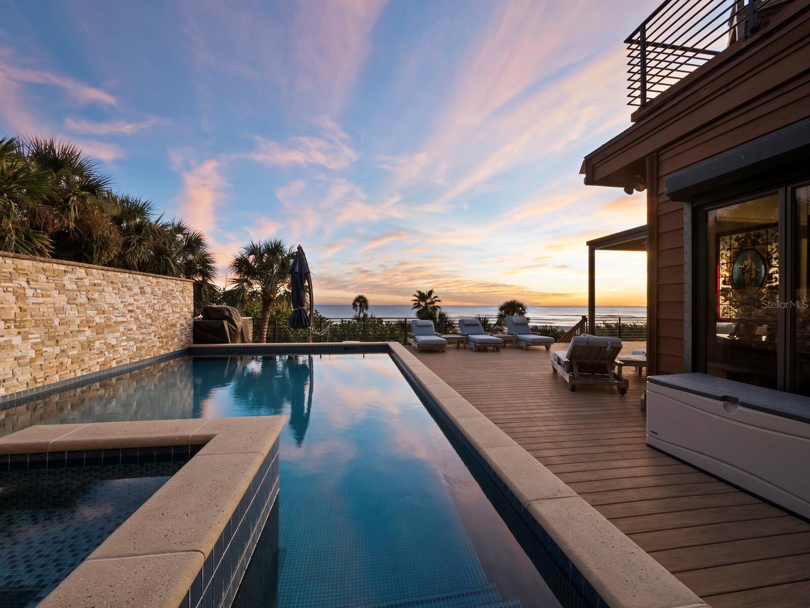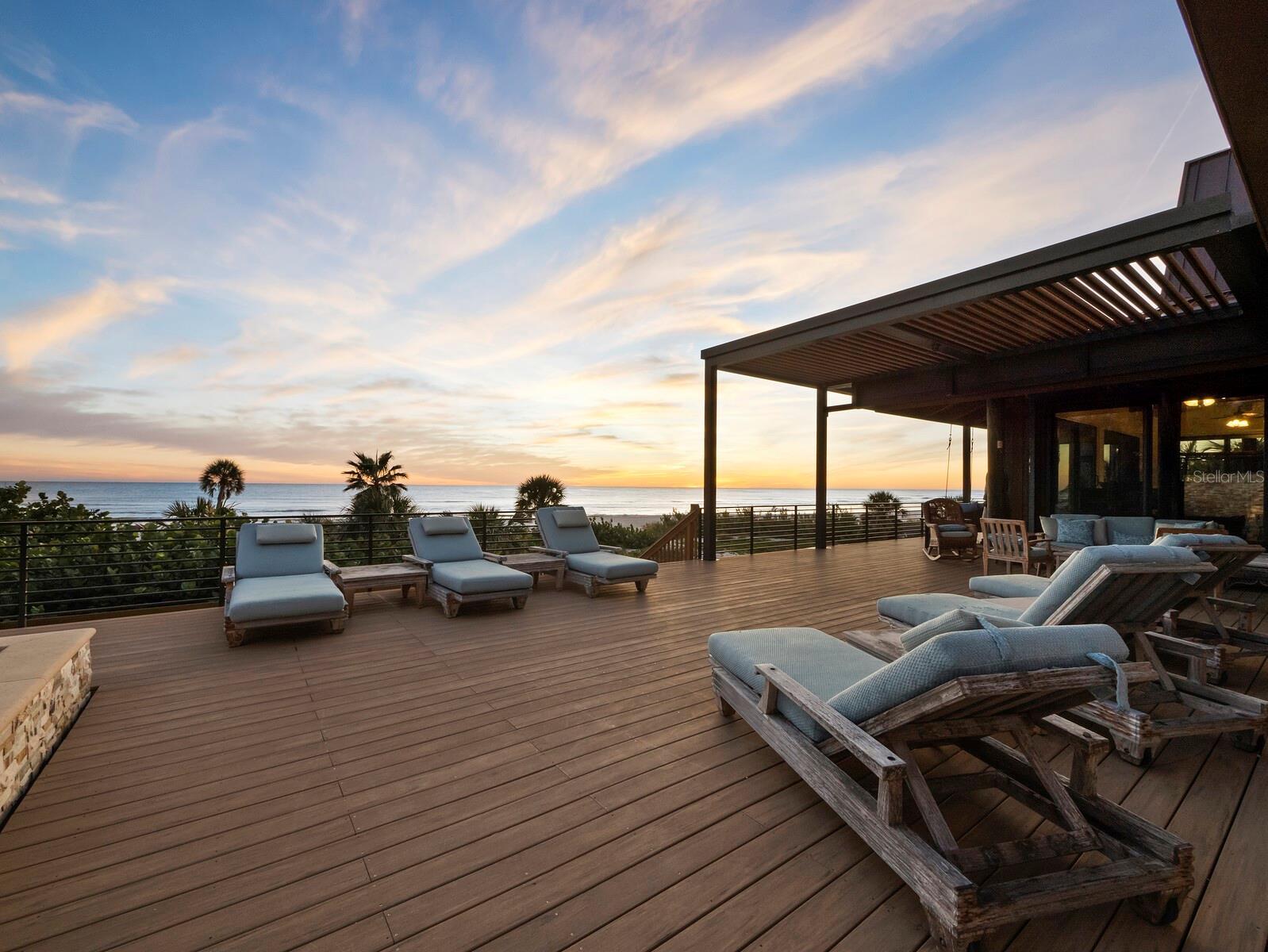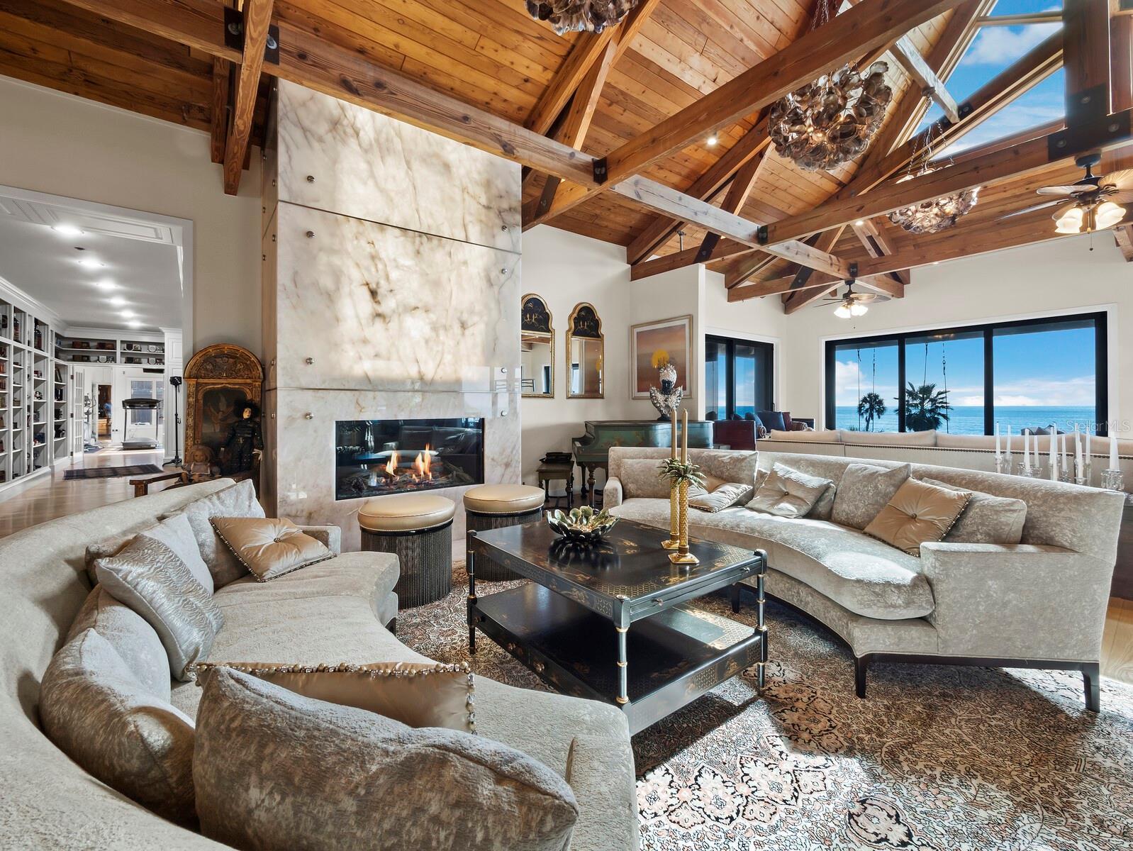 Where the sky opens wide above the Gulf and the shoreline runs uninterrupted, this extraordinary 12,000+ sq. ft. estate stands with a presence that defies comparison. Set on nearly 200 feet of pristine beachfront, the residence is elevated on pilings and wrapped in walls of glass that pull the Gulf’s horizon into every major living space. Inside, soaring cedar ceilings, exposed trusses, and dramatic lines create a sense of volume and warmth that is both refined and inviting. The great room unfolds beneath grand architectural beams and transitions effortlessly to expansive terraces above the sand. A richly crafted lounge with custom bar and billiards area brings a club-like sophistication to the home’s entertainment spaces. The extraordinary chef’s kitchen commands attention with custom inlaid cabinetry, dual oversized islands, professional-grade appliances, and a hidden pantry—ideal for both catered events and everyday living. The second-floor primary suite serves as a private escape with Gulf views, generous sitting area, and a spa-inspired bath. Additional bedroom suites offer privacy for guests, while flexible spaces—including offices, fitness room with sauna, and bonus areas—accommodate a variety of lifestyles. An elevated pool and spa overlook the beach, complemented by multiple decks and outdoor living areas that capture sunrise, sunset, and the sound of the surf. With two elevators, multi-car garage, and exceptional craftsmanship throughout, this is a residence designed for those who seek scale, presence, and true Gulf-front living.