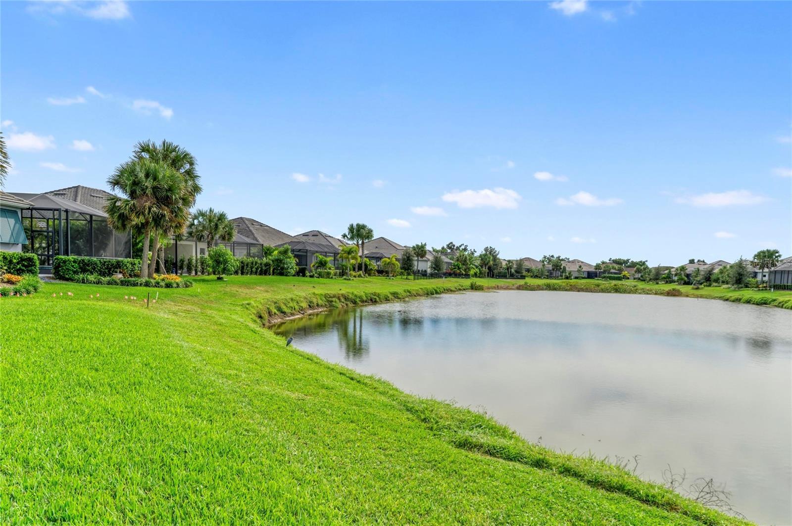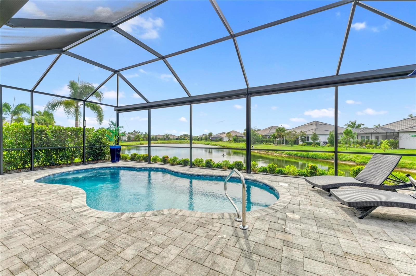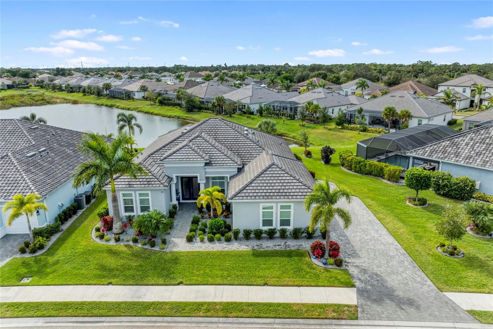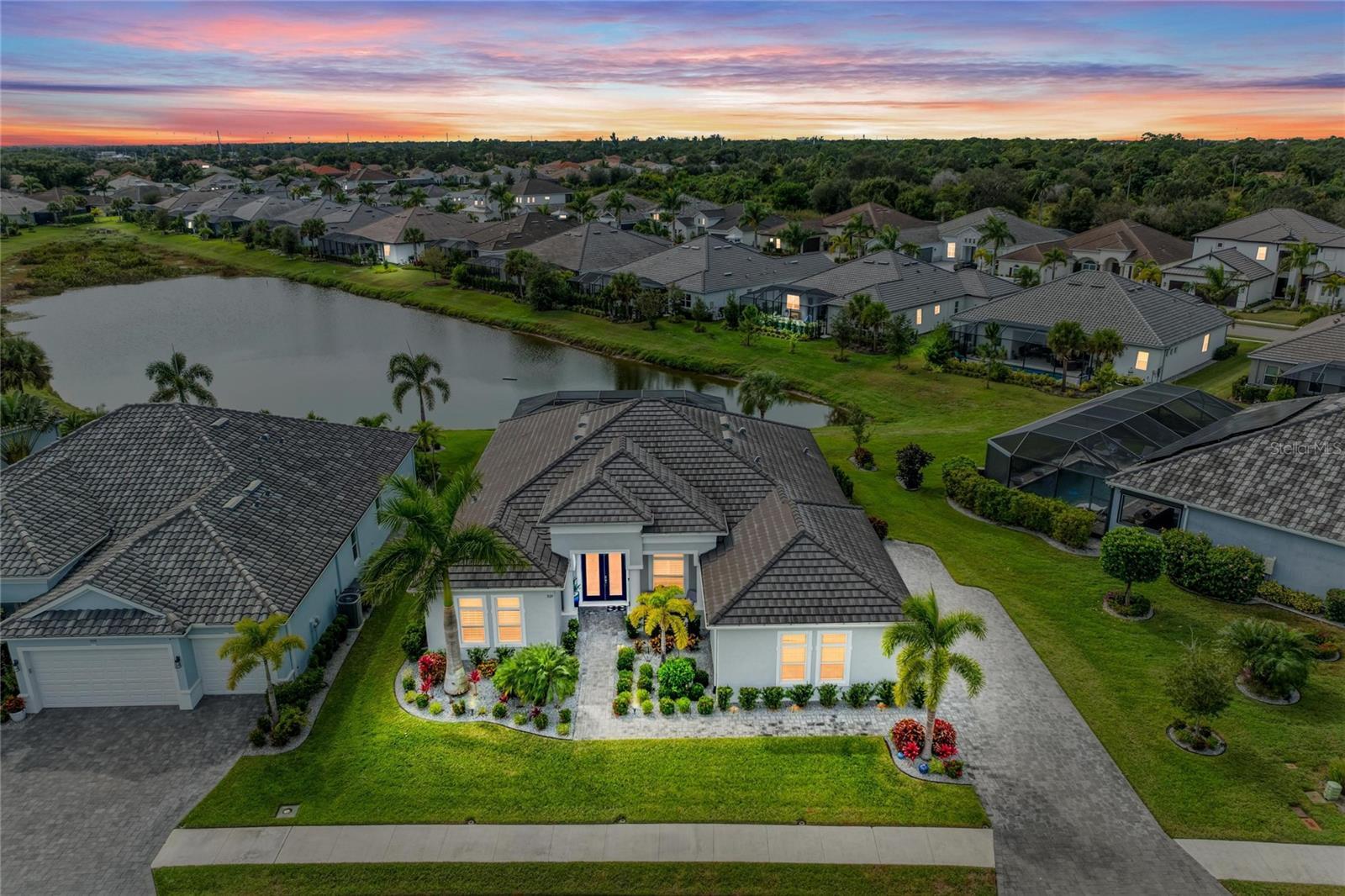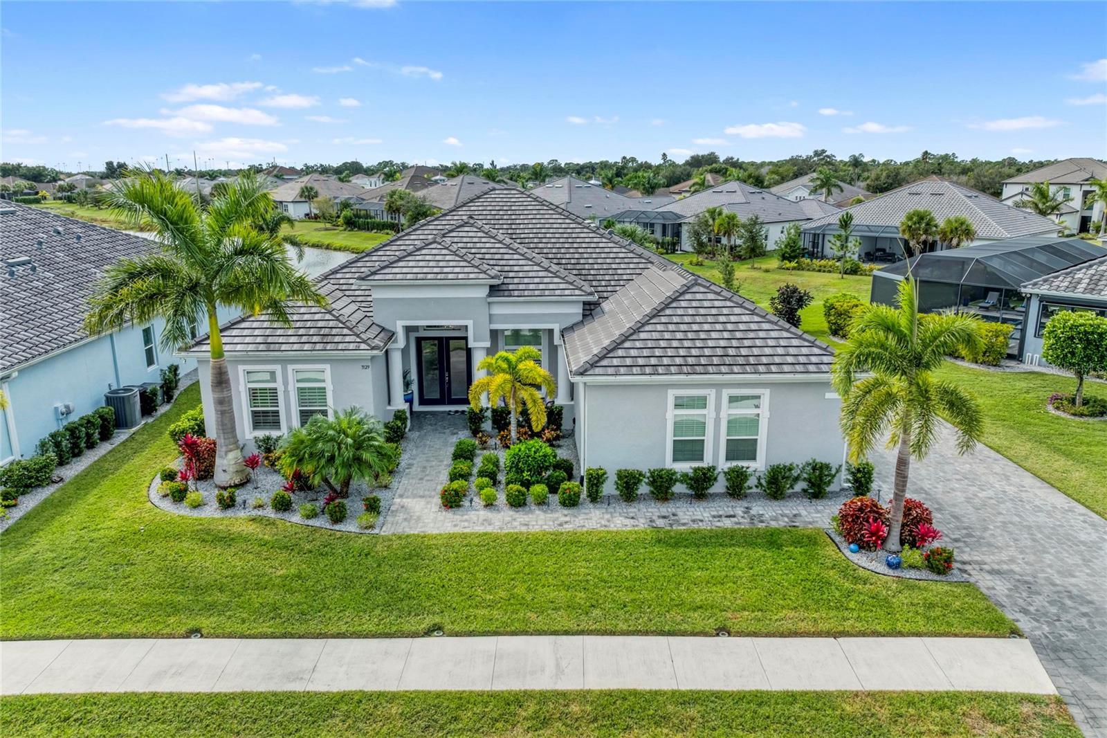 Upon entering the Gates of this Beautiful Boutique Enclave community Waverley of 110 homes you will not be disappointed! Medallion Home constructed this gated community of single-family residences, offering a selection of Luxury Homes. Located on a tranquil spacious lake lot. The Aruba open floor plan concept 3-bedroom 2 -bath plus office. Great Room highlights gorgeous ceiling details, tray with recessed lighting featuring daytime and nighttime ambiance, media wall built in with lights, electric fireplace, polished porcelain tile flooring throughout. Home has plantation shutters, a frosted front entry door along with all bedrooms, and office doors which give this home an elegant feeling! The gourmet kitchen features a quartz Island accented with stone detail, gourmet cabinets, vivid lighting, glass tile backsplash, an induction cooktop, microwave mounted on the wall, and an oven with a special insert that allows for two separate temperature zones, stainless steel appliances and a matching exhaust system complete the space, making it both functional and visually appealing. Owners Suite features custom accent wall on a diamond pattern, niche with shiplap, crown molding, custom tray ceiling with led lighting, recessed lighting, and fan, also door that leads out to lanai. Owners Bathroom features Illuminated mirrors, double vanity with quartz counter tops and floor to ceiling walk in shower. Office space seller has added shiplap wall, custom cabinets with quartz, crown molding, recessed lighting, and fan. As you step outside you have an extended lanai covered area with ceiling and wall special outdoor shiplap made for outdoors only. Lots of areas for entertaining. Outdoor day and night light that change color. Outdoor kitchen area with refrigerator, sink and grill that overlooks beautiful pool and lake. Owner had company installed a screen that is on a remote that comes down for privacy. Paver driveway leads you to the 3-car right-hand side load oversized garage. AC has 3 zones. So many upgrades to mention! Nestled in one of Sarasota’s top-rated school districts, this exclusive neighborhood combines elegance with an exceptional lifestyle including water irrigation, walking trails, and great convenience to I-75. Waverley is a short drive to Sarasota’s best beaches, Siesta Key, Lido Beach, golf courses and close to everyday shopping conveniences. No CDD and low HOA fees.