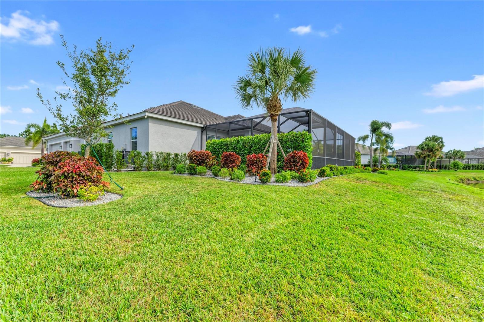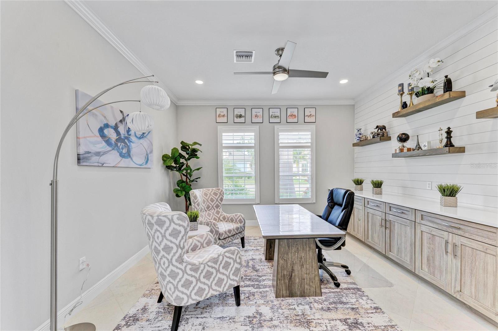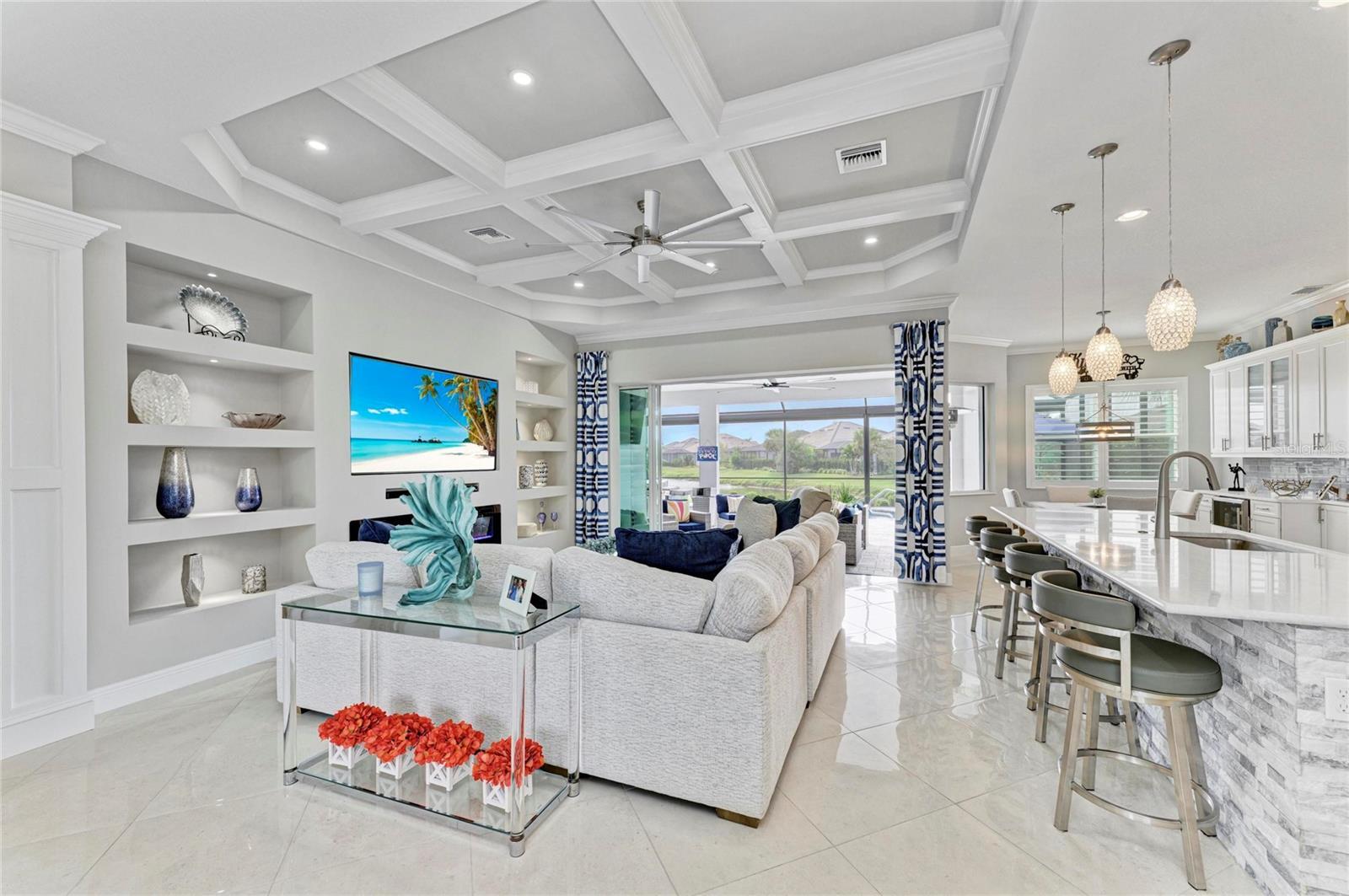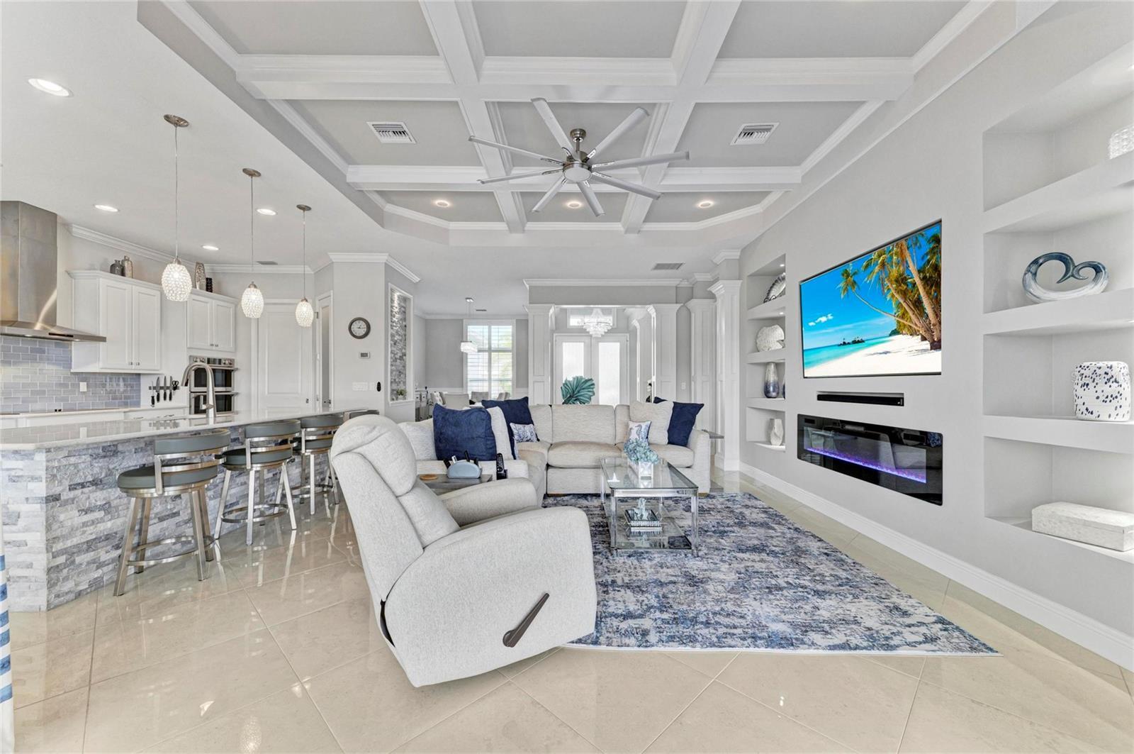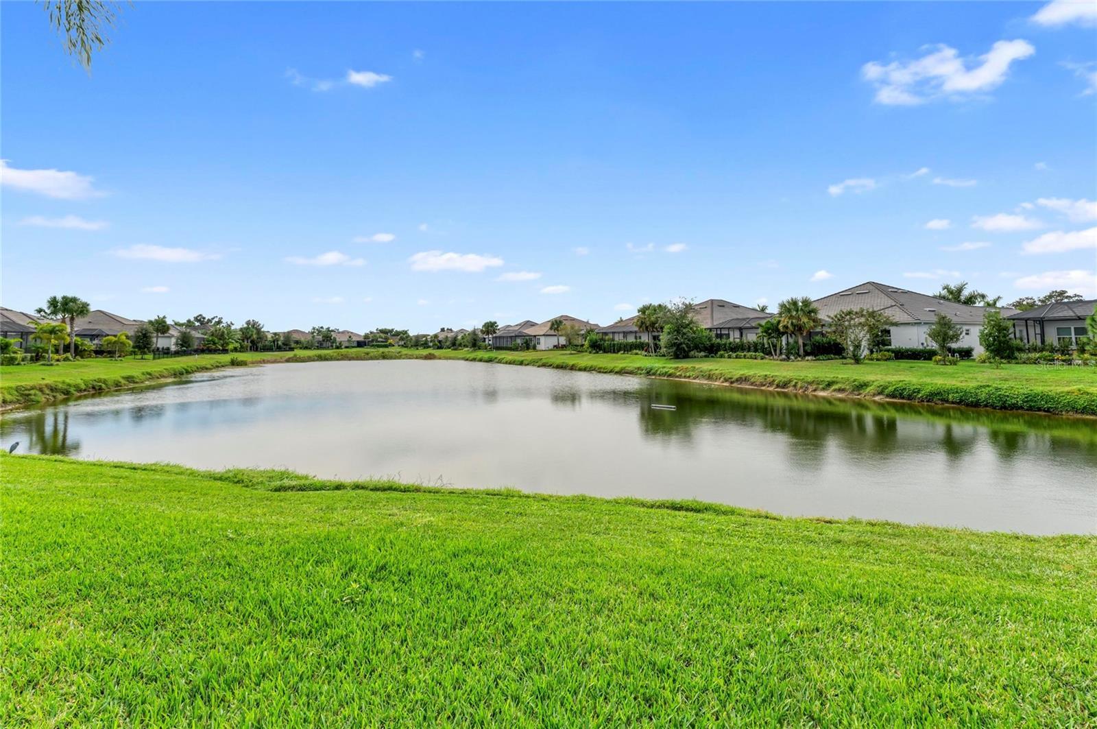 Upon entering the Gates of this Beautiful Boutique Enclave community Waverley of 110 homes you will not be disappointed! Medallion Home constructed this gated community of single-family residences, offering a selection of Luxury Homes. Located on a tranquil spacious lake lot. The Aruba open floor plan concept 3-bedroom 2 -bath plus office. Great Room highlights gorgeous ceiling details, tray with recessed lighting featuring daytime and nighttime ambiance, media wall built in with lights, electric fireplace, polished porcelain tile flooring throughout. Home has plantation shutters, a frosted front entry door along with all bedrooms, and office doors which give this home an elegant feeling! The gourmet kitchen features a quartz Island accented with stone detail, gourmet cabinets, vivid lighting, glass tile backsplash, an induction cooktop, microwave mounted on the wall, and an oven with a special insert that allows for two separate temperature zones, stainless steel appliances and a matching exhaust system complete the space, making it both functional and visually appealing. Owners Suite features custom accent wall on a diamond pattern, niche with shiplap, crown molding, custom tray ceiling with led lighting, recessed lighting, and fan, also door that leads out to lanai. Owners Bathroom features Illuminated mirrors, double vanity with quartz counter tops and floor to ceiling walk in shower. Office space seller has added shiplap wall, custom cabinets with quartz, crown molding, recessed lighting, and fan. As you step outside you have an extended lanai covered area with ceiling and wall special outdoor shiplap made for outdoors only. Lots of areas for entertaining. Outdoor day and night light that change color. Outdoor kitchen area with refrigerator, sink and grill that overlooks beautiful pool and lake. Owner had company installed a screen that is on a remote that comes down for privacy. Paver driveway leads you to the 3-car right-hand side load oversized garage. AC has 3 zones. So many upgrades to mention! Nestled in one of Sarasota’s top-rated school districts, this exclusive neighborhood combines elegance with an exceptional lifestyle including water irrigation, walking trails, and great convenience to I-75. Waverley is a short drive to Sarasota’s best beaches, Siesta Key, Lido Beach, golf courses and close to everyday shopping conveniences. No CDD and low HOA fees.