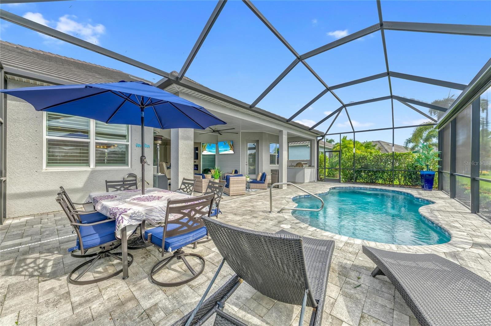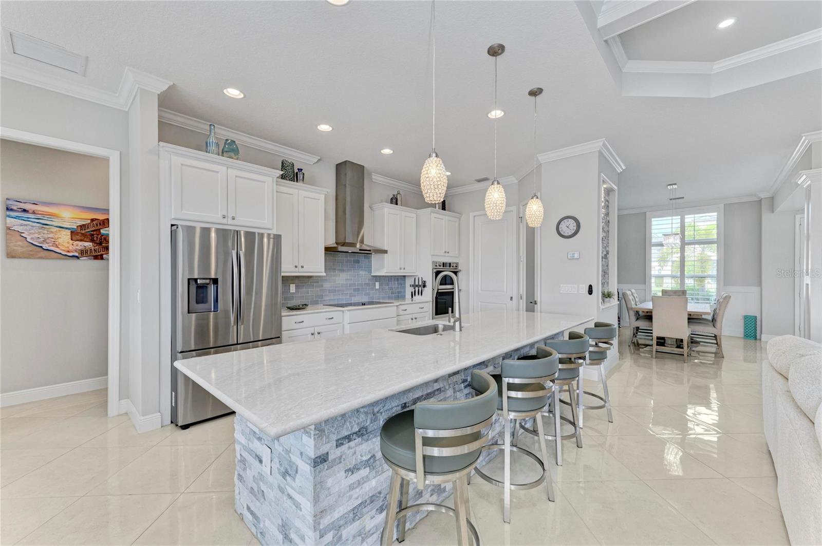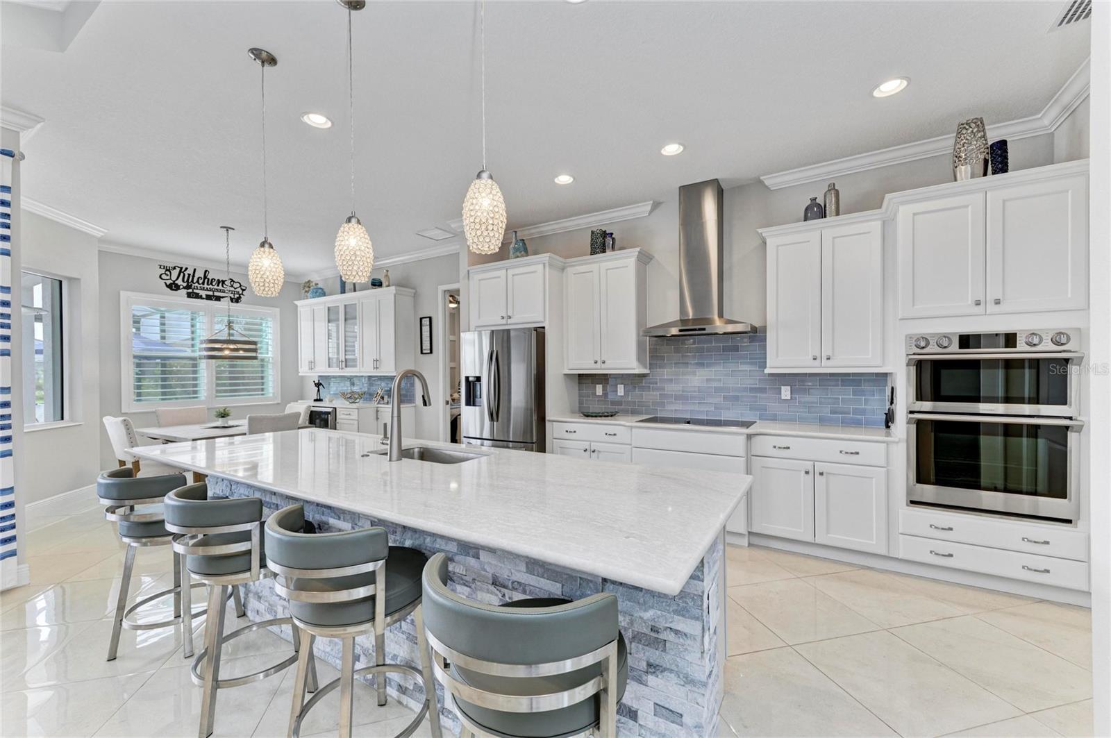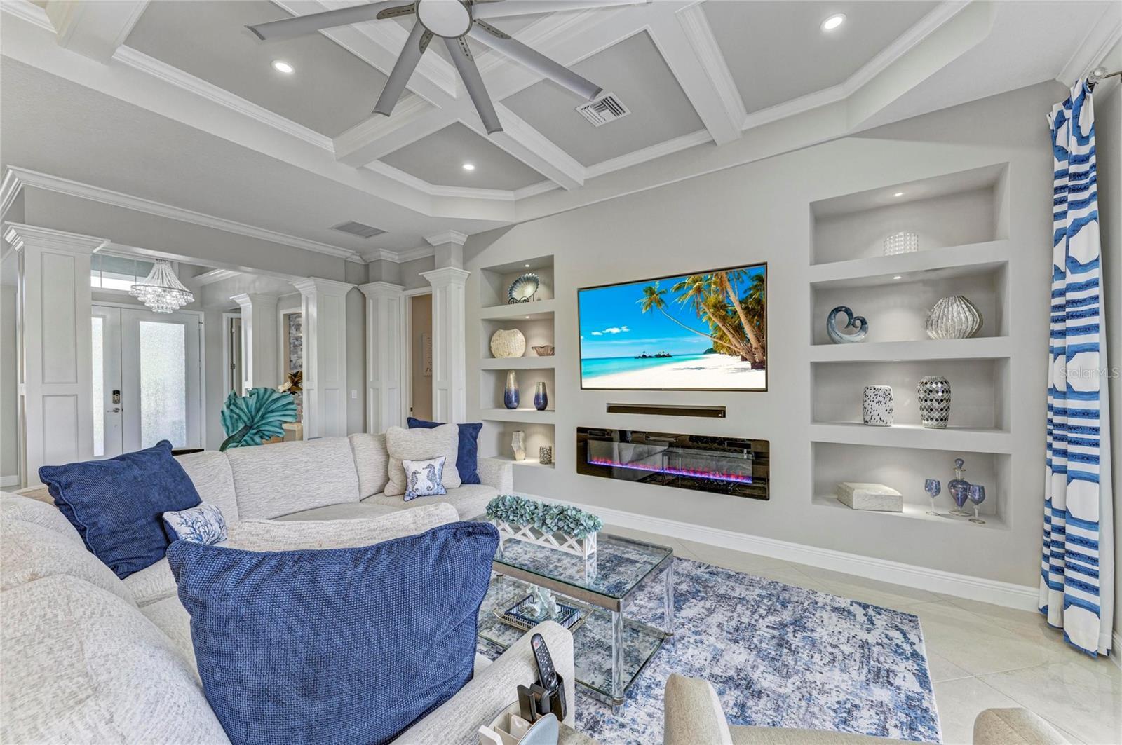 Upon entering the Gates of this Beautiful Boutique Enclave community Waverley of 110 homes you will not be disappointed! Medallion Home constructed this gated community of single-family residences, offering a selection of Luxury Homes. Located on a tranquil spacious lake lot. The Aruba open floor plan concept 3-bedroom 2 -bath plus office. Great Room highlights gorgeous ceiling details, tray with recessed lighting featuring daytime and nighttime ambiance, media wall built in with lights, electric fireplace, polished porcelain tile flooring throughout. Home has plantation shutters, a frosted front entry door along with all bedrooms, and office doors which give this home an elegant feeling! The gourmet kitchen features a quartz Island accented with stone detail, gourmet cabinets, vivid lighting, glass tile backsplash, an induction cooktop, microwave mounted on the wall, and an oven with a special insert that allows for two separate temperature zones, stainless steel appliances and a matching exhaust system complete the space, making it both functional and visually appealing. Owners Suite features custom accent wall on a diamond pattern, niche with shiplap, crown molding, custom tray ceiling with led lighting, recessed lighting, and fan, also door that leads out to lanai. Owners Bathroom features Illuminated mirrors, double vanity with quartz counter tops and floor to ceiling walk in shower. Office space seller has added shiplap wall, custom cabinets with quartz, crown molding, recessed lighting, and fan. As you step outside you have an extended lanai covered area with ceiling and wall special outdoor shiplap made for outdoors only. Lots of areas for entertaining. Outdoor day and night light that change color. Outdoor kitchen area with refrigerator, sink and grill that overlooks beautiful pool and lake. Owner had company installed a screen that is on a remote that comes down for privacy. Paver driveway leads you to the 3-car right-hand side load oversized garage. AC has 3 zones. So many upgrades to mention! Nestled in one of Sarasota’s top-rated school districts, this exclusive neighborhood combines elegance with an exceptional lifestyle including water irrigation, walking trails, and great convenience to I-75. Waverley is a short drive to Sarasota’s best beaches, Siesta Key, Lido Beach, golf courses and close to everyday shopping conveniences. No CDD and low HOA fees.