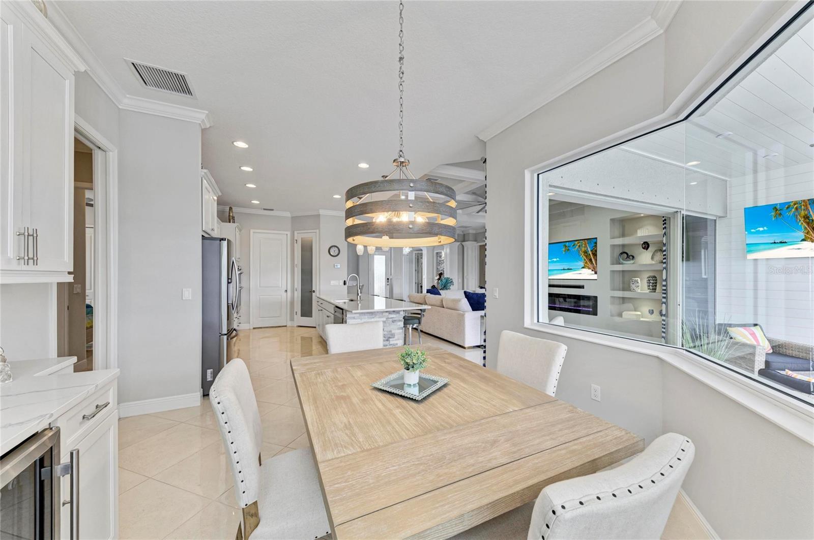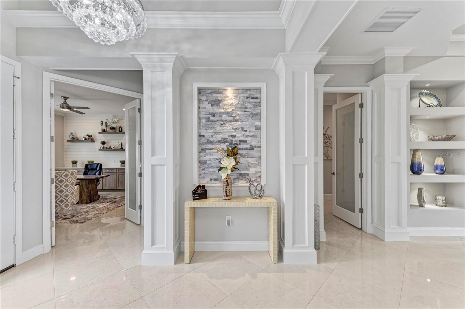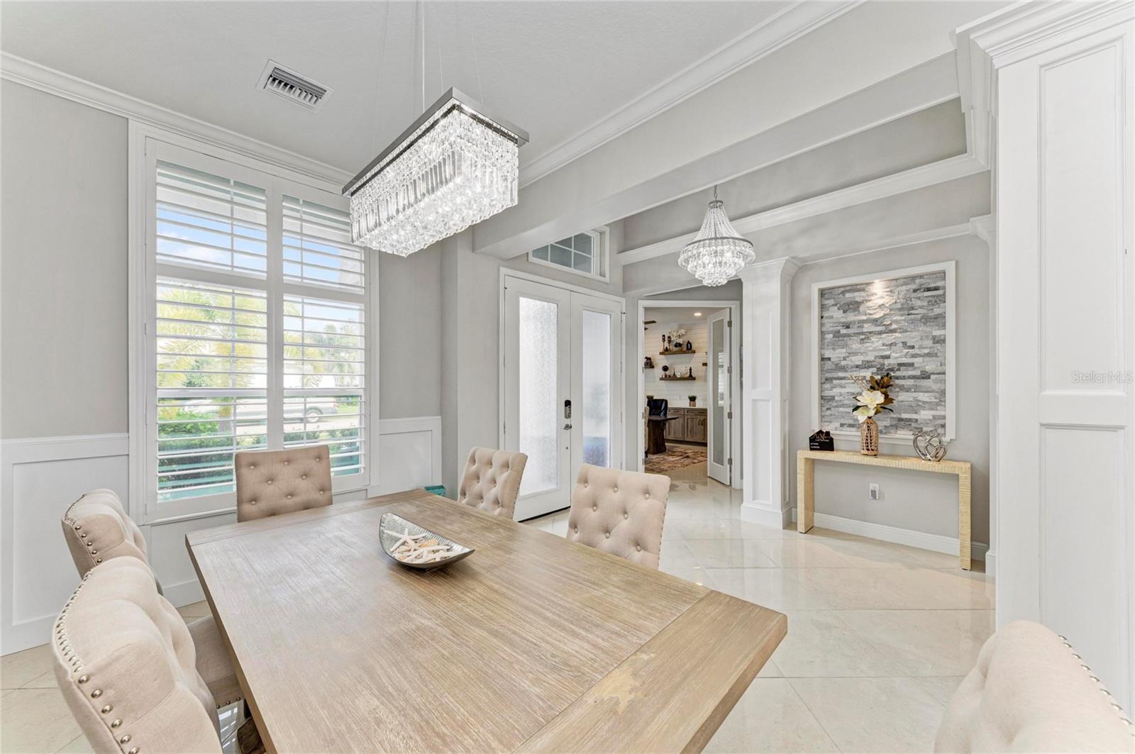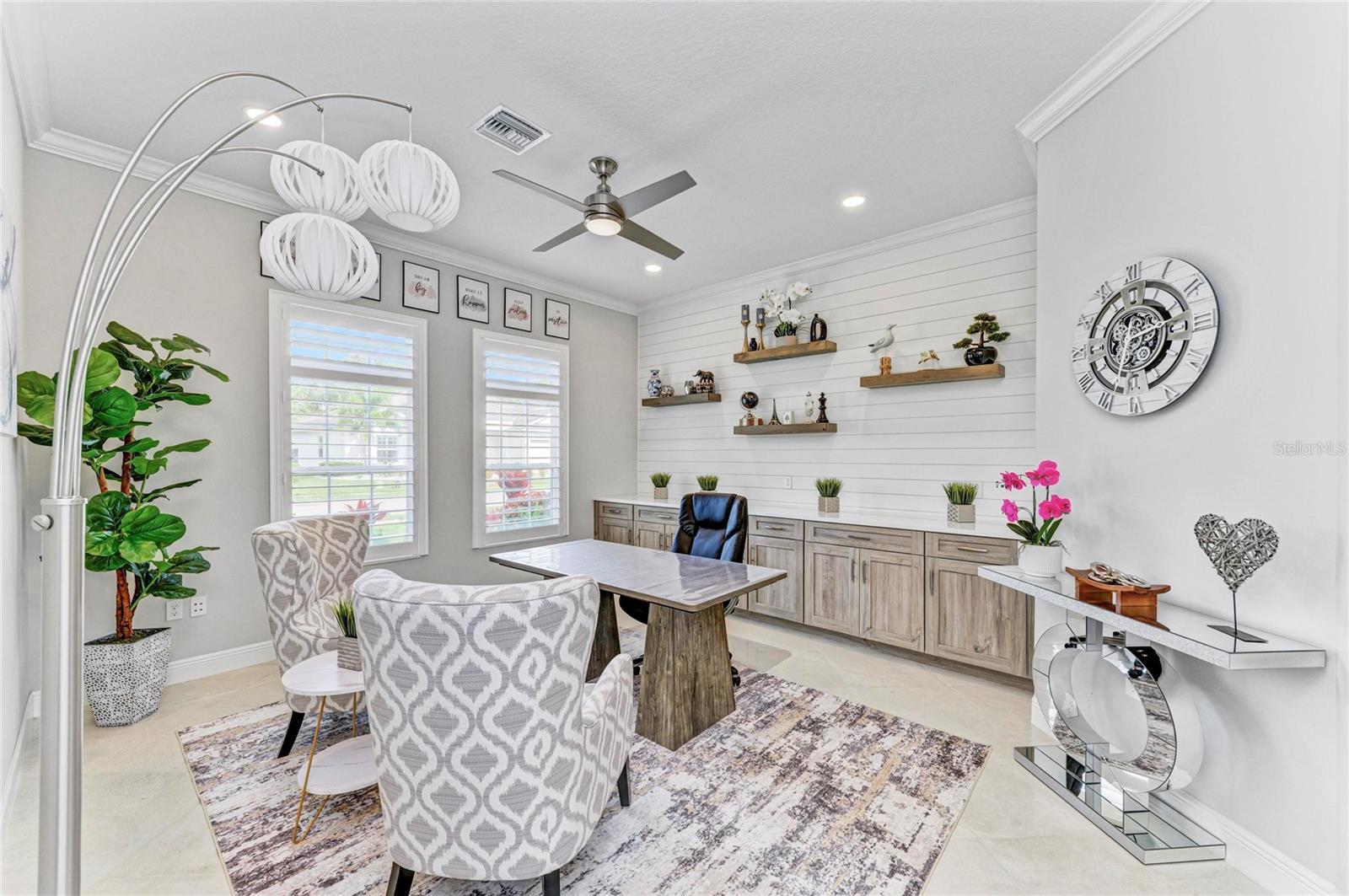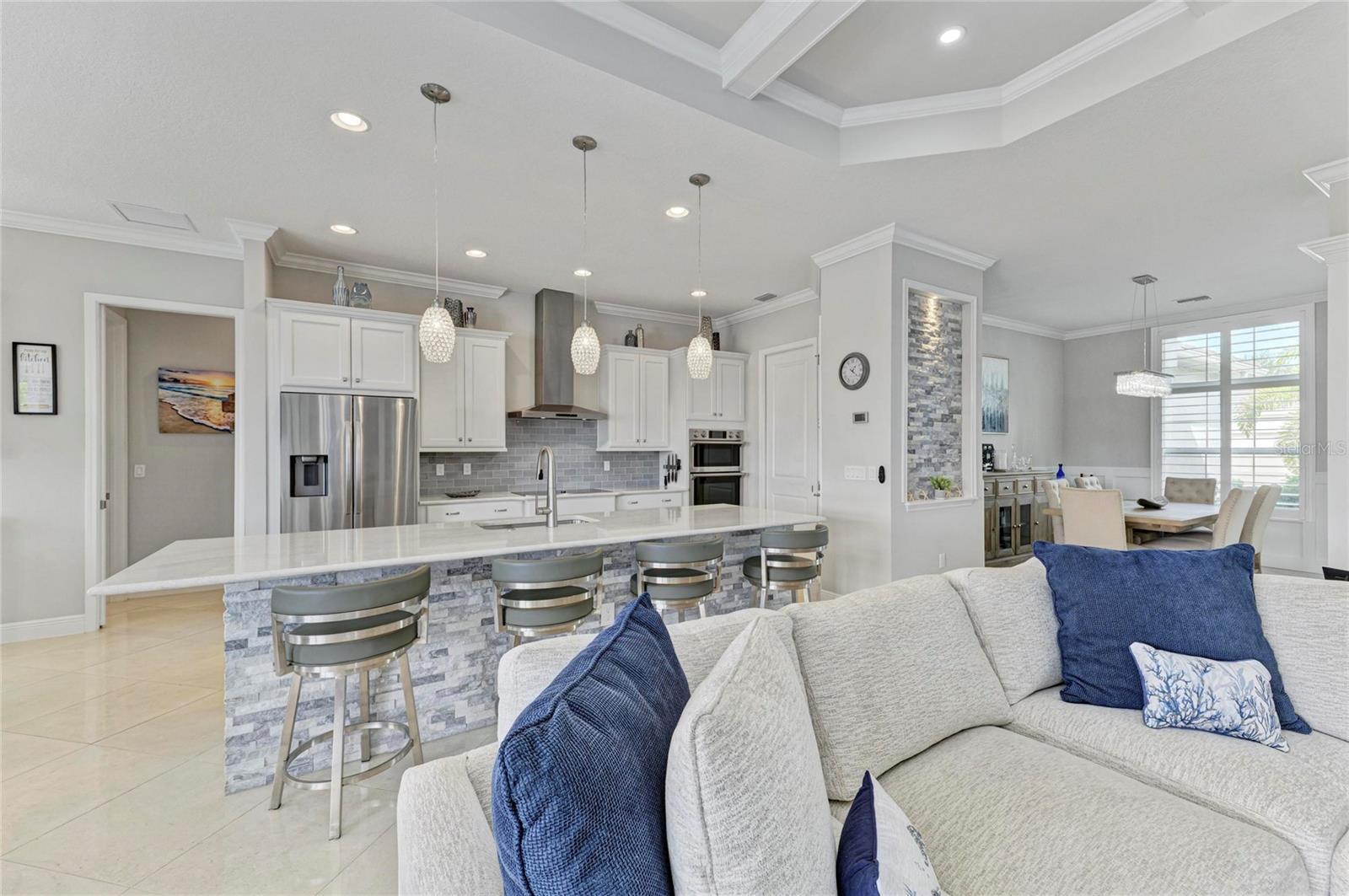 Upon entering the Gates of this Beautiful Boutique Enclave community Waverley of 110 homes you will not be disappointed! Medallion Home constructed this gated community of single-family residences, offering a selection of Luxury Homes. Located on a tranquil spacious lake lot. The Aruba open floor plan concept 3-bedroom 2 -bath plus office. Great Room highlights gorgeous ceiling details, tray with recessed lighting featuring daytime and nighttime ambiance, media wall built in with lights, electric fireplace, polished porcelain tile flooring throughout. Home has plantation shutters, a frosted front entry door along with all bedrooms, and office doors which give this home an elegant feeling! The gourmet kitchen features a quartz Island accented with stone detail, gourmet cabinets, vivid lighting, glass tile backsplash, an induction cooktop, microwave mounted on the wall, and an oven with a special insert that allows for two separate temperature zones, stainless steel appliances and a matching exhaust system complete the space, making it both functional and visually appealing. Owners Suite features custom accent wall on a diamond pattern, niche with shiplap, crown molding, custom tray ceiling with led lighting, recessed lighting, and fan, also door that leads out to lanai. Owners Bathroom features Illuminated mirrors, double vanity with quartz counter tops and floor to ceiling walk in shower. Office space seller has added shiplap wall, custom cabinets with quartz, crown molding, recessed lighting, and fan. As you step outside you have an extended lanai covered area with ceiling and wall special outdoor shiplap made for outdoors only. Lots of areas for entertaining. Outdoor day and night light that change color. Outdoor kitchen area with refrigerator, sink and grill that overlooks beautiful pool and lake. Owner had company installed a screen that is on a remote that comes down for privacy. Paver driveway leads you to the 3-car right-hand side load oversized garage. AC has 3 zones. So many upgrades to mention! Nestled in one of Sarasota’s top-rated school districts, this exclusive neighborhood combines elegance with an exceptional lifestyle including water irrigation, walking trails, and great convenience to I-75. Waverley is a short drive to Sarasota’s best beaches, Siesta Key, Lido Beach, golf courses and close to everyday shopping conveniences. No CDD and low HOA fees.