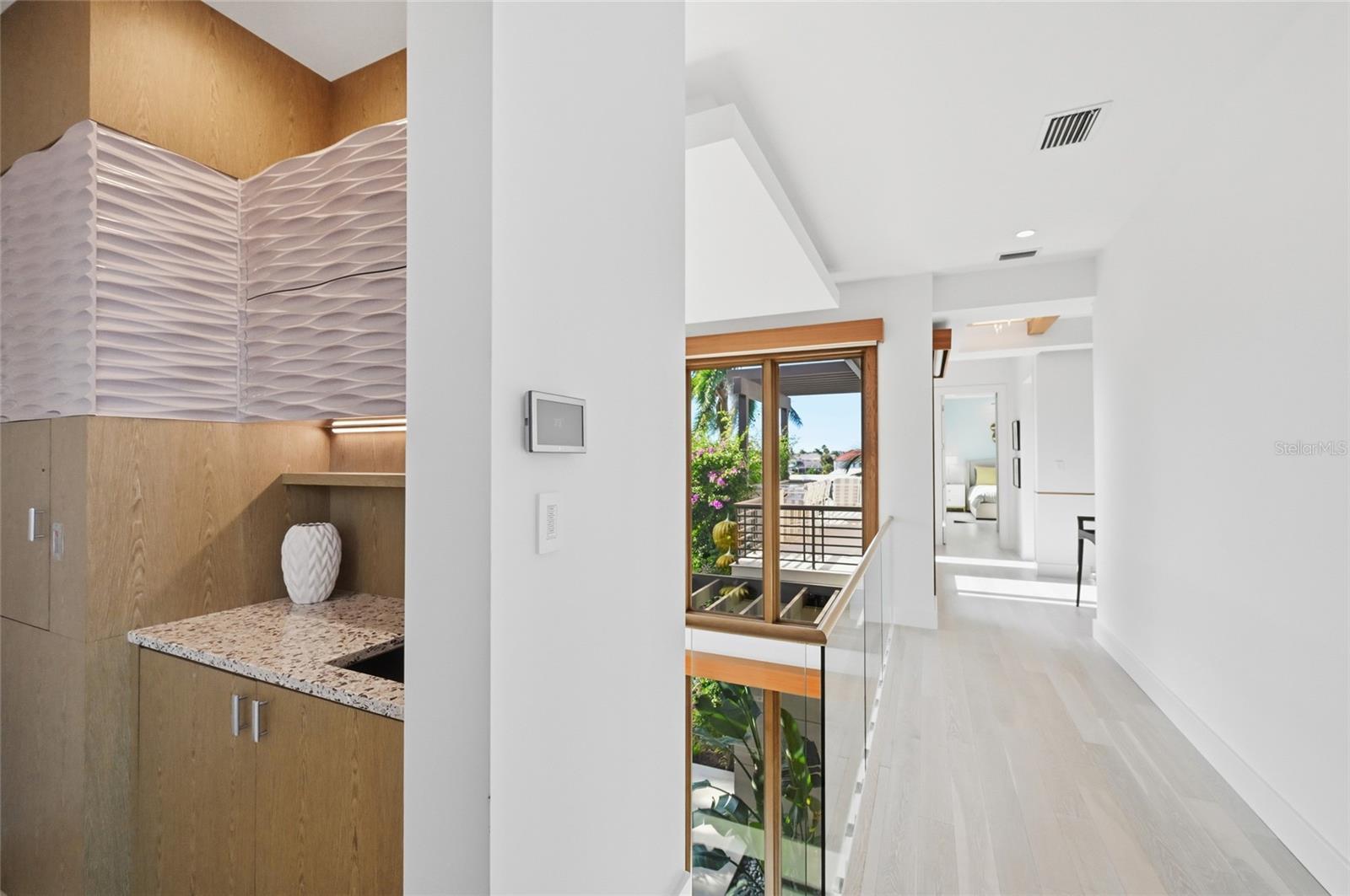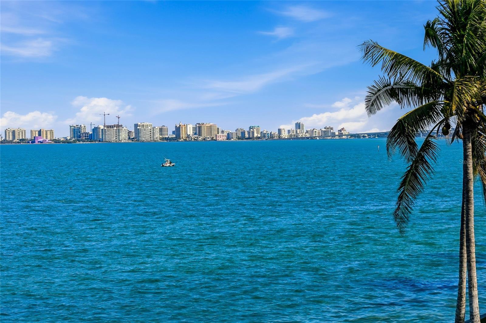 Sarasota Bay Waterfront Masterpiece – Perched on one of the most coveted point lots in Country Club Shores with Deeded Beach Access, this elevated, 2016 coastal contemporary offers 260 feet of unobstructed views across Sarasota Bay, the city skyline, and the Ringling Bridge. Designer-furnished and move-in ready, the pinnacle of waterfront luxury. Built with resilience and sophistication, the home and garage are elevated above flood impact levels and experienced no water intrusion throughout recent storm events. The property also benefits from a second, engineered seawall that strengthens the foundation and supports the outdoor terraces, offering both structural security and enduring coastal comfort. At the water’s edge, enjoy a 63’ Trex dock with a 14,000-lb lift, 3,000-lb kayak/paddleboard elevator, water and electric, and outdoor shower. A 260' vinyl seawall and breakwater, completed in 2016, ensures peace of mind and lasting stability. Inside, 4,553 sq. ft. of refined living space showcases bespoke craftsmanship and advanced technology, including a full-home Lutron system, Windoor 8100 sliders, Doors In Motion wall systems, and a comprehensive security network. Luxurious materials abound: limestone flooring on the main level, engineered white oak upstairs, cypress soffits, Level 5 drywall, and warm walnut beams. The main living area impresses with soaring 11’4” ceilings and a dramatic two-way natural gas fireplace. The dining room continues the understated luxury with walnut detailing, automated shades, and its own fireplace. The chef’s kitchen is a culinary showpiece, featuring Cristello quartz countertops, walnut veneer cabinetry, Miele appliances, induction cooktop, warming drawer, Grohe filtration, veggie sink with disposal, and a smart dumbwaiter connecting to the second floor. Outdoor living is unparalleled. A 350-sq-ft covered terrace boasts Turkish, Alexander Cream limestone flooring, Wolf grill, marble countertops, refrigeration, big-screen TV, and retractable openings for seamless indoor-outdoor entertaining. Steps away, a disappearing-edge saltwater pool with tanning shelf and sculptural planters with gas fire bowls create a breathtaking setting for relaxation or entertaining. The first-floor owner’s suite is a serene retreat with a private balcony, automated drapes, custom walnut headboard with pop-up TV, and a spa-inspired bath featuring floor-to-ceiling marble, dual sinks, heated floors and towel racks, double shower, dedicated vanity, and a walnut walk-in closet with built-in safe. Upstairs, a striking glass-and-walnut floating staircase leads to 10’ ceilings, a versatile 4th bedroom with built-in bunk beds, wet bar, refrigeration, dumbwaiter access, and two fully opening walls to covered and open-air terraces. Outdoor spaces include: East/south-facing terrace with pocketing glass doors, Pecky cypress ceilings, Infratech heaters, and sweeping skyline views. Sun terrace for relaxing or entertaining. West-facing sunset terrace with linear entertaining bar. Two additional upper guest suites offer full bay views, terrace access, and en-suite baths finished in marble, porcelain, and terrazzo-inspired materials. Additional luxury features include a dedicated laundry room, powder room, 2-car garage with golf cart charging, epoxy flooring, built-ins, and a natural-gas generator supporting 400-amp service. This is a rare convergence of architectural brilliance delivering Sarasota living at its most elevated and effortless.