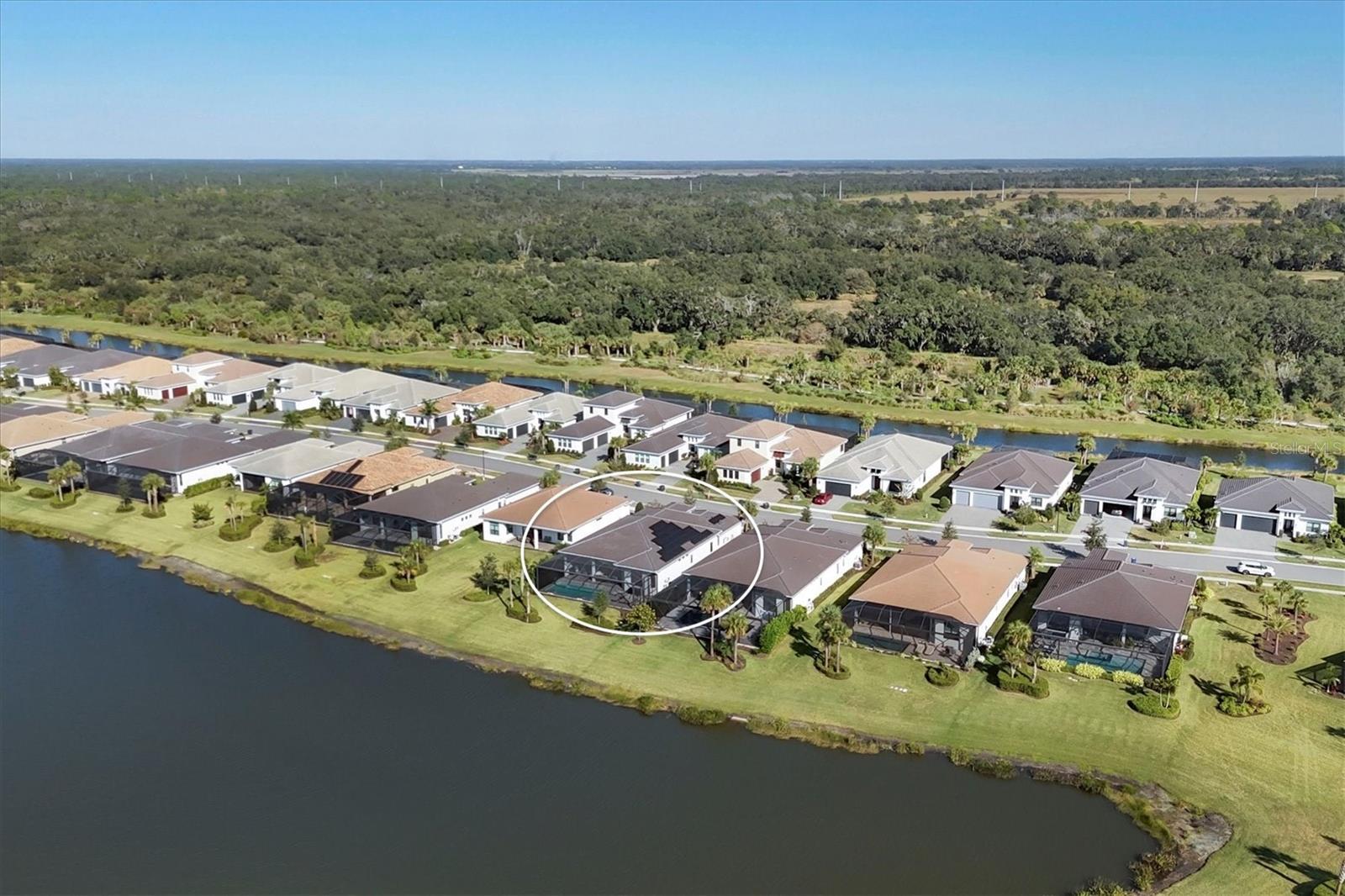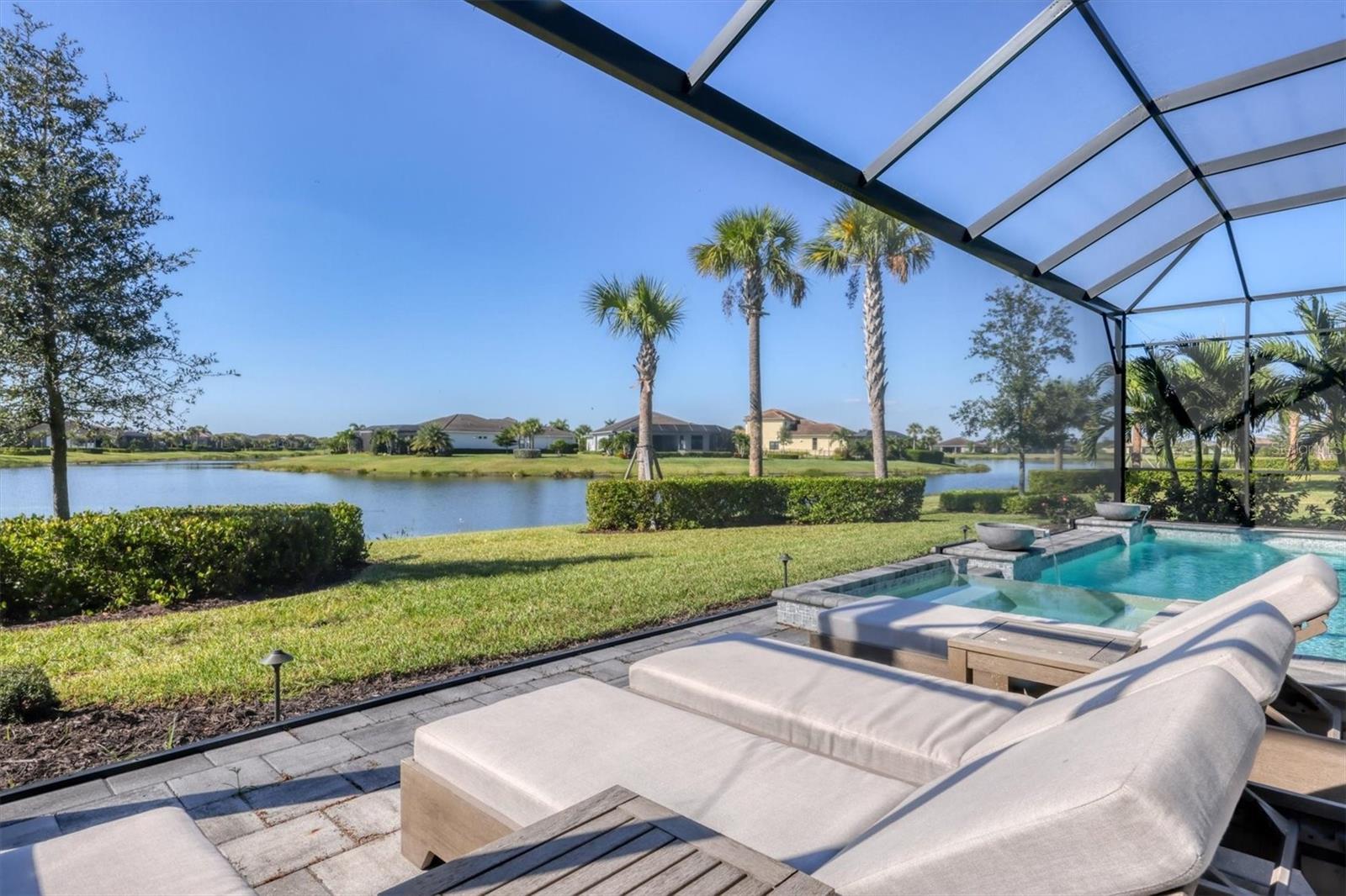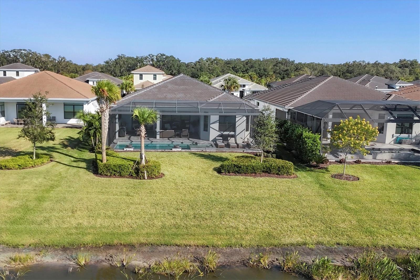 Welcome to 9088 Bernini Place a move-in-ready, open-concept home that truly has it all, offering three bedrooms, a den/office, three full bathrooms, and a heated pool/spa with tranquil water views. Located in the gated Artistry community, the home was built in 2022 and comes complete with Impact Windows and Doors, a Tesla Solar System to reduce your electric costs, a Whole-House Generac Generator for peace of mind, a Panoramic Lanai Screen and Summer Kitchen for enhanced outdoor living, Built-in Speakers in the Living Room and Covered Lanai, a Water Softener, Central Vacuum, Alarm System with Cameras, and Natural Gas. As you arrive, you will notice the paver driveway/walkway leading to the covered front porch & custom-built front door. This unique one-piece door not only elevates the home’s curb appeal but also offers privacy or transparency at the click of a button. Upon entering, you are greeted by Luxury Vinyl Flooring that runs throughout the home, with tile in the bathrooms. A tray ceiling in the foyer and crown molding throughout the main living areas and primary bedroom add a touch of elegance. Recessed lighting is found in every area of the home, providing ample lighting in addition to designer-selected light fixtures throughout, with large windows and exterior doors inviting plenty of natural light inside. The stunning kitchen features an expansive waterfall island with quartz countertops that continue seamlessly into the backsplash. An abundance of soft-close cabinetry in two-tone colors ensures ample storage with thoughtful design touches, complemented by over-cabinet and under-cabinet lighting. For the chef in the home, there is a built-in gas cooktop with a stainless steel hood & double ovens. All three bedrooms are thoughtfully separated for privacy, each appointed with designer ceiling fans. The spacious primary suite includes a tray ceiling, bay windows, motorize blinds, a luxurious bathroom featuring floor-to-ceiling tile, a free-standing soaking tub, and a walk-in shower. A lengthy quartz vanity incorporates a dressing table between the two sinks, and a large walk-in closet completes the suite. The two additional bathrooms (one an ensuite) also feature quartz countertops and walk-in showers. The den/office is finished with a beautiful coffered panel accent wall with built-in shelving & storage. For added convenience, the home includes a full-size laundry room with storage cabinets, quartz countertop, and a sink. Additional storage is located near the entry to the two-car garage. A true highlight of this home is the spacious paved outdoor living area, offering both covered and open sun-exposed spaces within the screened lanai overlooking a peaceful water view. This is where you’ll find yourself enjoying the Florida lifestyle, whether preparing dinner at the outdoor kitchen, dining al fresco, watching the big sports game, entertaining family and friends, lounging in the sun, cooling off in the pool, relaxing in the spa, or enjoying your morning coffee while watching the birds. The HOA fee of $1,315 quarterly covers exterior landscaping & mulching. Residents also have access to a resort-style pool, fully equipped fitness center, yoga studio, clubroom, pickleball/basketball court, playground, and a scenic walking trail. NO CDD FEE. Grocery stores, retail options, and I-75 are minutes away, with Downtown Sarasota, Gulf Beaches, UTC Mall, numerous Golf Courses, and Parks all a short drive away.