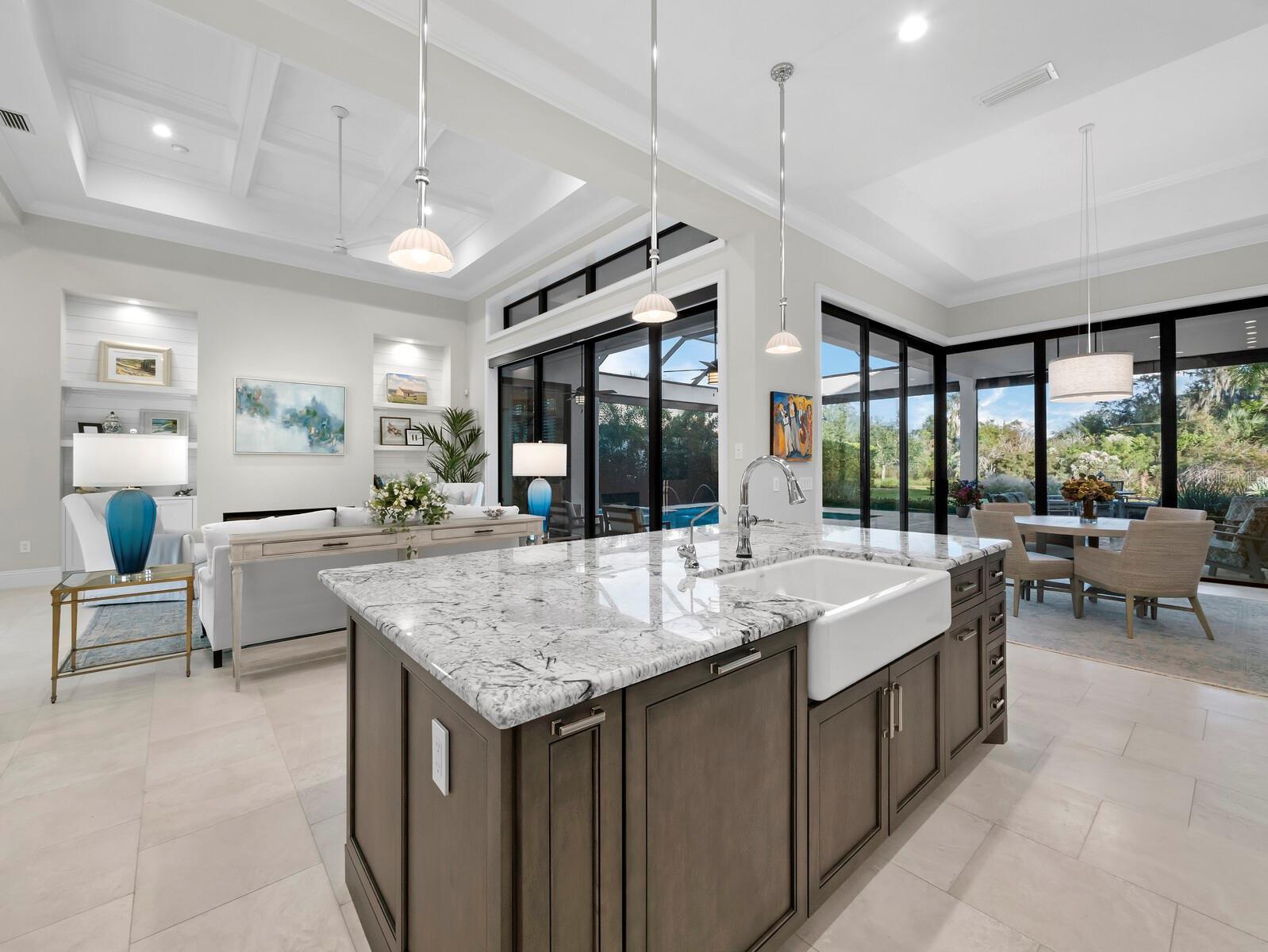 Situated on a beautifully landscaped half acre with preserve views in the award-winning Founders Club golf community, this stately coastal home boasts abundant space and luxurious features that include exquisite design enhancements as well as functional upgrades. Built in 2019, the home blends modern scale and style with classical elements of West Indies architecture for an ideal balance of comfort and elegance. Within the last year, significant improvements to the already impressive interior include complete repainting, new light fixtures and fans throughout, new solar shades in the primary suite and living room, new carpet in guest rooms, and fabulous wallcoverings by Phillip Jeffries and Scalamandre in numerous spaces. Creating the immediate impression of an island estate, oversized double doors lead from the paver courtyard to an airy foyer and great room that features a soaring, 16’ coffered ceiling and seamless access through full-height glass sliders to the elegant covered lanai beyond. Designed for an idyllic indoor-outdoor lifestyle and entertaining convenience, walls of glass open the home easily to more than 1,100 square feet of fully screened exterior living space that surrounds the heated pool and spa with distinctive spaces to lounge and dine. Inside, more than 3,400 A/C square feet of interior living space comprise three bedrooms, three and a half bathrooms, a private office, a roomy separate den that opens directly to the covered terrace, and a gourmet kitchen with an oversized island and counter seating, topline appliances, and a walk-in pantry. The kitchen, overlooking the great room and with beautiful sight lines to the scenic preserve, features double wall ovens, a gas range with pot filler and bespoke wood-clad vent hood, farmhouse-style porcelain sink, and granite counters. A spacious dining area alongside the kitchen flows to the family room and enjoys open access to the lanai and outdoor kitchen, fully appointed for ultimate convenience with a sink, beverage refrigerator, gas grill and hood. Situated on the other side of the home from the guest quarters, the owners’ suite is a roomy retreat that enjoys its own private access to the lanai and picture-perfect natural vistas, with two walk-in closets and a resort-style bathroom that includes a separate water closet, dual vanities, a free-standing soaker tub and an enormous walk-in shower outfitted with two shower heads and an integrated bench. Throughout the home, an open concept and oversized windows welcoming natural light underscore coastal comfort, with details like crown molding, custom millwork, tray ceilings, and travertine floors cuing luxury sophistication. New shutters outside, a whole-house generator, reverse osmosis and water filtration, and impact windows add further value. The pristine 3-car garage is climate controlled and equipped with custom Closet Tec cabinetry that is also installed in the adjacent storage room. Located within an easy drive of Downtown Sarasota and the cultural appeal of the city and keys, the Founders Club is renowned for its beauty and amenities, including a 24-hour guarded gate, gorgeous tropical landscaping, Har-tru tennis courts, additional racquet and sports courts, and more. Optional membership in the golf club adds access to a clubhouse with full-service dining and state-of-the-art fitness facilities and an 18-hole championship course.
