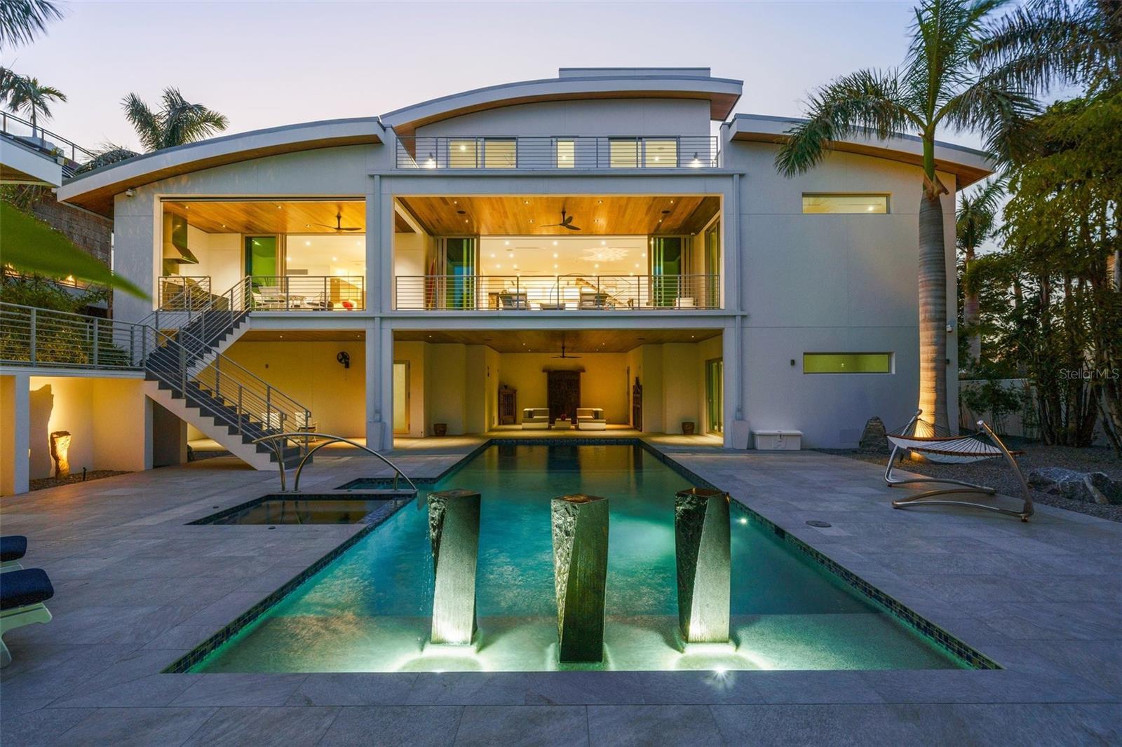 Located within highly desirable Harbor Acres—Sarasota’s premier neighborhood—this masterful three-story contemporary residence, designed by renowned architect Mark Sultana of DSDG Associates, stands as a testament to uncompromising vision and peerless craftsmanship. From the hand-selected hardware to the custom Italian floating staircase that appears to defy gravity, every detail has been curated with deliberate intention, resulting in a living experience that elevates luxury to an art form. Flooded with natural light and framed by soaring ceilings and expansive walls of glass, the interiors unfold with effortless grace and architectural precision. The heart of the main living area is an open-concept great room, anchored by a chef’s kitchen of exceptional caliber. A suite of Miele appliances—including a built-in espresso maker, induction cooktop, warming drawers, dual microwaves, and a full-height wine tower—pair beautifully with sleek Dekton countertops and custom Westwood cabinetry. A hidden butler’s pantry with Sub-Zero refrigeration ensures effortless hosting. The adjacent dining and lounge areas extend naturally to the expansive covered balcony, which overlooks the serene pool and private backyard and features a summer kitchen with built-in grill and a thermally modified wood ceiling designed for year-round outdoor living. The main level’s north wing is reserved for the dual-owner’s suite, boasting two private retreats (one currently serving as a refined home office) connected by an indulgent spa bath with floating vanities, dual rain showers, a sculptural soaking tub, heated towel racks, and elegant Italian Presotto custom walk-in closets. The third level has a library/media room that can easily transition into a two-room guest suite via sliding doors, and an additional bedroom suite. Two full baths support this level, ensuring comfort and privacy for guests. Other features include a high-end audio-visual system with hard wired speakers throughout, custom Crestron blinds and internal/external lights with remote control access through both phone and iPad. Five Luma exterior cameras are hard wired with remote access, real time monitoring and recording. Outside, the backyard beckons as a tranquil oasis with a sleek heated pool and spa and a covered seating area surrounded by lush bamboo for privacy. A standalone guest house—complete with a full bath, coffee bar, and mini-fridge—offers visitors independence while remaining closely connected to the main residence. Crowning the home, the rooftop terrace provides panoramic 180 degree views spanning Sarasota Bay, the Ringling Bridge, Longboat Key, Siesta Key, and downtown Sarasota—an ideal spot for evening gatherings, sunset views, or quiet reflection. For the automobile enthusiast, two climate-controlled garages with epoxy flooring and commercial-grade doors accommodate up to six vehicles, along with generous storage and a dedicated gym opening onto the pool terrace. Every facet of this home’s design, execution, and livability transcends the expected, delivering a residence that is as visually stunning as it is intuitively functional—a modern masterpiece just minutes from downtown Sarasota’s vibrant Bayfront, yet serenely tucked away in its own private enclave of refined coastal elegance.