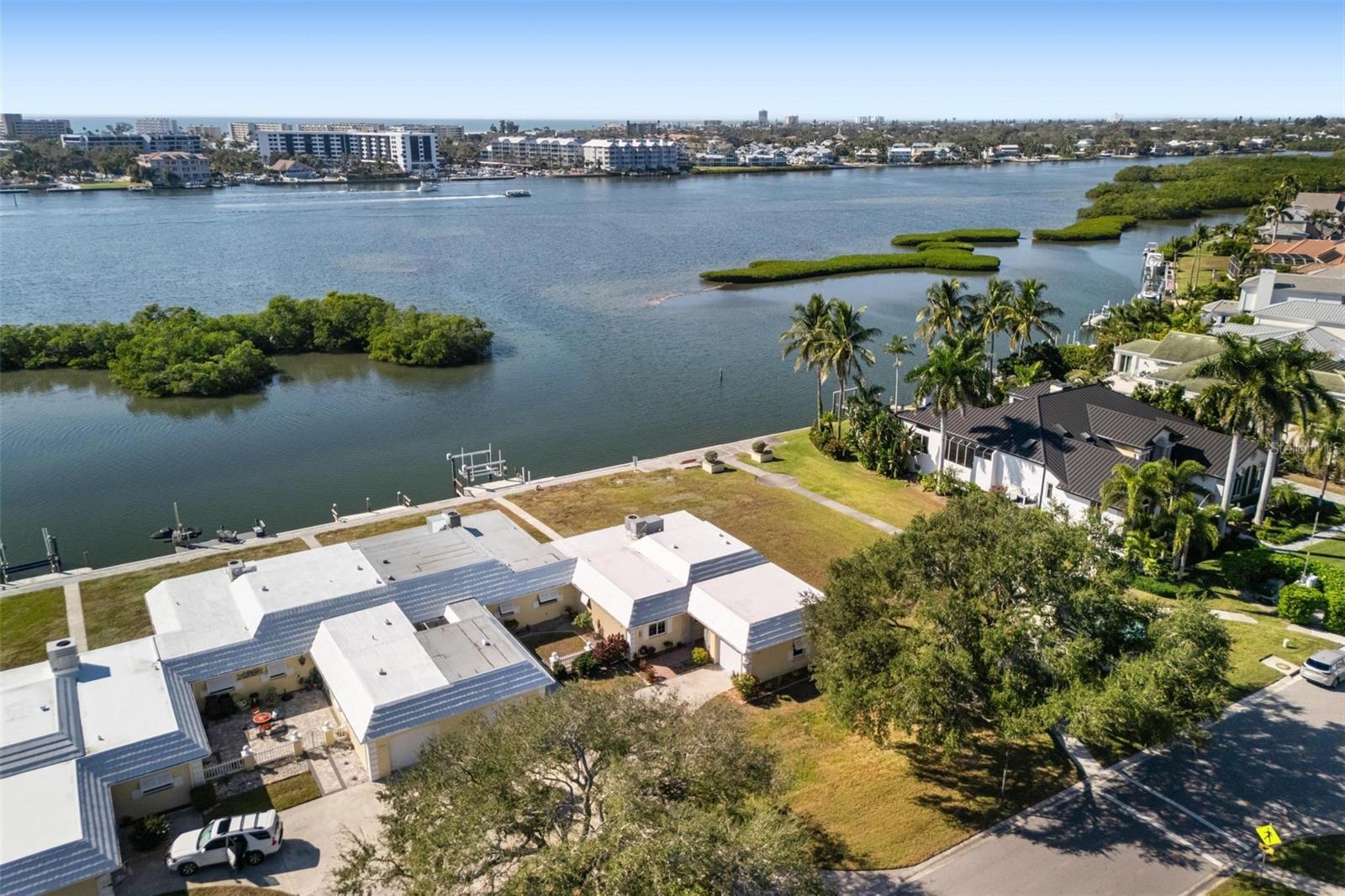 This spectacular end-unit waterfront villa offers the ultimate in Florida coastal living, complete with deep-water access to the Intracoastal Waterway and Sarasota Bay. A truly rare opportunity, the property includes a private boat slip equipped with an IMM Quality Boat Lift (10,000 lbs), capable of accommodating a large boat for boaters seeking effortless backyard access to open water. Remodeled from top to bottom in 2025, this light and bright maintenance-free villa feels entirely brand new. As you enter through the front door, you are immediately welcomed by sweeping open-water views and preserved sunset vistas that create a serene and unforgettable backdrop for daily living. Situated on an end lot with an open park-like green space along the north side, the home offers exceptional privacy and an expanded sense of openness. Frequent dolphin and manatee sightings paired with vibrant sunsets make this setting truly special. Inside, the home features a beautifully designed split-bedroom layout, with the master suite on its own wing for enhanced privacy and the guest bedroom positioned at the front of the home, ideal for hosting family and friends while maintaining comfortable separation. The entire interior is finished with luxury vinyl flooring, providing durability, modern style, and a seamless unified look. The chef’s kitchen serves as the heart of the home, showcasing high-end GE stainless steel appliances, Brazilian marble countertops, a farmhouse sink, grey wood cabinetry, a spacious center island, and an oversized walk-in pantry. And a built-in beverage cooler between the lower cabinets, further enhancing the kitchen’s functionality and appeal. Thoughtful upgrades throughout the home add both comfort and sophistication. Step outside to your private slip and heavy-duty lift, offering an exceptional setup for larger boats and providing quick, easy access to fishing, cruising, and the Gulf of Mexico. For avid boaters, this location is truly unmatched. Bay Colony Villas is a warm and active community featuring a newly remodeled 1,800 square foot clubhouse with a full kitchen, game room, billiards room, and a heated swimming pool all just steps from your front door. Monthly condo fees include exterior maintenance, exterior hazard insurance, water, lawn care and full use of community amenities. Perfectly positioned near shopping, dining, Downtown Sarasota, and world-famous Siesta Key Beach, this villa combines exceptional convenience with the best of coastal living. With preserved sunset views, modern upgrades, deep-water boating access, and a private slip with a high-capacity boat lift, this one-of-a-kind home is ready for its next owner to experience the Florida waterfront lifestyle at its finest.