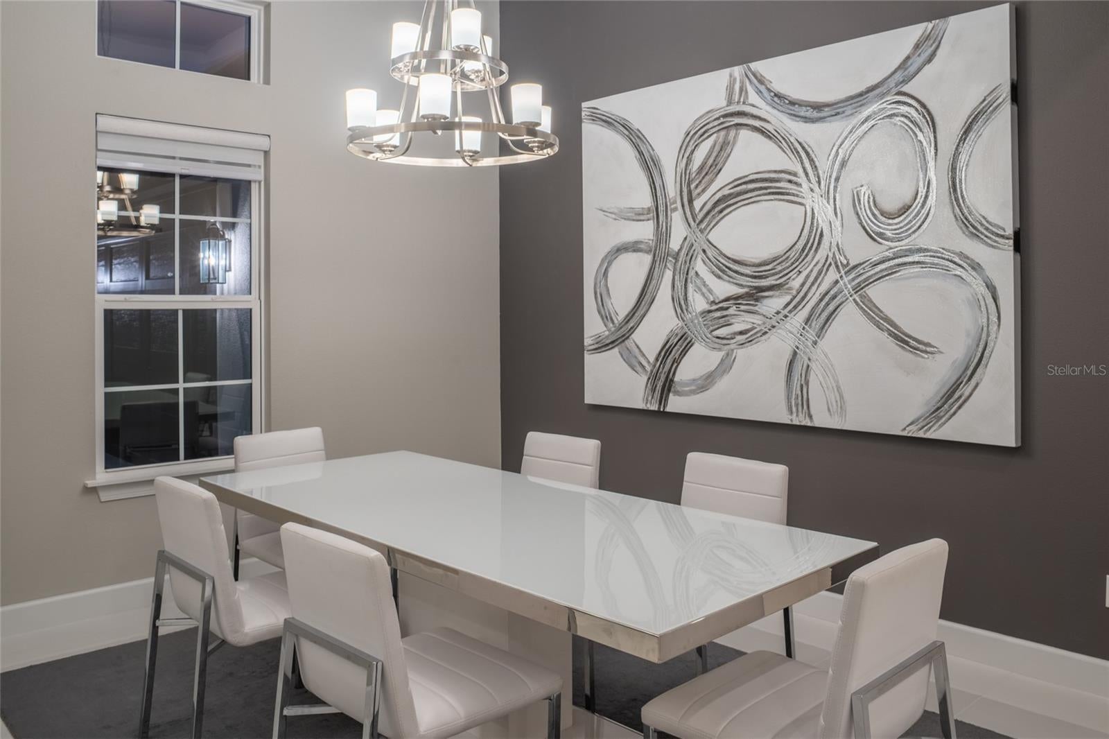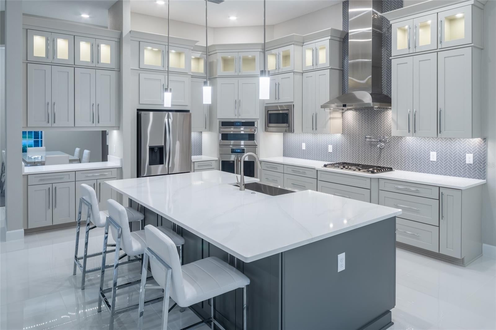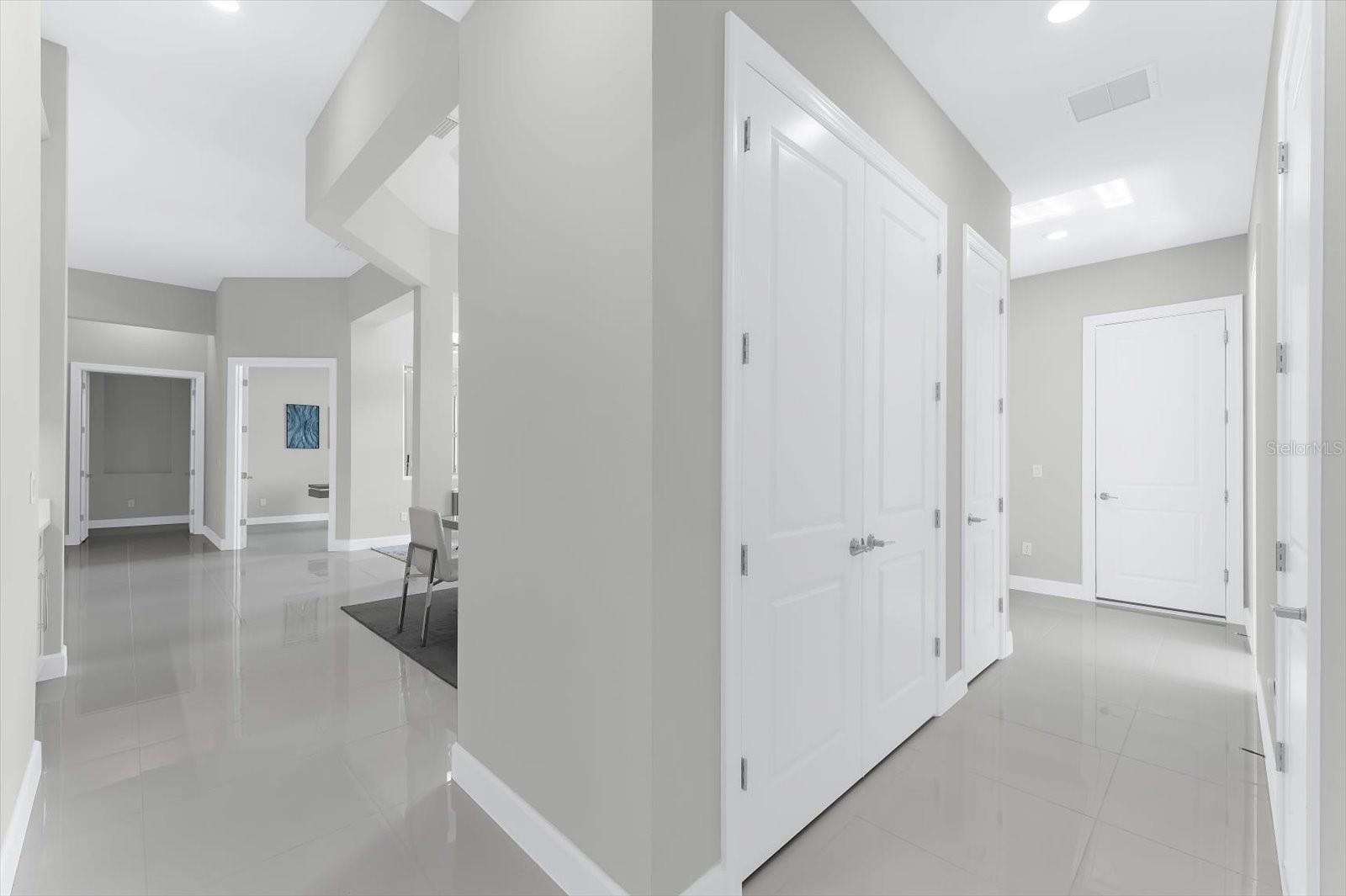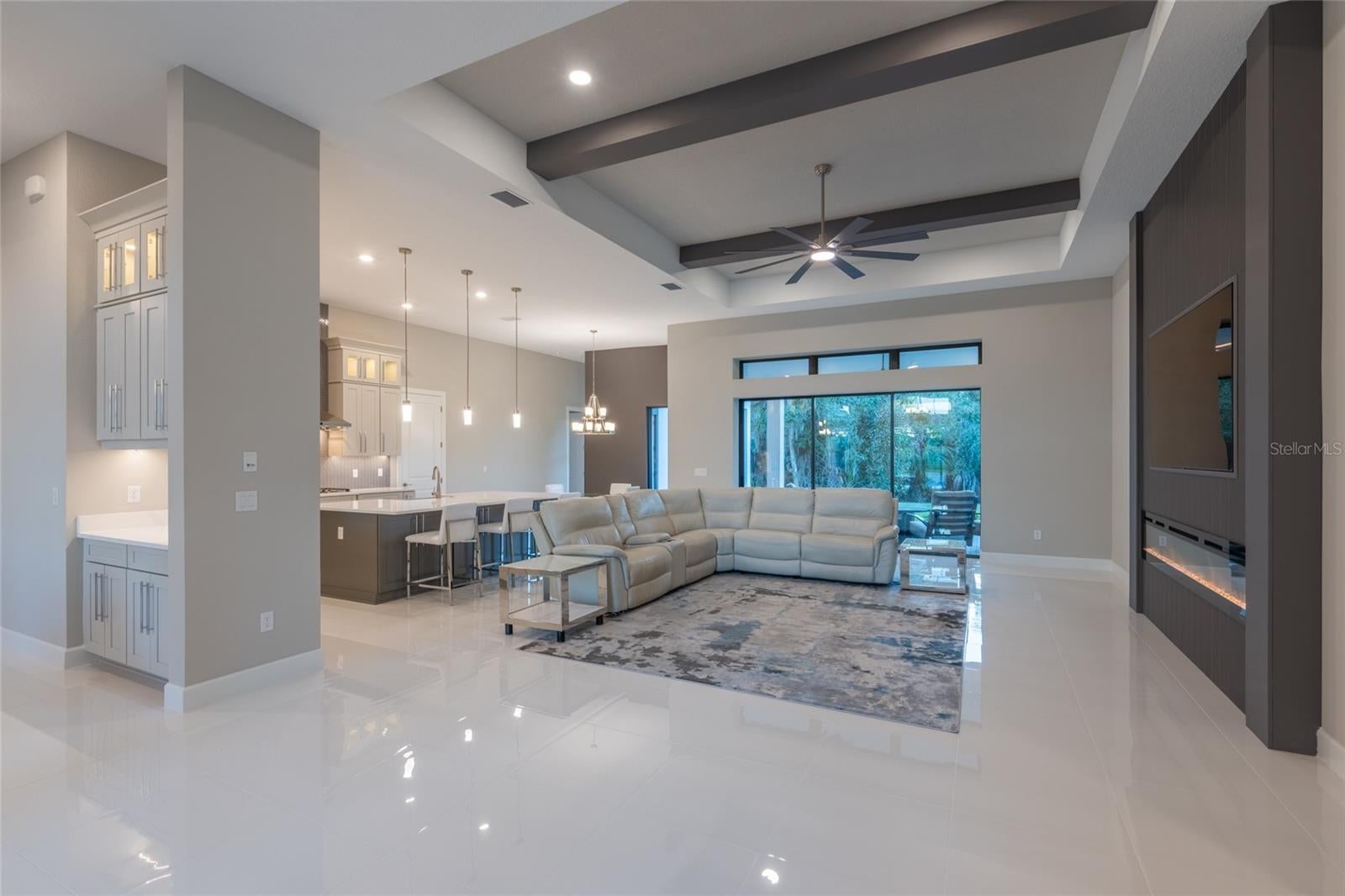 The West Indies Beacon floor plan in Cassia at Skye Ranch greets you with a bright open foyer that immediately sets the tone for this executive home. Elegant 13 foot soaring tray ceilings carry through the main living areas and create a feeling of space, sophistication, and natural light. The formal dining room sits just off the entry and flows naturally into the gathering room, where a custom designer feature wall with an electric fireplace adds a calming focal point. Large pocket sliding glass doors frame views of the expansive covered lanai and the private nature preserve beyond, offering access to over twenty five miles of walking trails and creating a setting that feels quiet, serene, and beautifully connected to nature. The kitchen is a true showpiece with Harbor solid wood cabinetry, soft-close doors, stacked glass cabinets above with gentle accent lighting, and a large Boulder toned quartz island that brings the entire space together. Under cabinet lighting, a Cafe gas appliance package, monogram vent hood, an over-range fill faucet, and thoughtful layout create a chef level workspace that is both inviting and functional. An illuminated custom built-in cabinet with a wide pass-through sits between the dining room and kitchen and adds both beauty and convenience to the flow of the home. The breakfast nook enjoys serene backyard views, and the elegant porcelain flooring enhances the clean modern style of the home. Just off the kitchen and laundry area, a thoughtfully designed built-in drop zone features upper cabinetry and bench seating creating an ideal everyday landing space for organization and ease. Eight foot solid core doors elevate every room. The primary suite is tucked away for comfort and privacy. Pocket doors lead to two walk-in closets, and the spa inspired bath features double sinks, a frameless glass shower, and a handheld shower on a slide bar. Each guest bedroom includes its own private en suite, and a separate half bath is ideal for visitors. The study sits at the front of the home behind refined 12 panel glass French doors and offers a quiet retreat with natural light throughout the day. Outdoor living shines with a large covered extended lanai that is professionally prepared for a future outdoor kitchen. The home is also designed with utilities in place for a future pool and spa. Additional upgrades include core filled block insulation, tankless hot water heater, seamless gutters along the rear and side of the home, and an extended paver driveway, an insulated three car garage with keyless entry pad, attic stairs, and a side entry door. Living in Skye Ranch offers a true sense of community with The Hub featuring a resort style pool, junior Olympic lap pool, splash pad, fitness center, movement studio, indoor and outdoor courts, playgrounds, open fields, and miles of nature trails that wind through preserved Florida landscape. The neighborhood also includes a brand new elementary school, Turner Park, and wide walkable streets. Cassia provides easy access to I 75 and is positioned just minutes from the dining, shopping, and cultural experiences of Sarasota. Residents also enjoy a direct connection to Siesta Key making this location ideal for anyone who wants both everyday convenience and the best of coastal living. The setting and natural light blend elegance, exceptional upgrades, and a peaceful preserve setting in one of Sarasota’s most desirable communities. Walk to the New Skye Ranch elementary school!