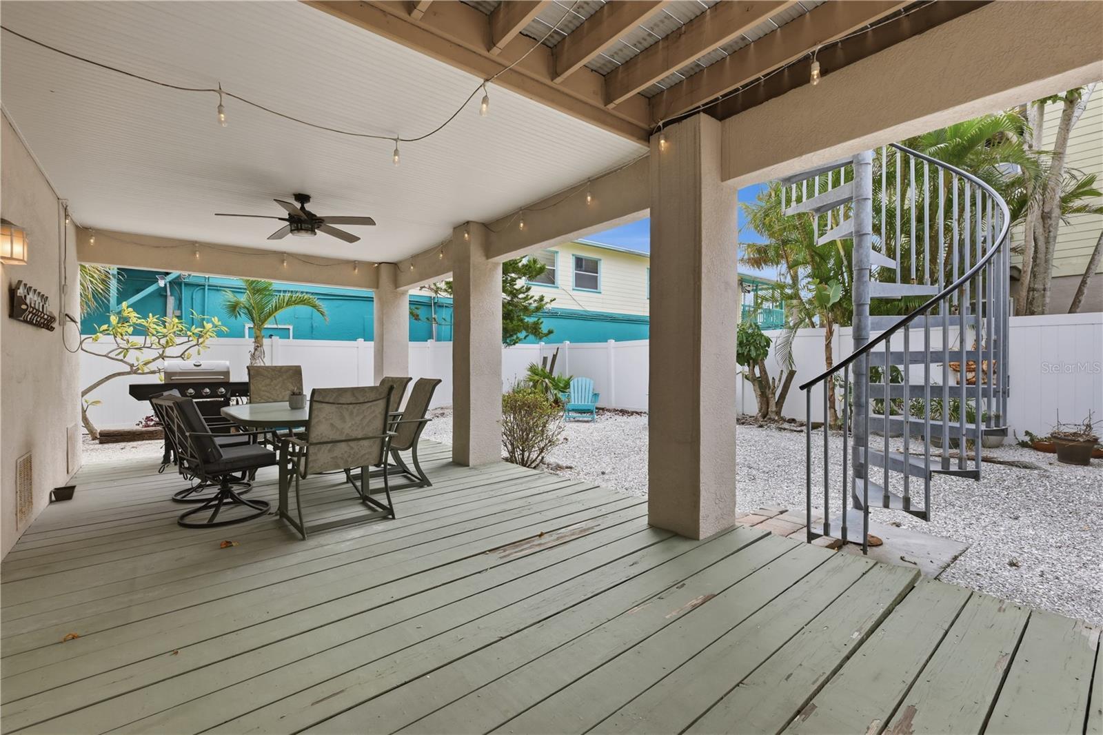 Just steps from the sugar white sands of the Gulf, this elevated coastal retreat captures the essence of relaxed beachside living with the comfort of thoughtful design. Bright, airy interiors welcome you with an open concept layout where the living area flows seamlessly into a charming kitchen featuring stainless steel appliances, beadboard cabinetry, and soft coastal hues that mirror the shoreline just beyond. The star of the home is the massive primary suite, perched privately on the top level with soaring ceilings, generous space for lounging or a reading nook, and an ensuite bath with a soaking tub and a walk-in shower. A second bedroom and a flexible den or office add versatility to the layout, easily adapting to your lifestyle needs. Step outside to a breezy balcony nestled among swaying palms, perfect for morning coffee or winding down after a day at the beach. Two separate private patios extend your outdoor living options, while generous parking and a three-story elevation maximize functionality and comfort. A private backyard offers even more space to relax or entertain in a tranquil setting. Recent updates include a brand new HVAC system and a roof replacement in 2021, adding long-term value and peace of mind. Low maintenance tropical landscaping sets the tone for effortless island living, and the oversized garage offers ample room for all your beach gear. Just steps away, you'll find local dining, charming shops, and a convenient trolley stop right at the house, making it easy to explore everything the island has to offer. Located in a weekly rental zone, this home presents excellent income potential alongside its inviting coastal charm. Whether you're seeking a full time residence, winter escape, or a dreamy vacation rental, this home delivers endless potential in an unbeatable location.