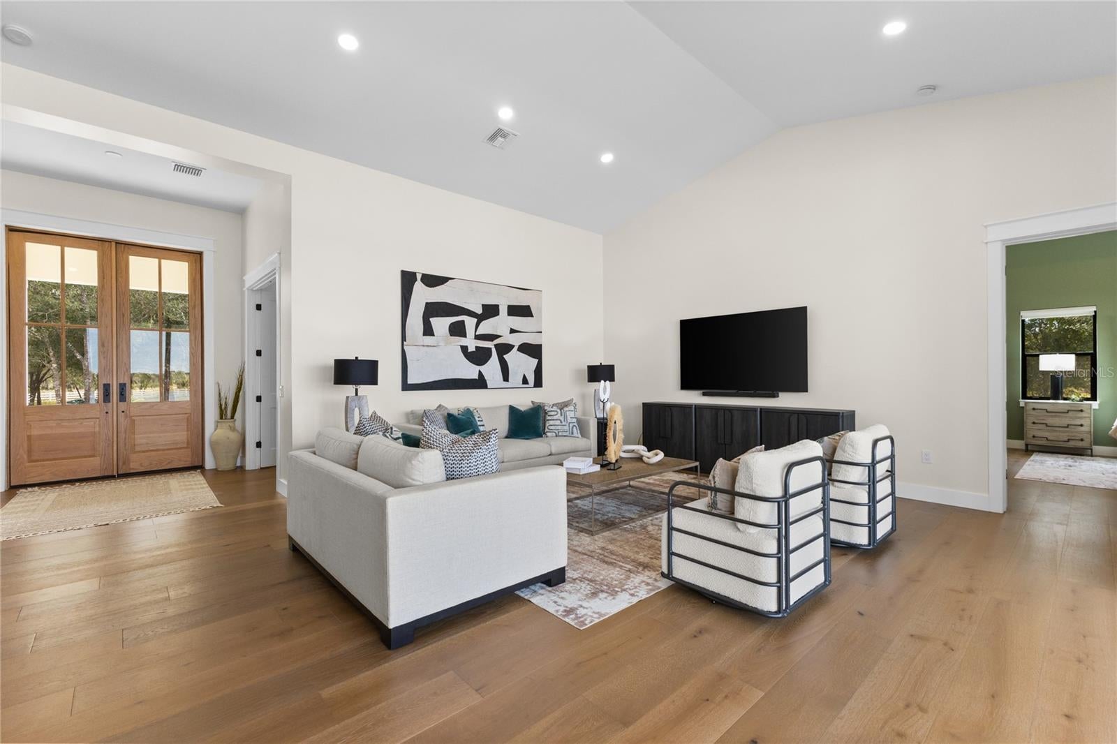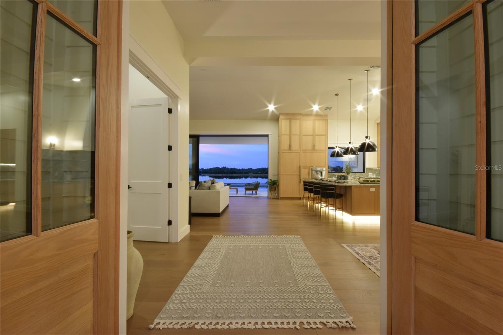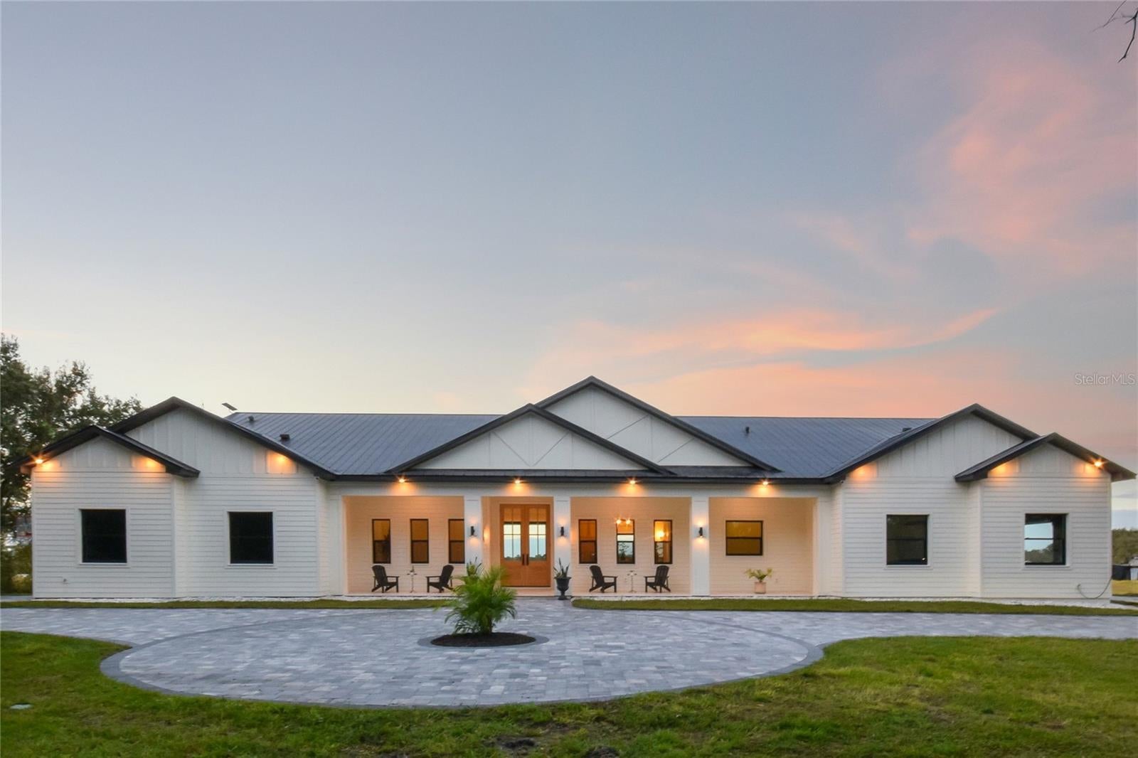 Welcome to an extraordinary 2025 luxury modern farmhouse estate, offering 3,591 square feet of refined heated living space and 5,595 total square feet of thoughtfully crafted design. Set on an expansive, seaplane-friendly lakefront property, this residence blends modern elegance with timeless farmhouse character to create a lifestyle of comfort, sophistication, and privacy. A striking aluminum roof and an impressive 50-foot covered front porch set the tone upon arrival. Inside, soaring 12-foot ceilings and a dramatic 14-foot cathedral ceiling over the living room and kitchen create an expansive, light-filled atmosphere. Custom hardwood floors, premium stone selections, and meticulous craftsmanship elevate every inch of the interior. The chef’s kitchen is a true centerpiece of the home, curated for both beauty and performance. It features premium appliances, including a 48-inch gas range with hood and pot filler, a Sub-Zero refrigerator and freezer, and a dedicated hot beverage station. Solid wood cabinetry is enhanced with soft LED accent lighting at the kick plates and beneath the upper cabinets, adding a warm and luxurious glow. A spacious walk-through pantry with its own sink provides added convenience and exceptional functionality. The estate offers four well-appointed bedrooms, five full baths, a private study or den, and a large bonus/play area ideally situated near the secondary bedrooms—perfect for families or guests. A multi-zoned air-conditioning system ensures personalized comfort throughout the home. The primary bedroom retreat is a sanctuary of style and serenity, featuring an ensuite adorned with expansive stonework, a built-in makeup vanity, and a standalone soaking tub positioned to overlook the surrounding woods. An expansive walk-in closet completes this luxurious space. The outdoor living experience is truly exceptional. A stunning lanai features a real wood-burning fireplace and overlooks a fully automated heated pool and spa. Beyond the pool lies approximately 500 feet of deeded water frontage along a breathtaking, considerably deep 48-acre lake. This rare body of water is ideal not only for boating, jet skis, and fishing but is also perfectly suited for seaplane access. You can build your own private dock and enjoy the unparalleled beauty and freedom of true lakefront living. The estate includes two separate garages: a traditional two-car garage and an oversized one-car garage ideal for storing tools, machinery, or ATV’s to run the property with. Horses are welcome, offering even greater versatility and lifestyle options. A rare and unique benefit of this location is its just 14 miles to the Wauchula Municipal Airport, a low-volume airport which serves mostly the needs of private and recreational aviation. An exceptional feature for aviation enthusiasts seeking convenient, private access. Despite the tranquil setting, the home remains only 20 minutes from the Lakewood Ranch area for grocery stores, dining, and conveniences. Bradenton is roughly 35 minutes away, Sarasota approximately 40 minutes, and Anna Maria Island’s world-class Gulf beaches just 50 to 55 minutes from your doorstep.