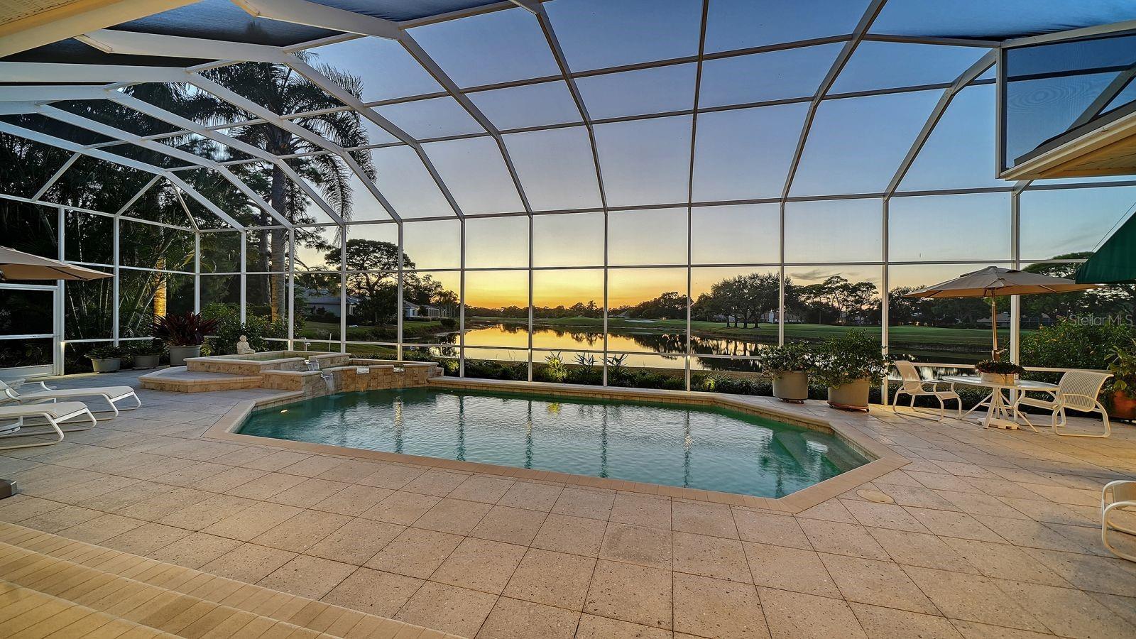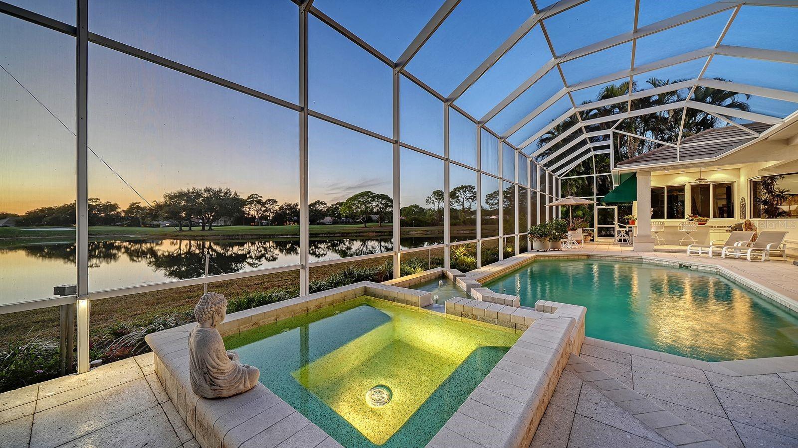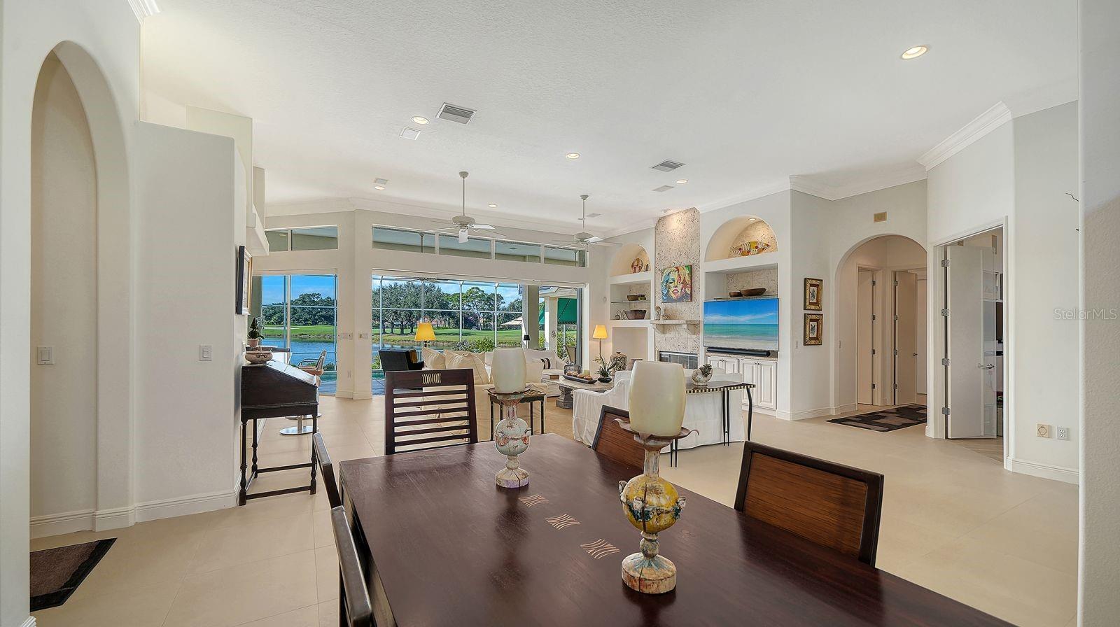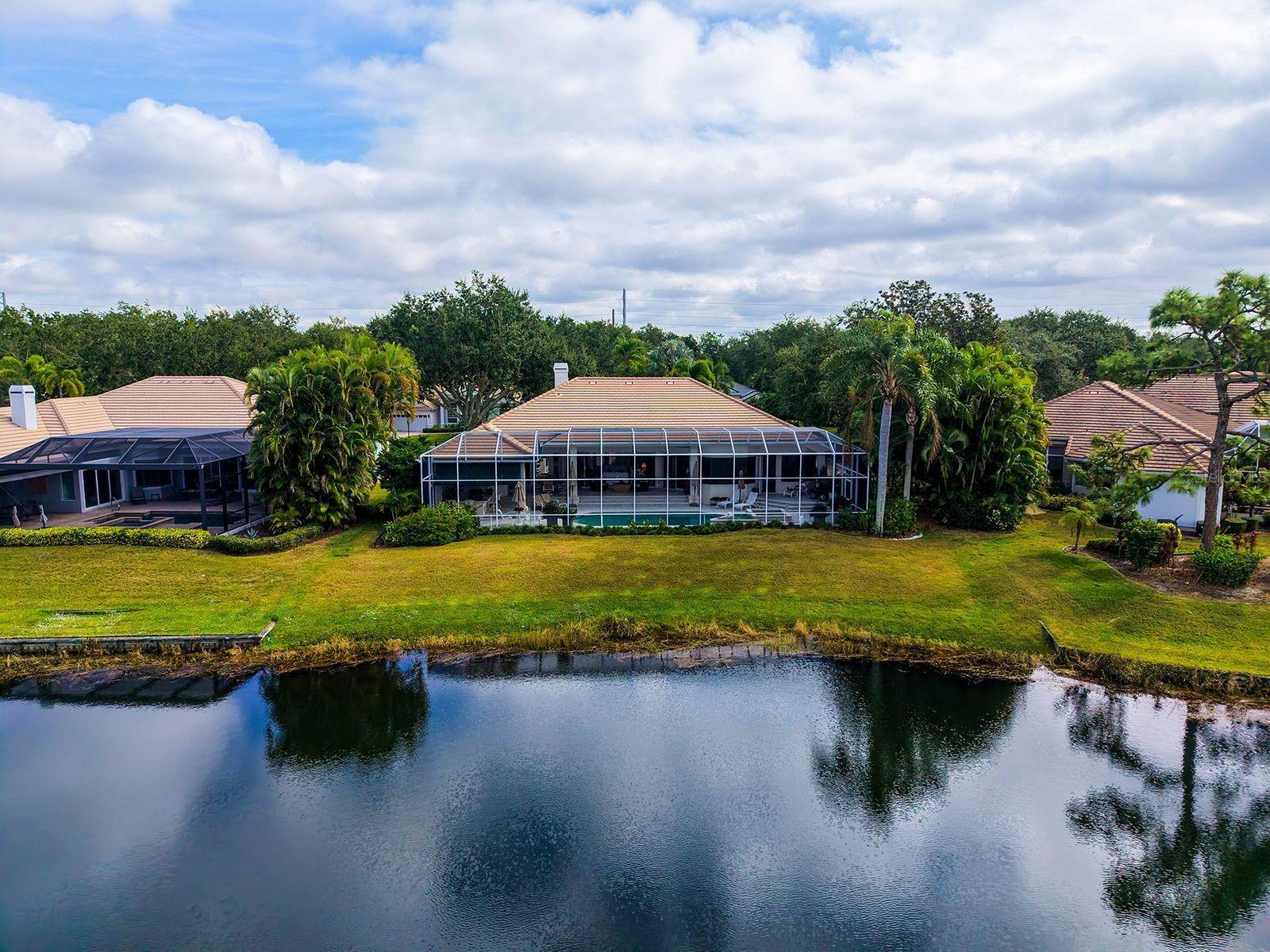This beautiful John Cannon home has arguably the best water views in the whole of University Park! Boasting 3 bedrooms, 3 baths + den, a 3-car side-return garage, and a huge pool deck, this 3,100-square-foot home is set on 0.4 acre of lushly landscaped property against a backdrop of expansive west-facing lake and golf course views. The home has been fastidiously maintained and beautifully updated. The split-bed floor one-story plan is anchored by a stunning living area with volume ceilings, a striking coral-stone fireplace surround, built-in shelving, and pocket sliders to a huge screened terrace with a sparkling pool and jaw-dropping water views. The primary suite has a large bedroom and spacious seating area overlooking the pool and lake, two walk-in closets, and a spacious bathroom with quartz cabinetry and a vanity desk. The kitchen was remodeled in 2018 with sleek granite countertops, and the appliances were all updated in the past couple of years with Thermador and Wolf fixtures. This home boasts an abundance of natural light in every room which, combined with extra features including high ceilings, a neutral palette, plantation shutters, sunshades, built-in features, and a whole-house generator, represents incredible value in a prime location behind the gates of this sought-after country club University Park Country Club is a gated, resident-owned community offering a 27-hole Ron Garl–designed golf course, eleven lighted Har-Tru tennis courts, four pickleball courts, croquet, a fitness center, and multiple on-site dining options. Miles of tree-lined streets provide opportunities for walking and biking, and a variety of social clubs and organized activities are available to residents. Located approximately four miles from downtown Sarasota, the community provides convenient access to shopping, dining, cultural venues, healthcare, and major transportation routes. University Town Center, with its wide selection of shops, restaurants, and fitness studios, is about two miles away, along with Nathan Benderson Park and nearby Mote Marine facilities. Gulf Coast beaches, SRQ airport, the Ringling Museum, boating options, and St. Armands Circle are all within an estimated 15-minute drive.