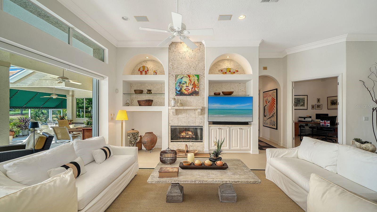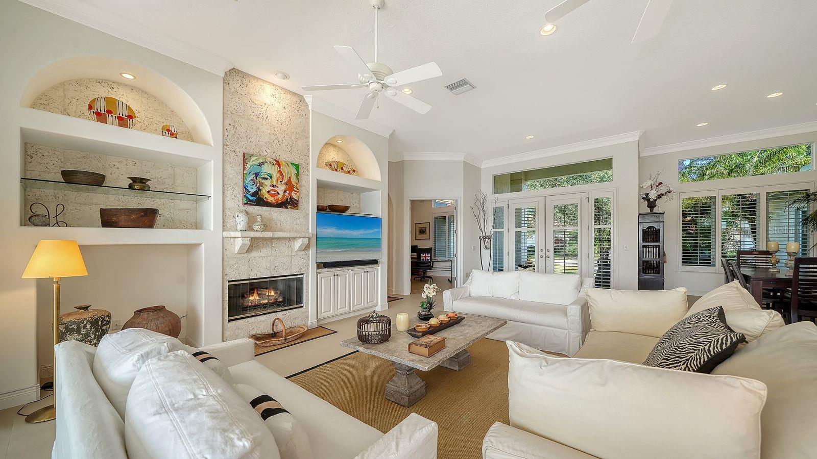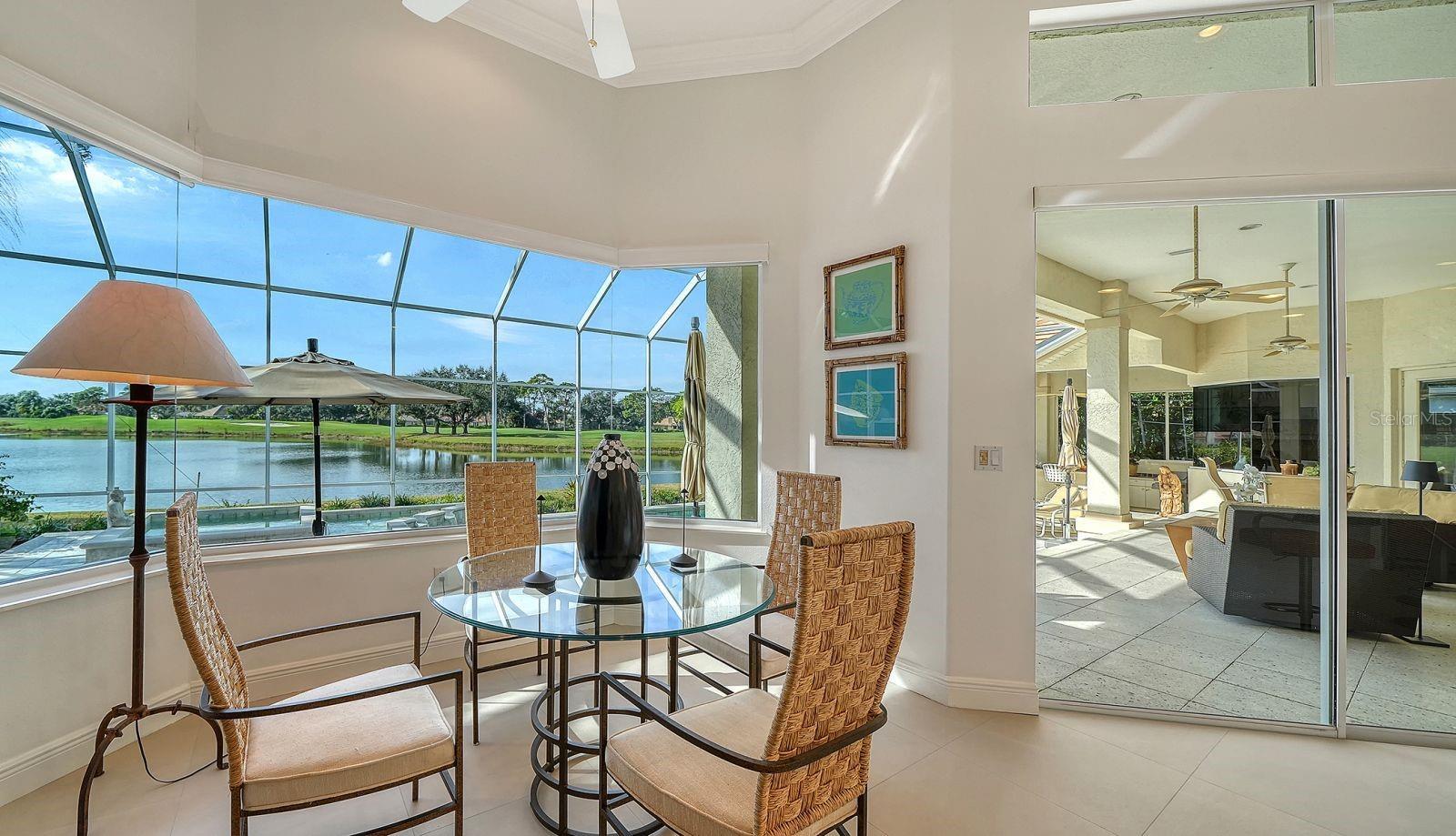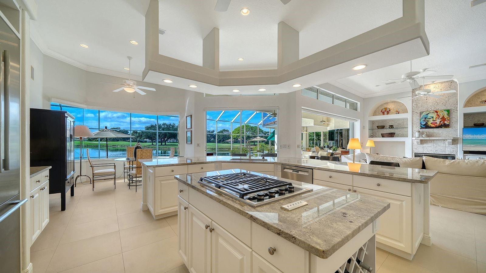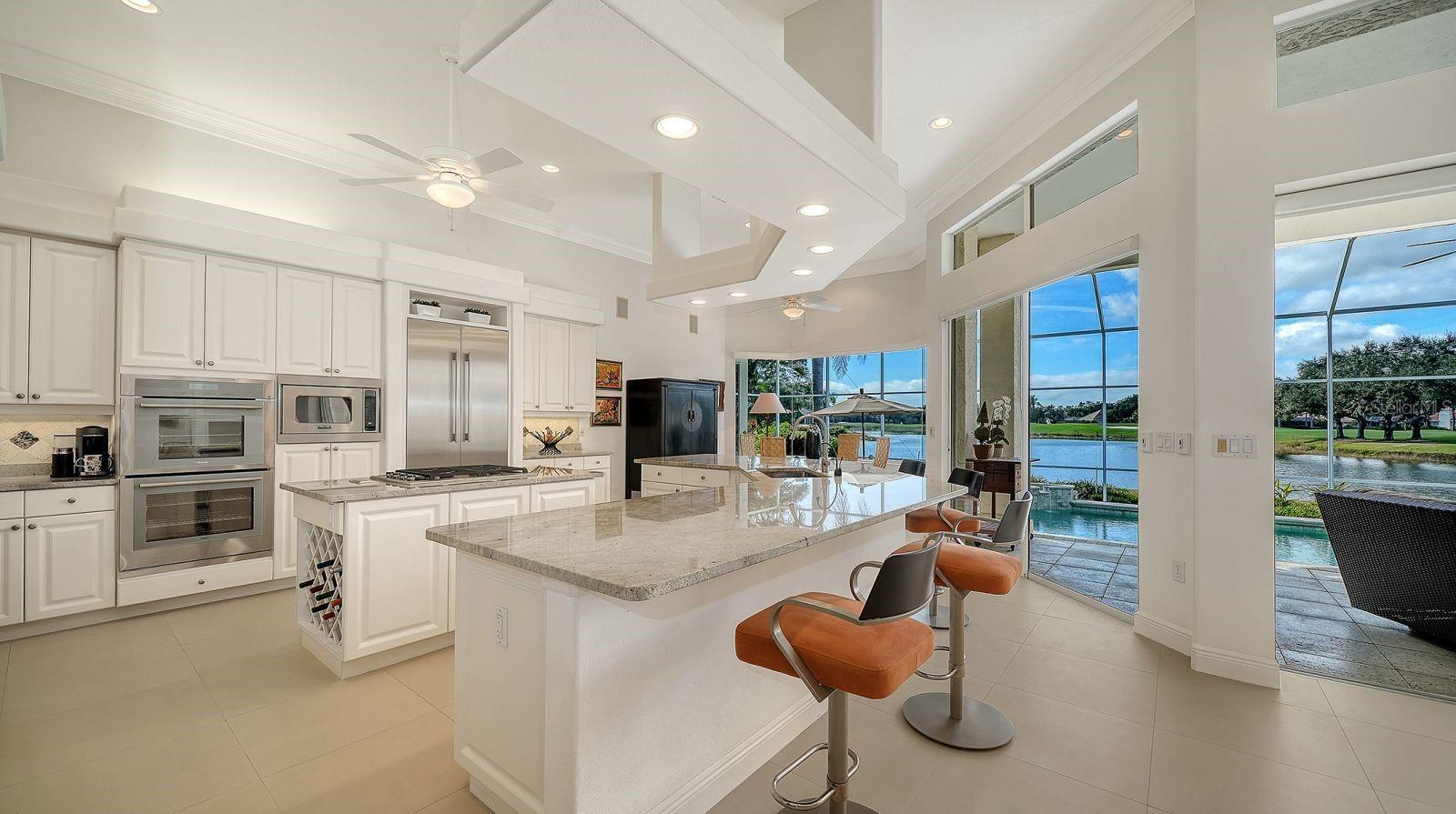 This beautiful John Cannon home has arguably the best water views in the whole of University Park! Boasting 3 bedrooms, 3 baths + den, a 3-car side-return garage, and a huge pool deck, this 3,100-square-foot home is set on 0.4 acre of lushly landscaped property against a backdrop of expansive west-facing lake and golf course views. The home has been fastidiously maintained and beautifully updated. The split-bed floor one-story plan is anchored by a stunning living area with volume ceilings, a striking coral-stone fireplace surround, built-in shelving, and pocket sliders to a huge screened terrace with a sparkling pool and jaw-dropping water views. The primary suite has a large bedroom and spacious seating area overlooking the pool and lake, two walk-in closets, and a spacious bathroom with quartz cabinetry and a vanity desk. The kitchen was remodeled in 2018 with sleek granite countertops, and the appliances were all updated in the past couple of years with Thermador and Wolf fixtures. This home boasts an abundance of natural light in every room which, combined with extra features including high ceilings, a neutral palette, plantation shutters, sunshades, built-in features, and a whole-house generator, represents incredible value in a prime location behind the gates of this sought-after country club University Park Country Club is a gated, resident-owned community offering a 27-hole Ron Garl–designed golf course, eleven lighted Har-Tru tennis courts, four pickleball courts, croquet, a fitness center, and multiple on-site dining options. Miles of tree-lined streets provide opportunities for walking and biking, and a variety of social clubs and organized activities are available to residents. Located approximately four miles from downtown Sarasota, the community provides convenient access to shopping, dining, cultural venues, healthcare, and major transportation routes. University Town Center, with its wide selection of shops, restaurants, and fitness studios, is about two miles away, along with Nathan Benderson Park and nearby Mote Marine facilities. Gulf Coast beaches, SRQ airport, the Ringling Museum, boating options, and St. Armands Circle are all within an estimated 15-minute drive.