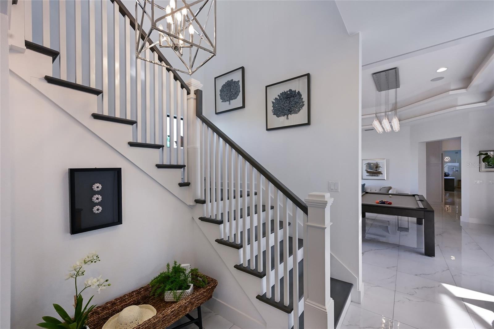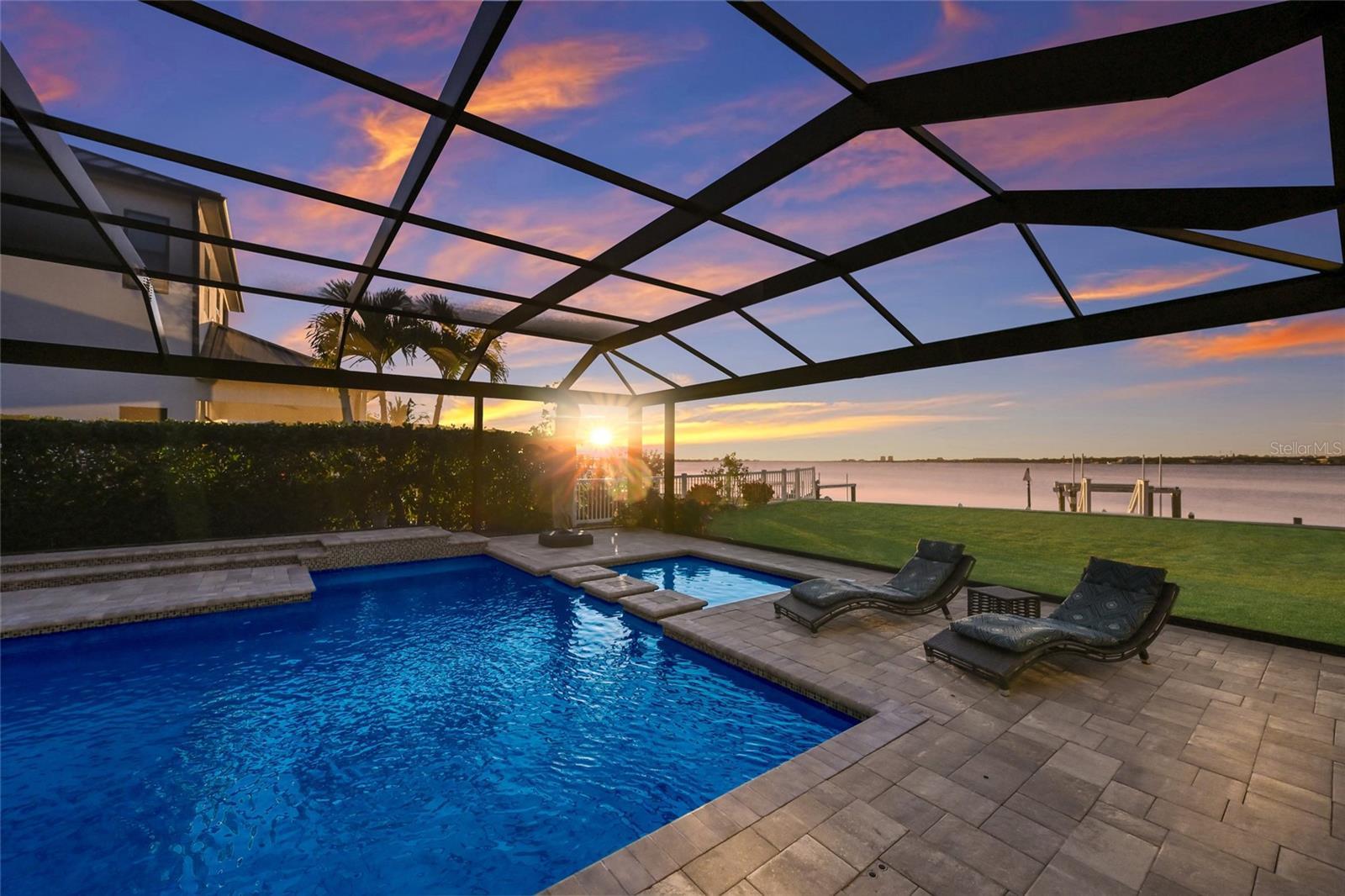 Welcome to The Reserve at Harbour Walk, an exclusive enclave of custom residences offering direct Gulf access within the privacy of a double-gated waterfront community. This exceptionally rare, former model home is positioned on an oversized direct waterfront lot, delivering an unparalleled boating lifestyle with open water views and sailboat access. The home’s striking coastal contemporary architecture is highlighted by refined metal roof accents, decorative flat tile roofing, a paver driveway, IMPACT WINDOWS/DOORS, and impeccably curated luxury landscaping—setting the tone for sophisticated waterfront living. Upon entering through elegant glass doors, you are immediately captivated by expansive water views and a modern, designer-curated interior. Inside, the residence showcases upgraded flooring, soaring 12-foot ceilings, custom trim work, extensive built-ins, and a full security system. The primary suite is a private retreat, featuring custom-designed closets, a tranquil sitting area with an aquarium window overlooking the water, and a spa-inspired primary bath designed for ultimate relaxation. A stunning glass-enclosed wine room with bespoke detailing adds a dramatic focal point for entertaining. The outdoor living spaces are nothing short of extraordinary, offering breathtaking views of the Manatee River and direct, deep-water access to the Gulf. The custom-designed pool and spa serve as a true showpiece, complete with a newer pool cage featuring a retractable panoramic screen wall, ambient lighting, and an expansive infinity spa. Adjacent, a fully equipped outdoor kitchen and dining area create the perfect setting for elevated coastal entertaining. For boating enthusiasts, the private dock is outfitted with a 16,000-pound boat lift with a recent 10-foot extension—allowing you to arrive home by water with ease, without the need for marina or dry dock storage. Recent enhancements include a WHOLE-HOUSE GENERATOR, helical anchors beneath the foundation for added security and stabilization, elevated pool equipment, built-in garage cabinetry with an electric lift providing access to generous attic storage, enhanced landscape lighting, new designer balcony tile, window shutters, and electric blinds. Professionally decorated and thoughtfully designed, this former model home exemplifies today’s upscale Florida waterfront lifestyle. This is a rare opportunity to own a direct open-water residence in one of the area’s most coveted gated boating communities.