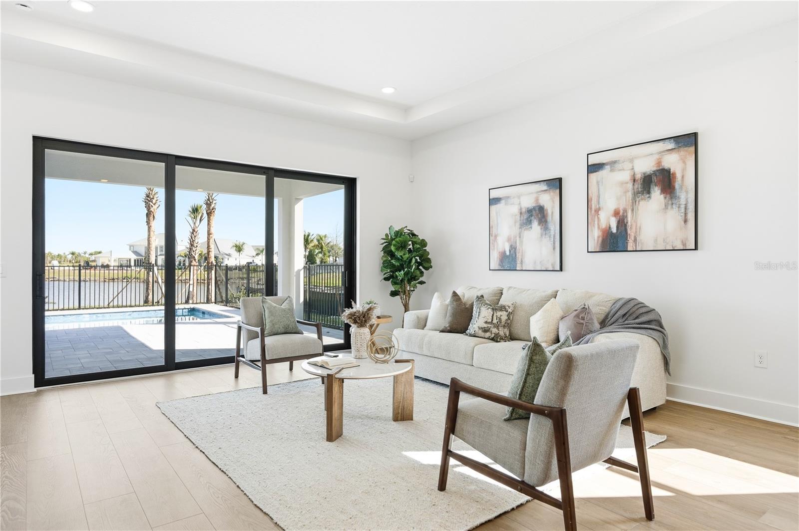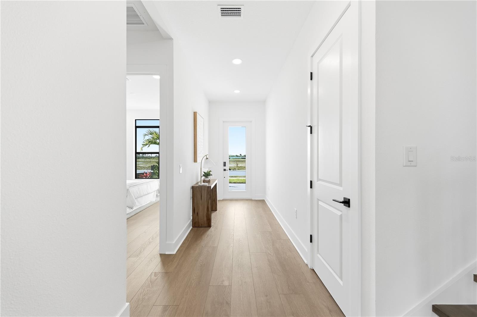 Under Construction. Step into this stunning two-story home with a private pool and serene water views, offering 4 bedrooms, 3 baths, and a spacious loft, designed with an open-concept layout that feels bright, modern, and inviting. Luxury vinyl plank flooring flows throughout the main living areas, highlighted by elegant oak stairs that add a warm architectural touch. The primary suite is conveniently located downstairs and features a spa-style bathroom with a freestanding soaking tub, walk-in shower, and generous storage. Large sliding glass doors open to an oversized covered lanai, creating a seamless transition to your pool and peaceful waterfront setting—perfect for entertaining or unwinding at the end of the day. With upgraded finishes, thoughtful design, and a premium waterfront homesite, this home delivers exceptional comfort, style, and everyday luxury.