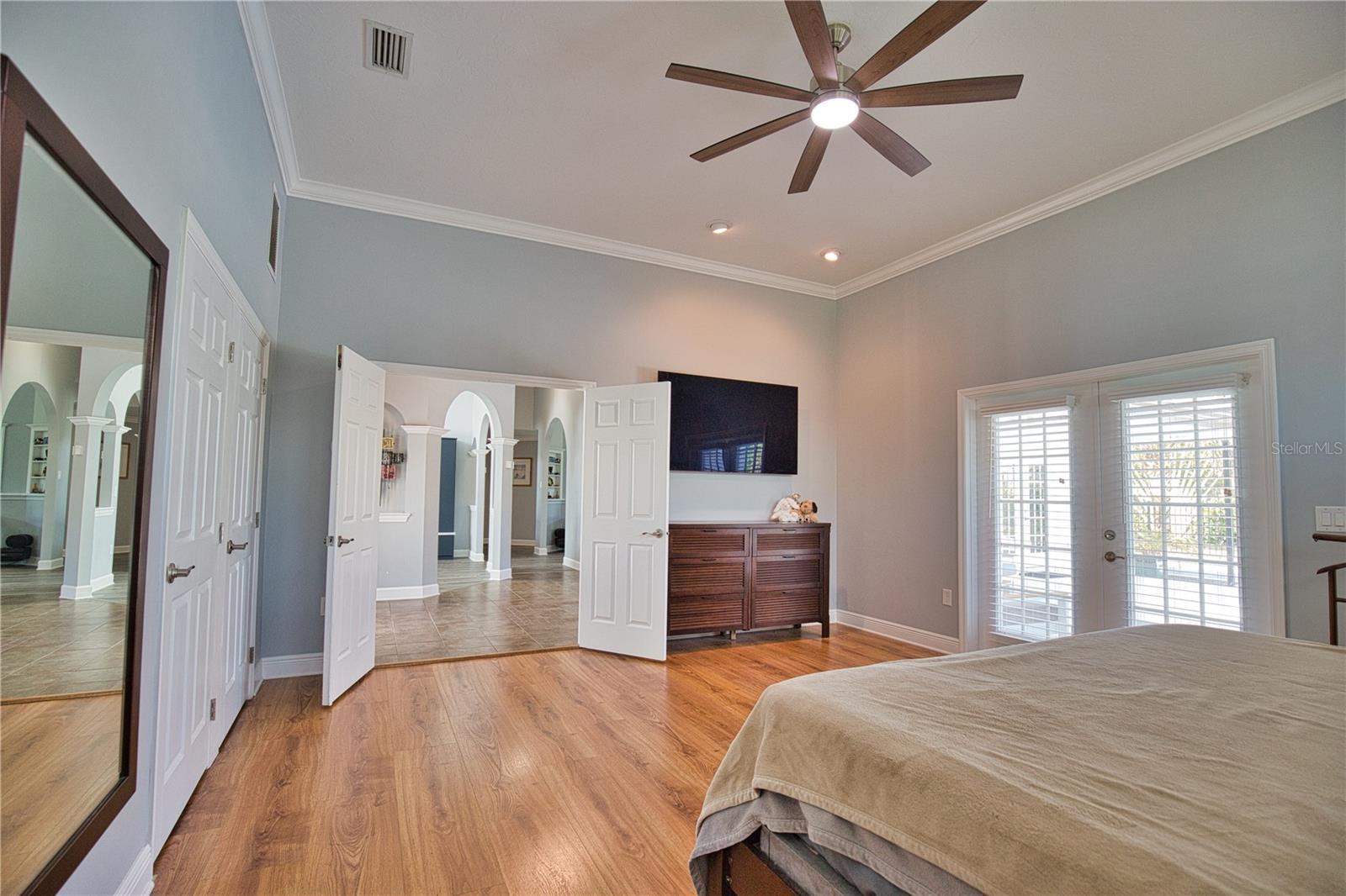 - Built-in Features, Ceiling Fans(s), Crown Molding, High Ceilings, Kitchen/Family Room Combo, Open Floorplan, Solid Surface Counters, Split Bedroom, Vaulted Ceiling(s), Walk-In Closet(s), Window Treatments