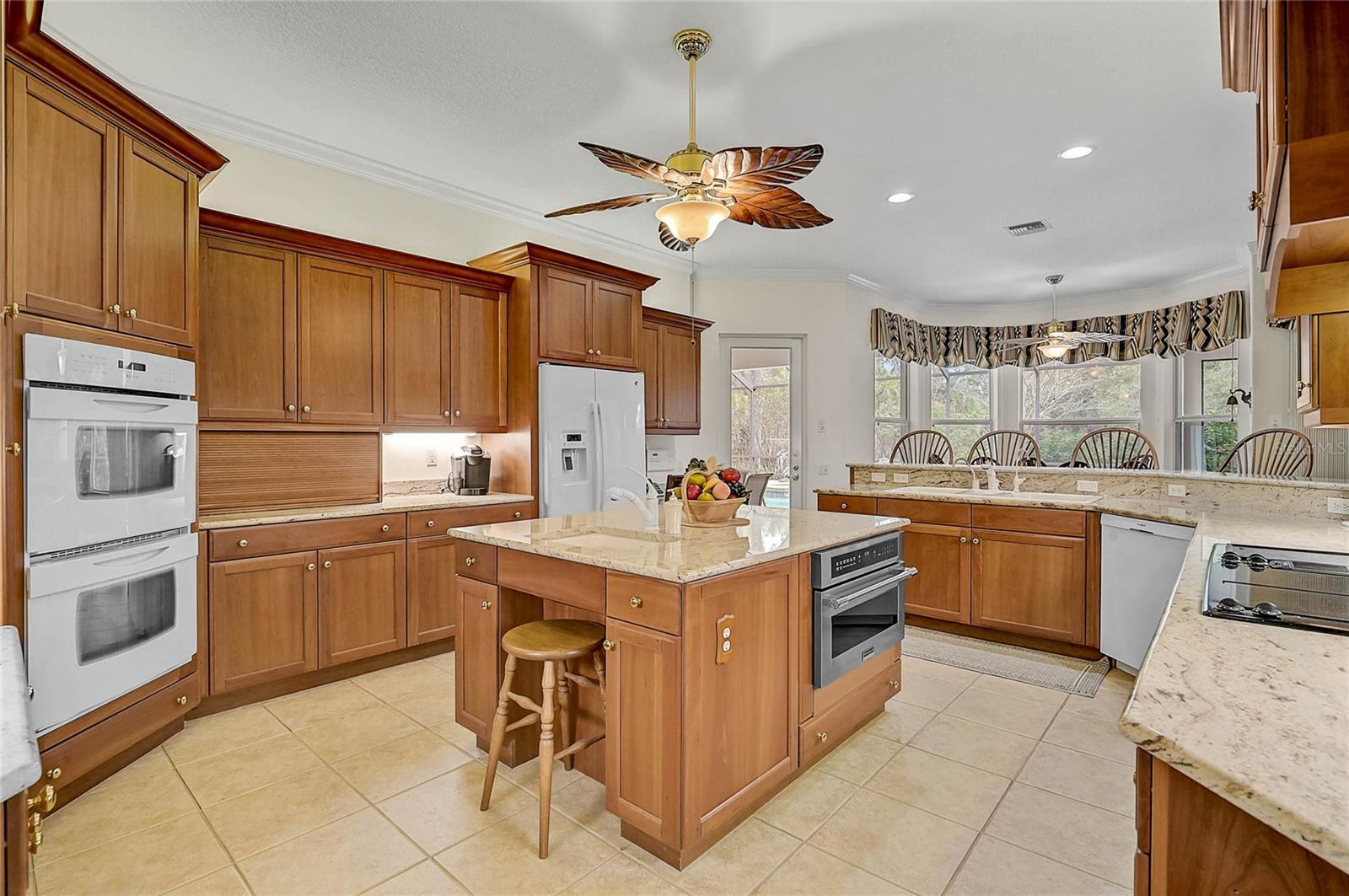 - Built-in Features, Ceiling Fans(s), Dry Bar, Eat-in Kitchen, Kitchen/Family Room Combo, Primary Bedroom Main Floor, Solid Wood Cabinets, Split Bedroom, Stone Counters, Thermostat, Tray Ceiling(s), Walk-In Closet(s)