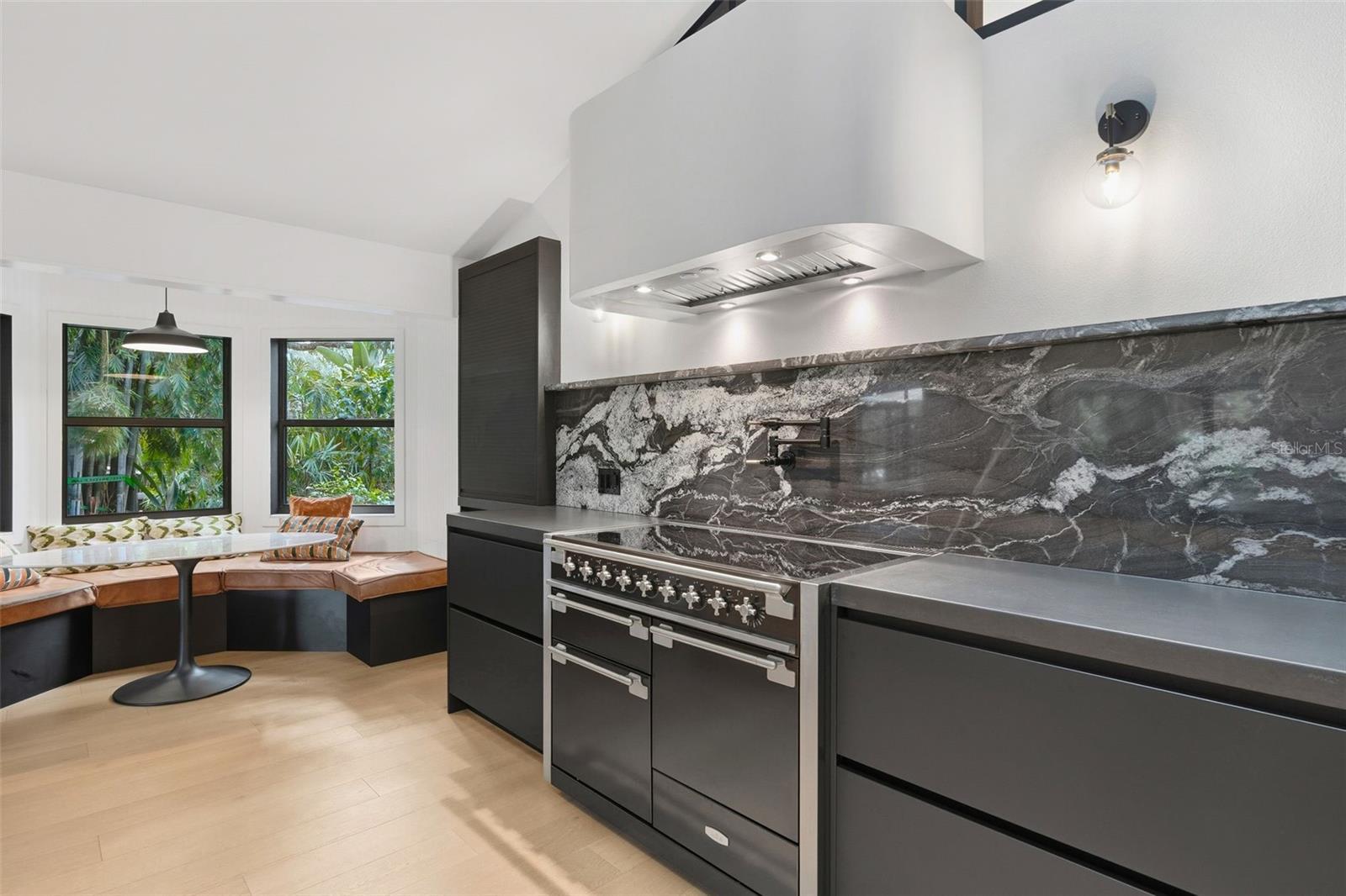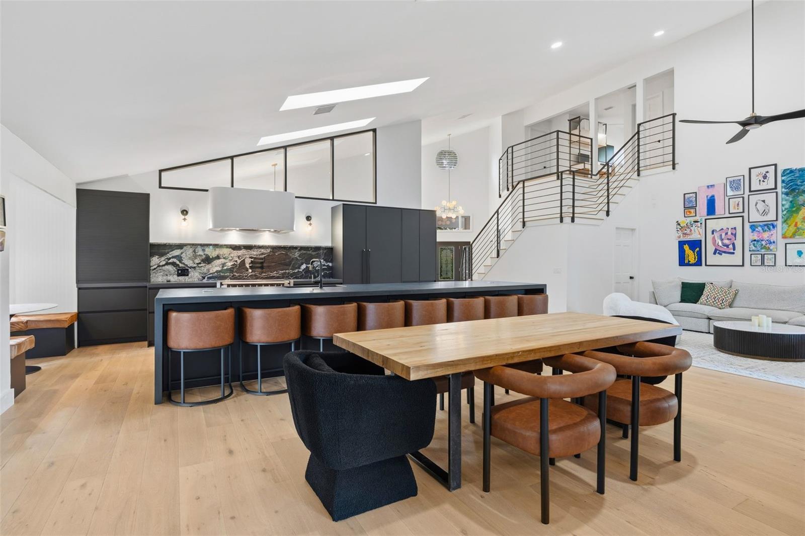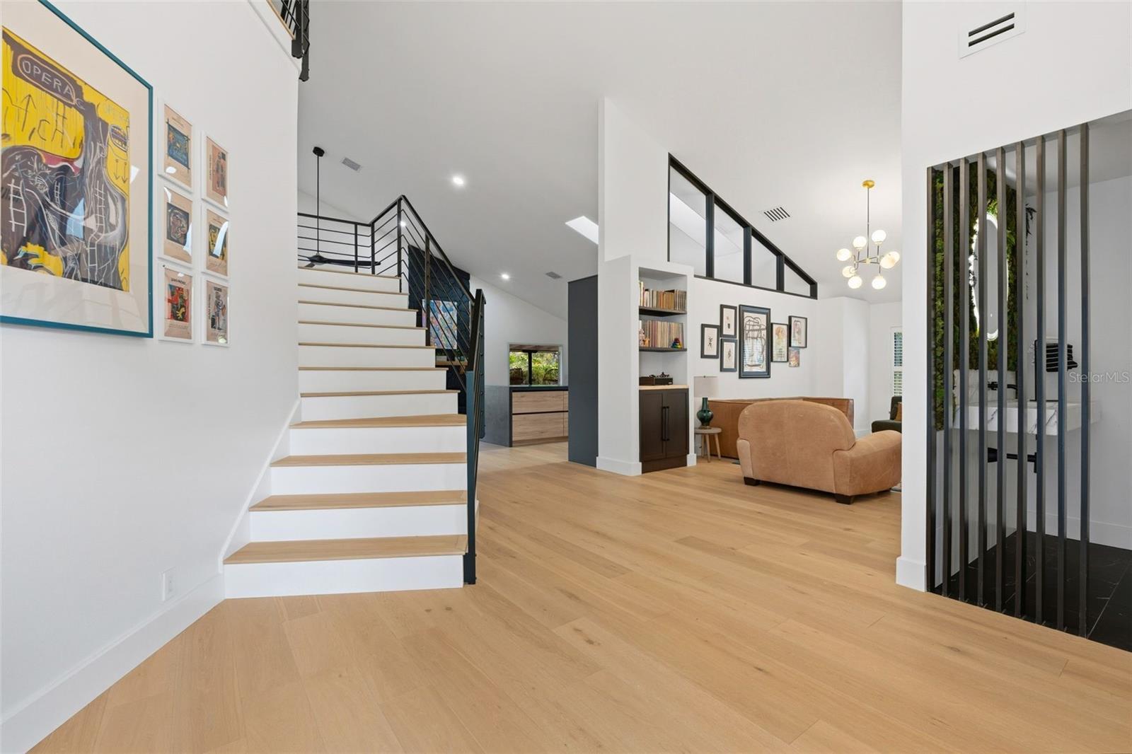 Tucked away on the tranquil cul-de-sac of Ravenwood Way, this architecturally rich home blends European elegance with modern, thoughtful design. The 1-acre waterfront estate is designed for gathering, entertaining, growing, creating, and living beautifully. Upon entry you are met with soaring 27-foot cathedral ceilings in an open, free-flowing floorplan ideal for entertaining. The space has Canadian white oak engineered floors, offering warmth against the sleek black accents, natural cement touches, and refined marble details found throughout. The chef-inspired kitchen is a distinctive statement — truly crafted, using German engineering principles, intelligent design storage, and premium integrated appliances. A striking 16-foot cement waterfall island, created by local artist Jake Brady, captures the spirit of the home — artisanal, durable, and functional. The kitchen features a 48" AGA British induction stove, dual Fisher & Paykel built-in fridge & freezer, elegant pot filler, Italian Elica Arrezzo ventilation system, two Asko stainless steel dishwashers, and an appliance garage. Off the kitchen is the relaxing bay-window breakfast nook. The living area, with a fully functional wood-burning fireplace, creates an atmosphere of intimate gatherings. Adjacent is the TV projection room — a cozy retreat designed for shared experiences. The staircase's modern single-piece aluminum railing enhances the home's architectural lines. The first floor main suite, features a custom white oak privacy wall, dedicated workspace nook, and thoughtfully designed walk-in closet with white pine industrial-style storage. The main bathroom continues the aesthetic: double vanities, soaking tub, shower, and soft neutral design. Upstairs, the two bedrooms were both designed with comfort in mind — sliding closet doors, built-in storage, one with a window seat, and the other has a private balcony overlooking the lake. The second-floor landing, ideal for a study, office, or creative space, serves as a vibrant corner for kids, professionals, or guests. The upstairs bathroom embraces a refined black-and-white marble theme. The downstairs half-bath is a true conversation piece featuring a living wall, one-piece violet marble sink imported from Turkey, and a technologically advanced toilet with heated seat, handless flushing, and luxury finishings. Three sets of French doors open to the L-shaped covered lanai, transforming indoor living into outdoor lifestyle. Overlooking the lake, private dock, mature trees, and native wildlife. Enjoy the lake while kayaking, pole fishing, or relaxing on a small boat. The saltwater heated pool sits within lush low-maintenance tropical landscaping, framed by Sarasota-native palms, fragrant ginger plants, and fruit trees (mango, banana, pomegranate, guava, & starfruit. The home offers an updated laundry room, new garage cabinetry and flooring, and additional attic storage. The Ravenwood community is known for its generous lot sizes, architectural individuality, and rapid gentrification. Ideally located close to Nathan Benderson Park (with rowing, trails, world-class events), UTC Town center mall, dining galore and championship golf courses. It is a short drive to Airport or I-75 for easy commuting and a short drive to Downtown & Sarasota’s world-famous beaches. Secluded, yet minutes from everything that defines Sarasota living. It is the perfect address for those who value serenity without sacrificing access or lifestyle.