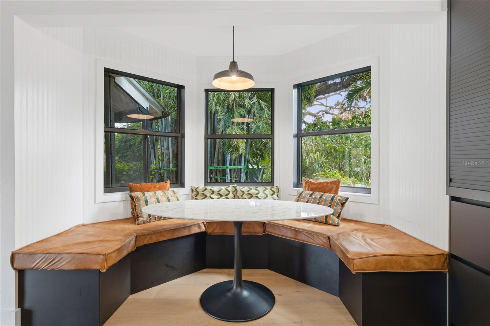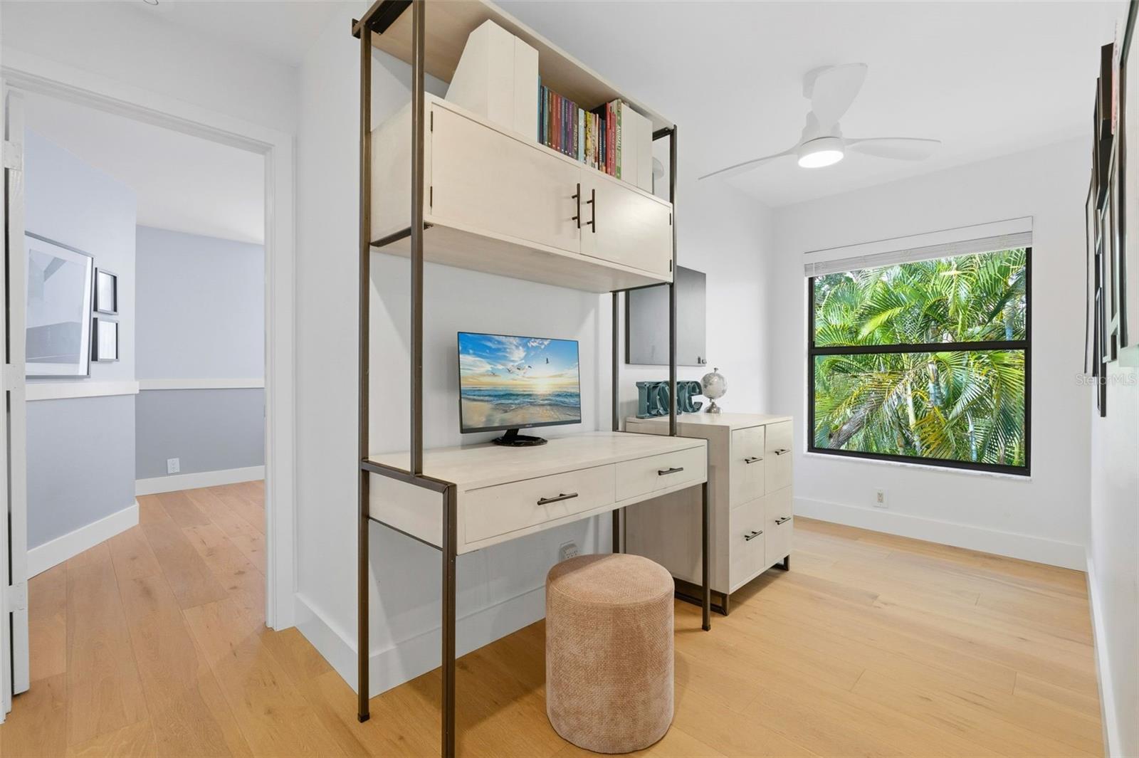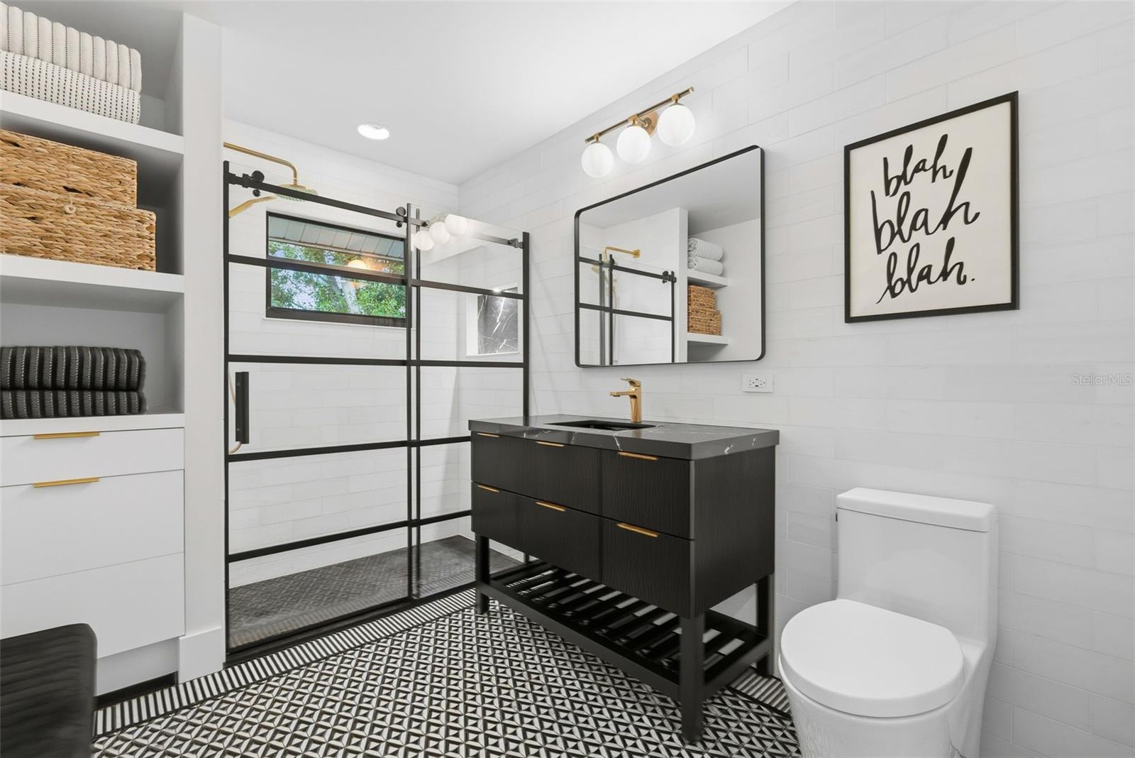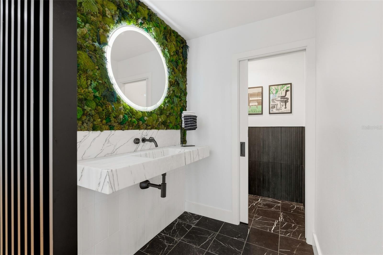 Tucked away on the tranquil cul-de-sac of Ravenwood Way, this architecturally rich home blends European elegance with modern, thoughtful design. The 1-acre waterfront estate is designed for gathering, entertaining, growing, creating, and living beautifully. Upon entry you are met with soaring 27-foot cathedral ceilings in an open, free-flowing floorplan ideal for entertaining. The space has Canadian white oak engineered floors, offering warmth against the sleek black accents, natural cement touches, and refined marble details found throughout. The chef-inspired kitchen is a distinctive statement — truly crafted, using German engineering principles, intelligent design storage, and premium integrated appliances. A striking 16-foot cement waterfall island, created by local artist Jake Brady, captures the spirit of the home — artisanal, durable, and functional. The kitchen features a 48" AGA British induction stove, dual Fisher & Paykel built-in fridge & freezer, elegant pot filler, Italian Elica Arrezzo ventilation system, two Asko stainless steel dishwashers, and an appliance garage. Off the kitchen is the relaxing bay-window breakfast nook. The living area, with a fully functional wood-burning fireplace, creates an atmosphere of intimate gatherings. Adjacent is the TV projection room — a cozy retreat designed for shared experiences. The staircase's modern single-piece aluminum railing enhances the home's architectural lines. The first floor main suite, features a custom white oak privacy wall, dedicated workspace nook, and thoughtfully designed walk-in closet with white pine industrial-style storage. The main bathroom continues the aesthetic: double vanities, soaking tub, shower, and soft neutral design. Upstairs, the two bedrooms were both designed with comfort in mind — sliding closet doors, built-in storage, one with a window seat, and the other has a private balcony overlooking the lake. The second-floor landing, ideal for a study, office, or creative space, serves as a vibrant corner for kids, professionals, or guests. The upstairs bathroom embraces a refined black-and-white marble theme. The downstairs half-bath is a true conversation piece featuring a living wall, one-piece violet marble sink imported from Turkey, and a technologically advanced toilet with heated seat, handless flushing, and luxury finishings. Three sets of French doors open to the L-shaped covered lanai, transforming indoor living into outdoor lifestyle. Overlooking the lake, private dock, mature trees, and native wildlife. Enjoy the lake while kayaking, pole fishing, or relaxing on a small boat. The saltwater heated pool sits within lush low-maintenance tropical landscaping, framed by Sarasota-native palms, fragrant ginger plants, and fruit trees (mango, banana, pomegranate, guava, & starfruit. The home offers an updated laundry room, new garage cabinetry and flooring, and additional attic storage. The Ravenwood community is known for its generous lot sizes, architectural individuality, and rapid gentrification. Ideally located close to Nathan Benderson Park (with rowing, trails, world-class events), UTC Town center mall, dining galore and championship golf courses. It is a short drive to Airport or I-75 for easy commuting and a short drive to Downtown & Sarasota’s world-famous beaches. Secluded, yet minutes from everything that defines Sarasota living. It is the perfect address for those who value serenity without sacrificing access or lifestyle.