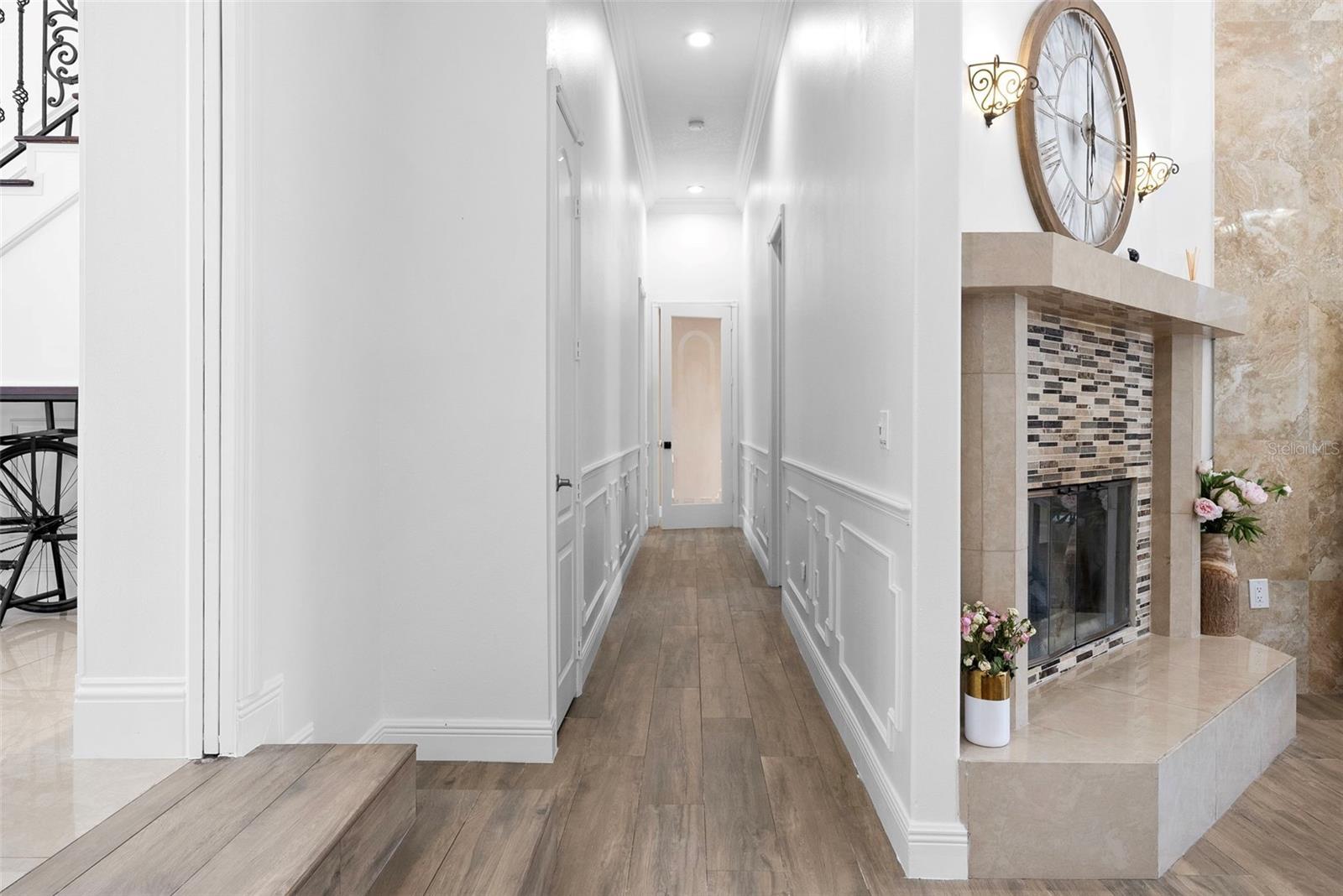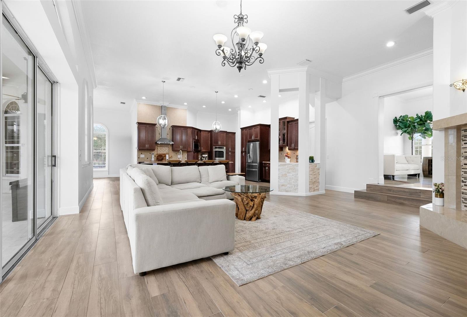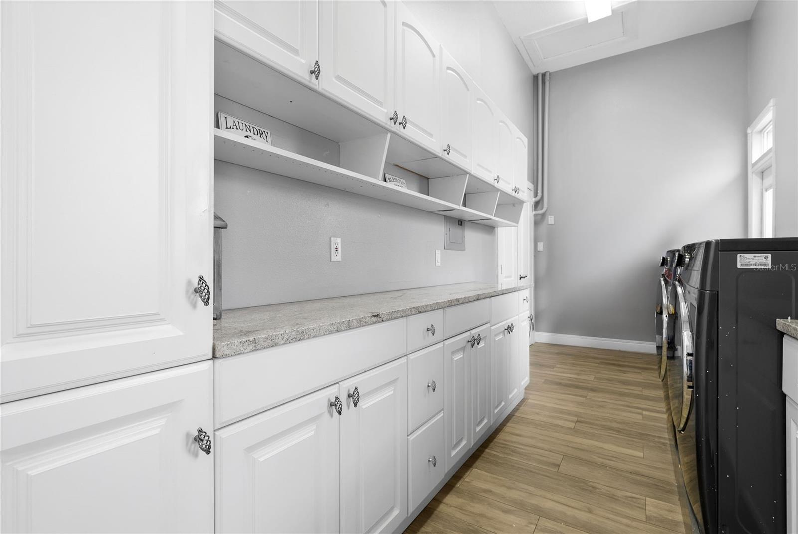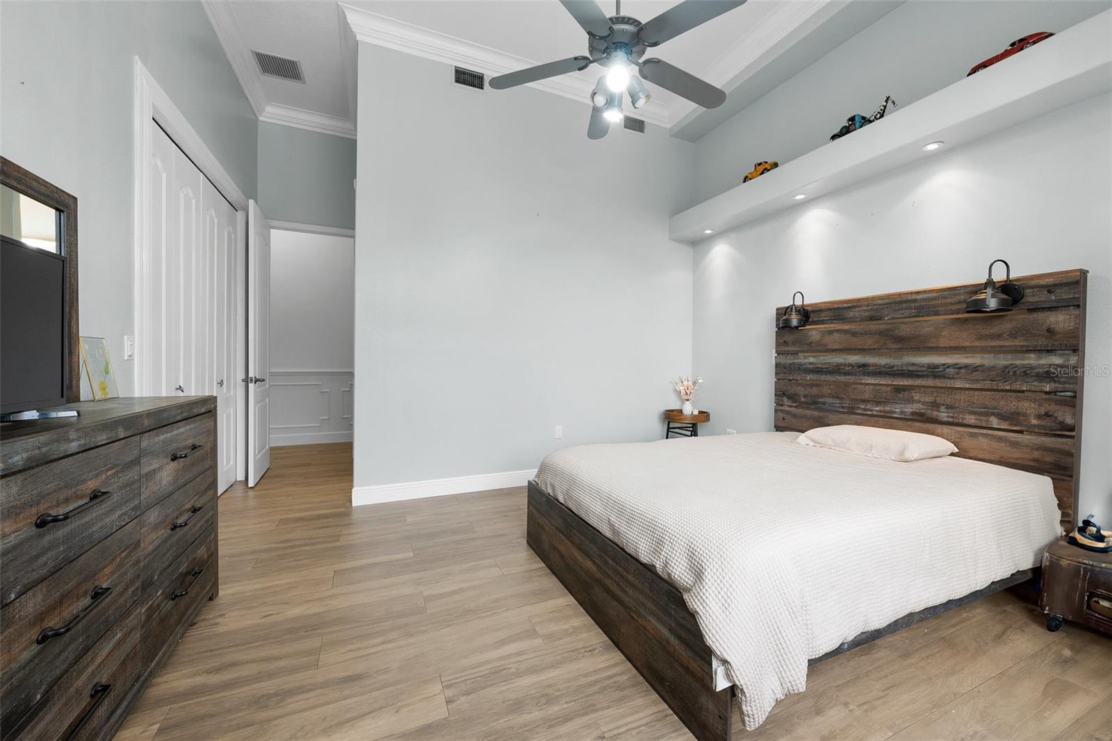 - Built-in Features, Ceiling Fans(s), Central Vaccum, Crown Molding, Eat-in Kitchen, High Ceilings, Kitchen/Family Room Combo, Open Floorplan, Primary Bedroom Main Floor, PrimaryBedroom Upstairs, Solid Wood Cabinets, Split Bedroom, Stone Counters, Tray Ceiling(s), Walk-In Closet(s), Wet Bar, Window Treatments