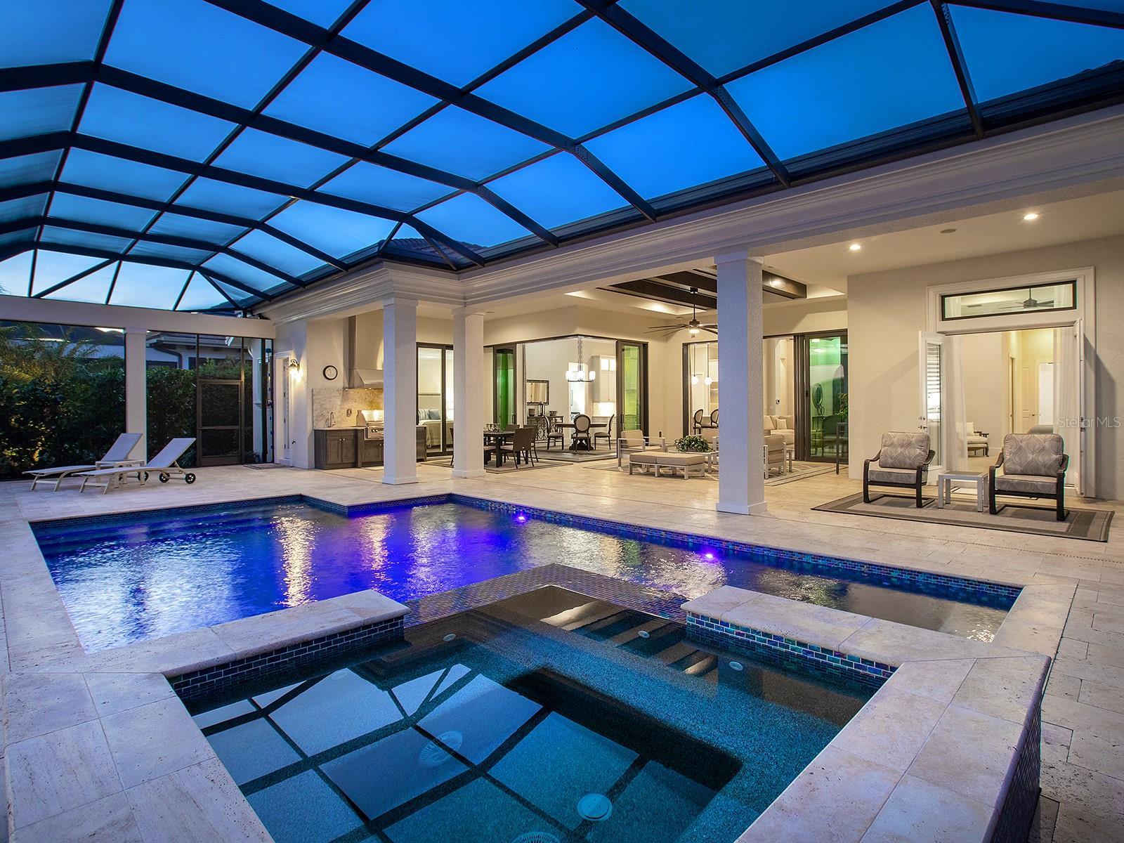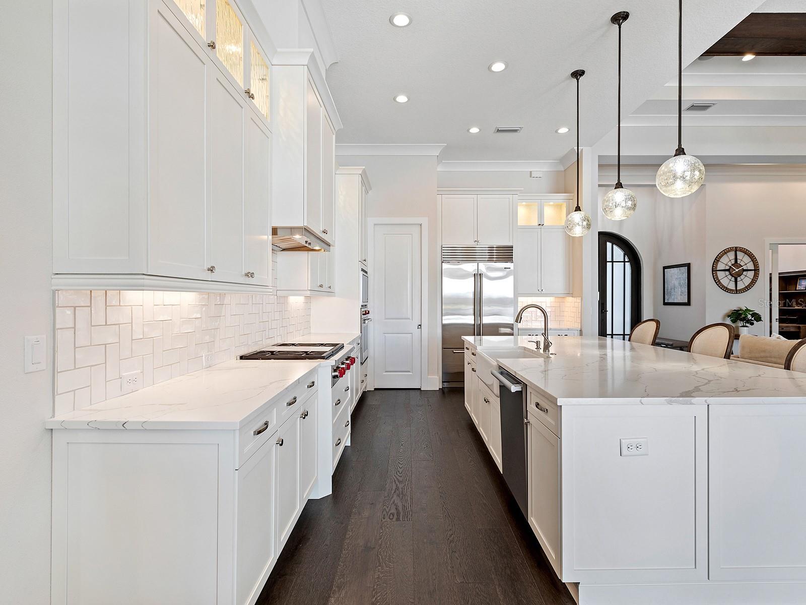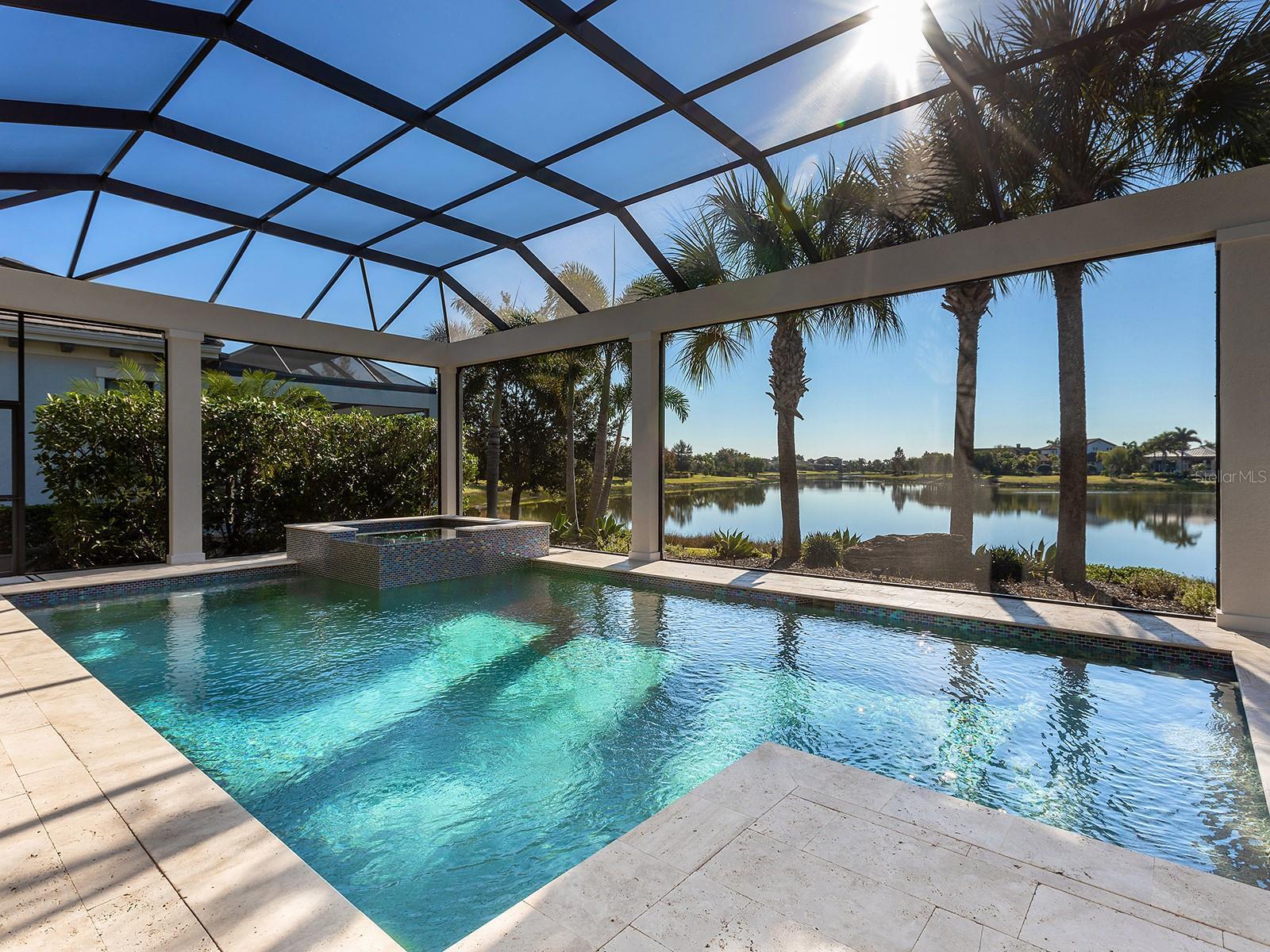 Under contract-accepting backup offers. Welcome to 16218 Daysailor Trail, an exceptional estate residence set behind the gates of The Lake Club at Lakewood Ranch. Built in 2018 and meticulously maintained, this nearly 3,100-square-foot, single-level home embodies refined Florida living, offering expansive unobstructed long lake views and desired southern exposure that provides a tranquil, ever-changing natural backdrop. Positioned on a premier waterfront homesite, the property features over $57,000 in recent upgrades and a thoughtfully curated selection of upscale finishes throughout. Enter through the double glass and iron doors into a bright, timeless interior where the expansive great room impresses with high-volume ceilings accented by wood beams, rich hardwood flooring, a gas fireplace, and pocketing impact-glass sliders that seamlessly blend indoor and outdoor living. The outdoor living space is equally compelling, offering generous covered lounge and dining areas, a fully equipped outdoor kitchen, and a heated saltwater pool and spa, all overlooking private lake views designed for year-round enjoyment. At the heart of the home, the chef’s kitchen is a showpiece, offering double-stacked wood cabinetry with glass-front uppers, lighted interiors and slide-out shelving. Premium appliances include a Wolf gas cooktop, wall oven and microwave, Sub-Zero built-in refrigerator, Miele dishwasher and a walk-in pantry with custom shelving. Calacatta Lazza quartz countertops, a stacked herringbone backsplash, farmhouse sink and elegant pendant lighting complete the island, which doubles as a breakfast bar and flows seamlessly into the dining area. The dining room, with corner sliding glass doors and serene water views, is an entertainer’s dream. The private primary suite offers a peaceful retreat with French doors flowing to the lanai, two spacious walk-in closets with custom built-ins, and a spa-inspired bath featuring split vanities, a large walk-in shower and a soaking tub. Two additional en-suite bedrooms provide comfort and privacy for family and guests. A versatile bonus room, used as a fourth en-suite bedroom with hardwood flooring, adds flexibility to the floor plan. The den, ideal for a home office, features wood flooring, plantation shutters and pocketing glass French doors, creating a quiet space for work or relaxation. Additional highlights include professionally designed landscaping with accent lighting, Italian plumbing fixtures, plantation shutters throughout and custom window treatments, central vacuum with kitchen kick sweep, solid-core interior doors, crown molding, 7¼-inch baseboards, whole-house surge protection, a newer pool heater, recently painted exterior, Honeywell Wi-Fi thermostats, replacement of all pool screen frame bolts and a three-car garage with EV charging station. A discreet side-yard dog run with turf completes the thoughtful design. Meticulously cared for and move-in ready, this exceptional home delivers a balance of elegance, comfort and effortless luxury. The Lake Club is a gated community anchored by an impressive 20,000-square-foot clubhouse offering a collection of luxury amenities. Residents enjoy two resort-style pools, including a zero-entry pool with a splash park, poolside dining, a full-service spa and a state-of-the-art fitness center, tennis and pickleball courts with professional racquet staff cater to sports enthusiasts, and an active social calendar keeps the community connected year-round. Total tax amount includes CDD fee.