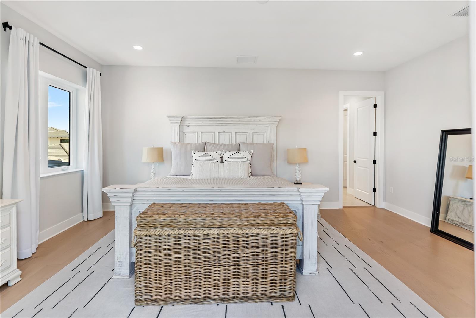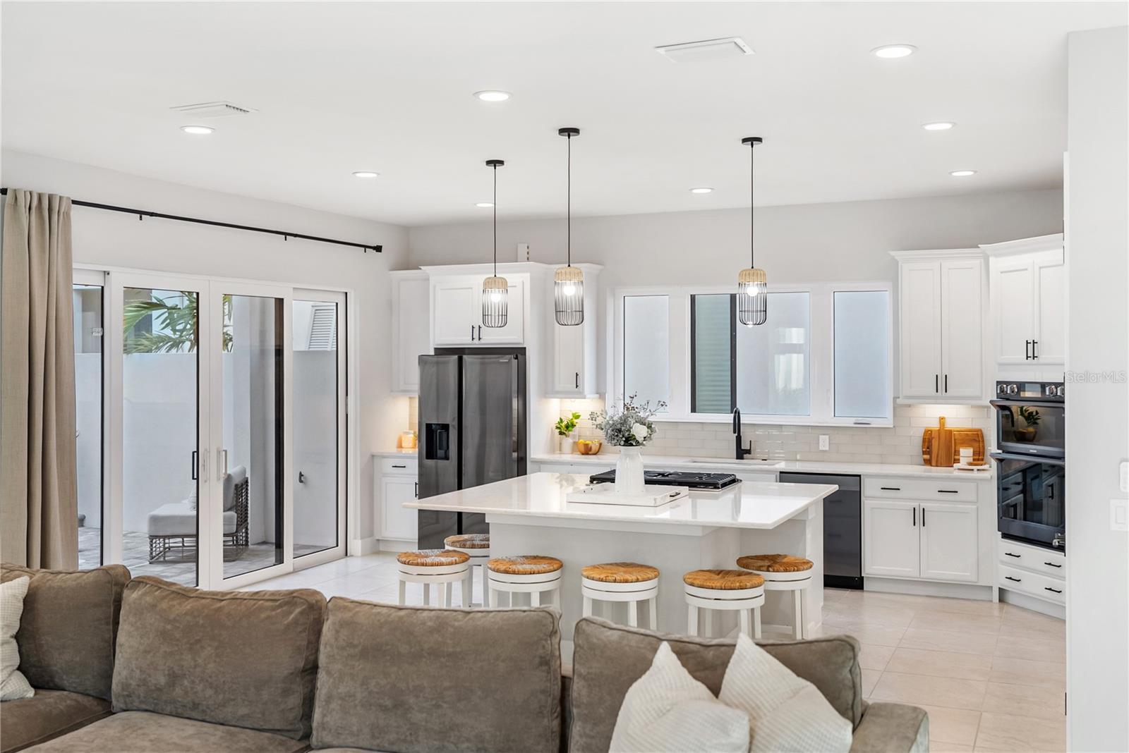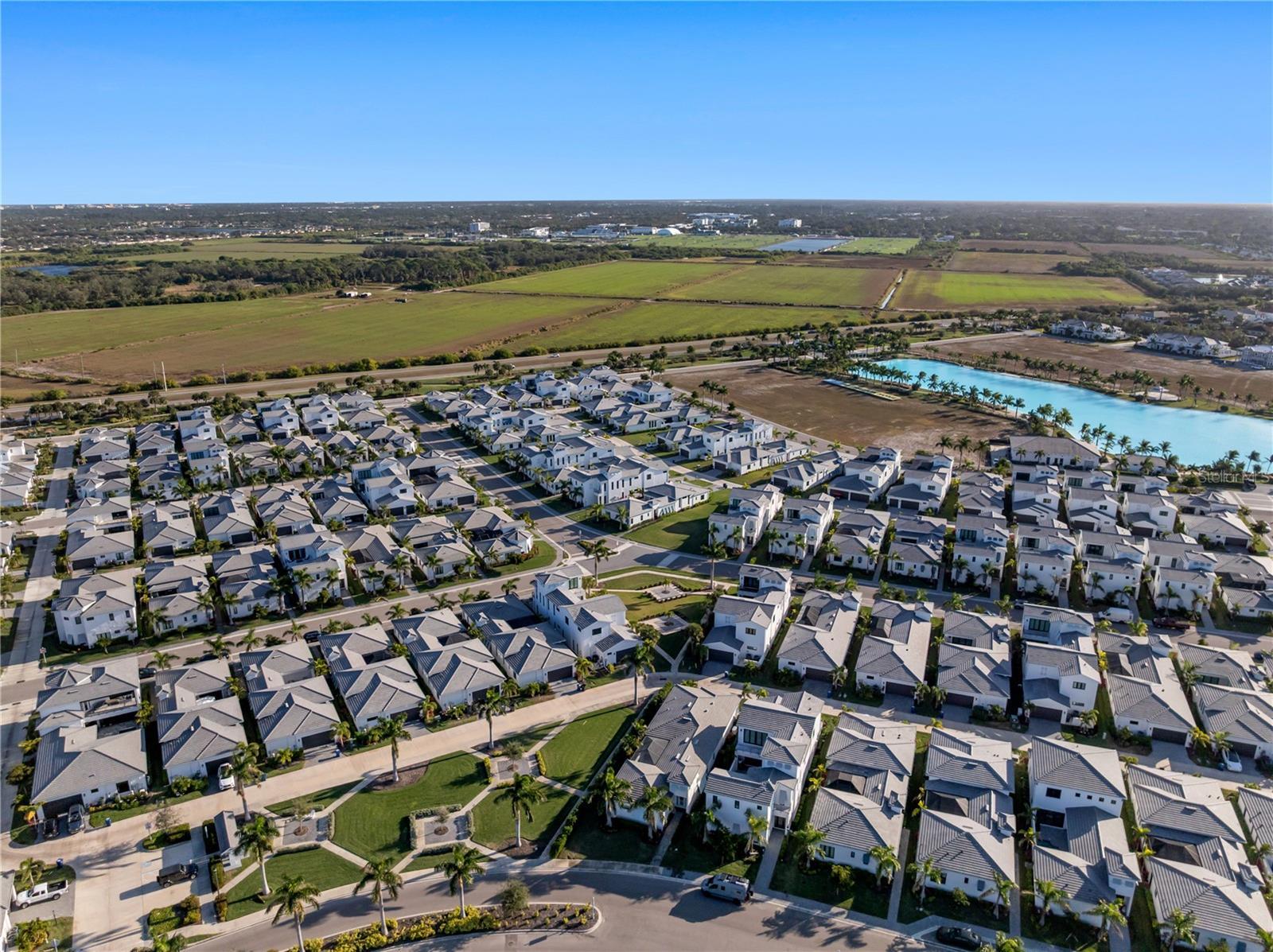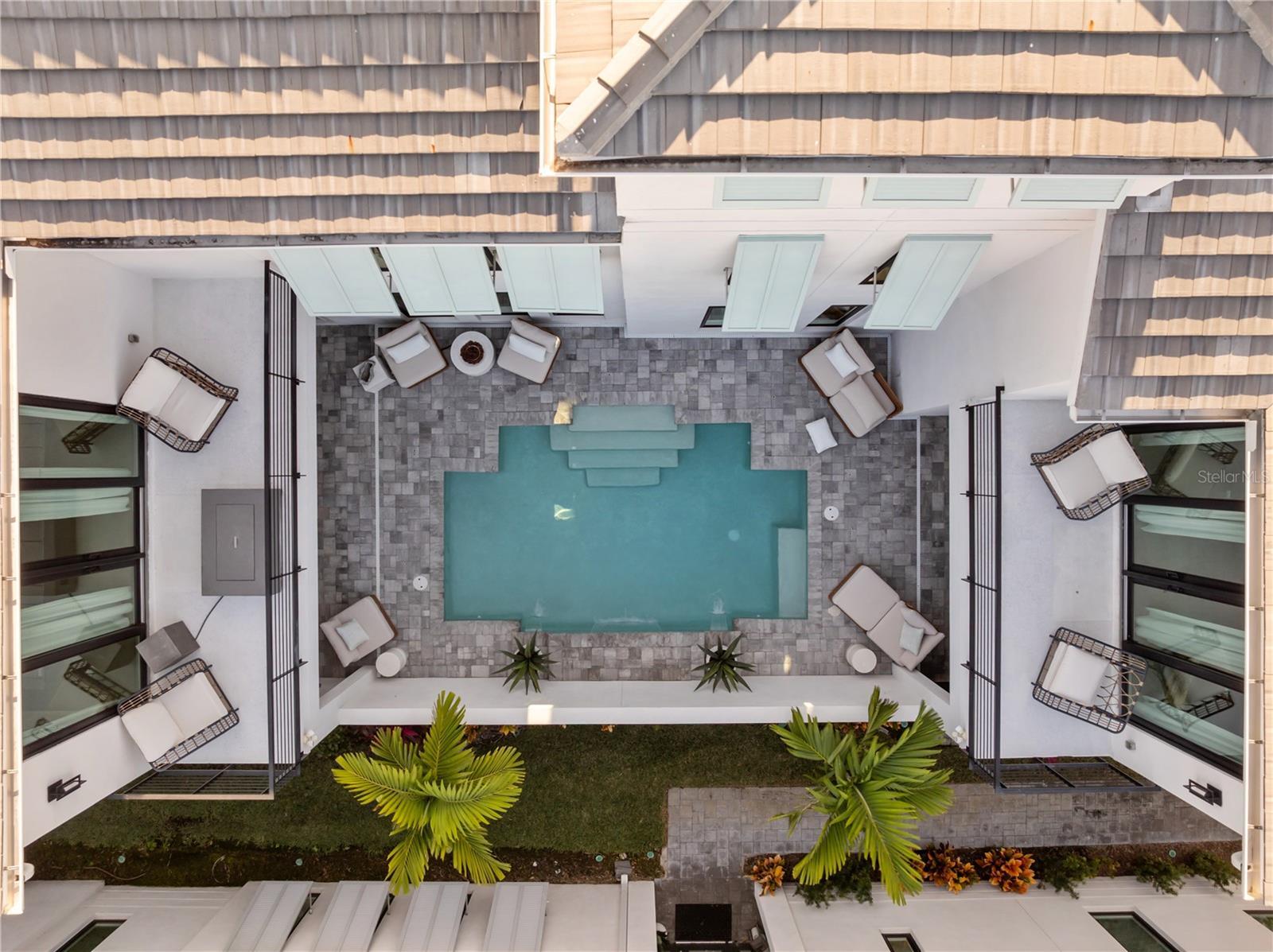 Experience intentionally designed coastal luxury in this two-story modern residence located within the prestigious Aqua Lagoon community, a gated enclave offering 24-hour guard service and exclusive access to a private four-acre resort-style beach and crystal-clear lagoon. Designed for effortless indoor-outdoor living, this thoughtfully planned home offers exceptional privacy with no neighboring homes overlooking the pool or courtyard. Spanning 3,916 square feet, the residence features four bedrooms, four full baths, a loft, and an expansive bonus media room, with flexible spaces allowing conversion into up to six bedrooms to suit a variety of lifestyles. A highly desirable first-floor bedroom provides ideal accommodations for guests, multigenerational living, or a private retreat near a full bath. Upon entry, soaring ceilings and an upgraded custom staircase set the tone, complemented by spray foam insulation and high-end contemporary finishes throughout. The home is structurally designed to accommodate a future elevator, with the current shaft space utilized for additional storage. The heart of the home centers around a private interior courtyard with a saltwater pool and custom waterfall, designed to seamlessly connect indoor and outdoor spaces. Double doors from the kitchen and downstairs flex or media space open directly to the pool, enhancing flow for everyday living and entertaining. The chef’s kitchen is outfitted with premium appliances, quartz countertops, a smart double oven, microwave, solid wood cabinetry, a pantry closet, and a large island with natural gas cooktop featuring a rising vent system, all overlooking the light-filled living area. A formal dining area captures pool views, and the expansive media or flex room offers additional versatility. The first floor also includes a full bath with direct pool access and a sitting nook beneath the staircase. Upstairs, multiple bedrooms feature private balconies overlooking the courtyard and pool. The primary suite offers its own balcony, extended walk-in closet, and spa-inspired bath with dual vanities, soaking tub, and oversized walk-in shower with dual shower heads. One secondary bedroom includes an en suite bath, while another is located near an additional full bathroom, along with a second-floor laundry room. Additional upgrades include UV lighting in both HVAC systems and a hospital-grade whole-home water filtration system. The epoxy-finished three-car garage includes a rare third flex bay ideal for a golf cart, storage, or extra vehicle, plus overhead storage. Ideally positioned near IMG Academy, IMG Golf and Country Club, Anna Maria Island, Cortez Village, Sarasota Bradenton International Airport, and the beaches of Longboat Key, Aqua Lagoon also offers convenient access to UTC and St Armands Circle. This property presents an exceptional opportunity as a primary residence, luxury Florida retreat, or annual rental investment. Skip the wait for new construction and schedule your private showing of this fully furnished coastal residence today.
