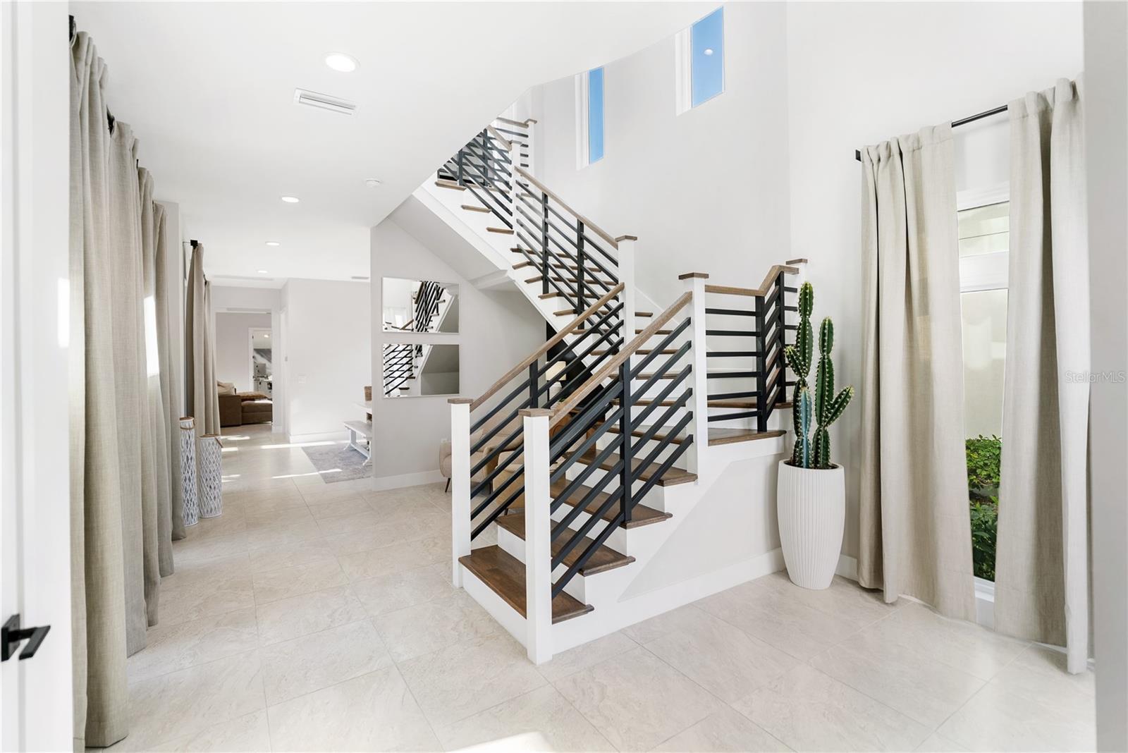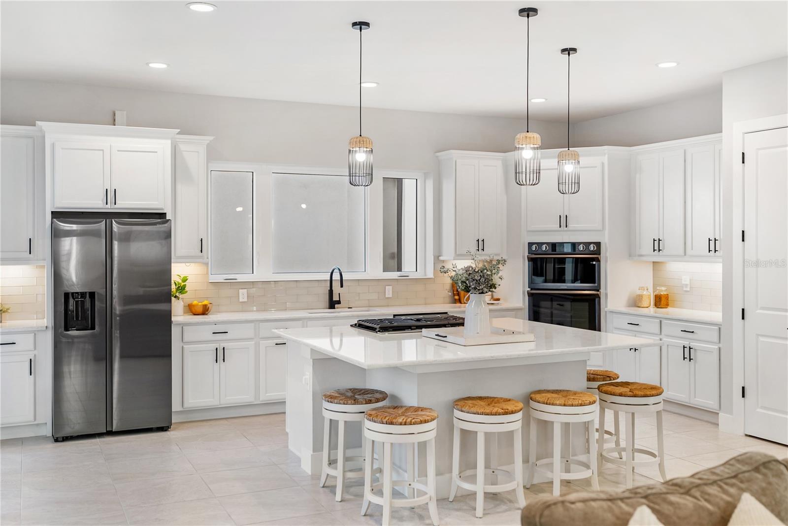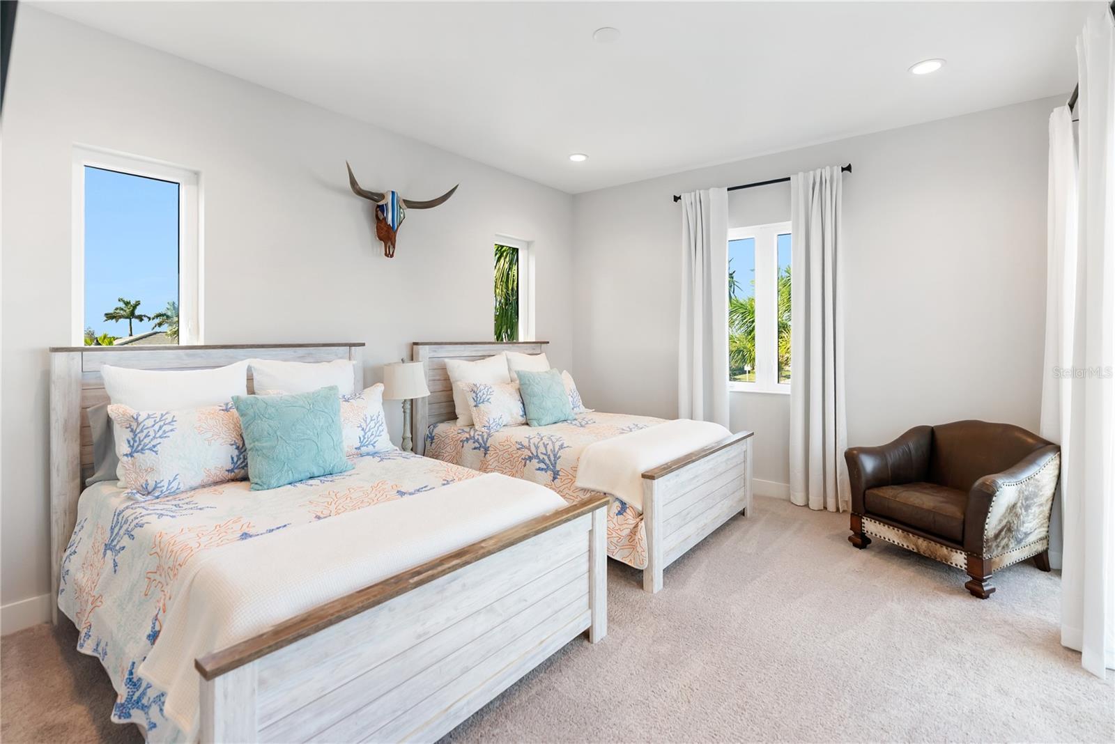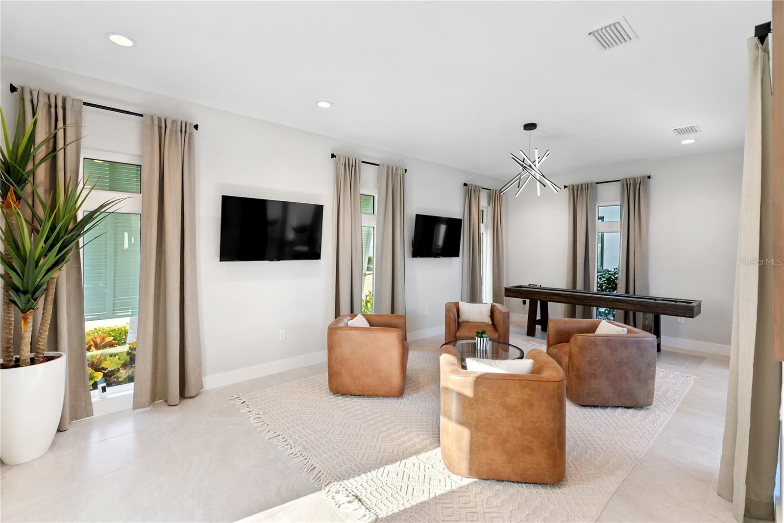 Experience intentionally designed coastal luxury in this two-story modern residence located within the prestigious Aqua Lagoon community, a gated enclave offering 24-hour guard service and exclusive access to a private four-acre resort-style beach and crystal-clear lagoon. Designed for effortless indoor-outdoor living, this thoughtfully planned home offers exceptional privacy with no neighboring homes overlooking the pool or courtyard. Spanning 3,916 square feet, the residence features four bedrooms, four full baths, a loft, and an expansive bonus media room, with flexible spaces allowing conversion into up to six bedrooms to suit a variety of lifestyles. A highly desirable first-floor bedroom provides ideal accommodations for guests, multigenerational living, or a private retreat near a full bath. Upon entry, soaring ceilings and an upgraded custom staircase set the tone, complemented by spray foam insulation and high-end contemporary finishes throughout. The home is structurally designed to accommodate a future elevator, with the current shaft space utilized for additional storage. The heart of the home centers around a private interior courtyard with a saltwater pool and custom waterfall, designed to seamlessly connect indoor and outdoor spaces. Double doors from the kitchen and downstairs flex or media space open directly to the pool, enhancing flow for everyday living and entertaining. The chef’s kitchen is outfitted with premium appliances, quartz countertops, a smart double oven, microwave, solid wood cabinetry, a pantry closet, and a large island with natural gas cooktop featuring a rising vent system, all overlooking the light-filled living area. A formal dining area captures pool views, and the expansive media or flex room offers additional versatility. The first floor also includes a full bath with direct pool access and a sitting nook beneath the staircase. Upstairs, multiple bedrooms feature private balconies overlooking the courtyard and pool. The primary suite offers its own balcony, extended walk-in closet, and spa-inspired bath with dual vanities, soaking tub, and oversized walk-in shower with dual shower heads. One secondary bedroom includes an en suite bath, while another is located near an additional full bathroom, along with a second-floor laundry room. Additional upgrades include UV lighting in both HVAC systems and a hospital-grade whole-home water filtration system. The epoxy-finished three-car garage includes a rare third flex bay ideal for a golf cart, storage, or extra vehicle, plus overhead storage. Ideally positioned near IMG Academy, IMG Golf and Country Club, Anna Maria Island, Cortez Village, Sarasota Bradenton International Airport, and the beaches of Longboat Key, Aqua Lagoon also offers convenient access to UTC and St Armands Circle. This property presents an exceptional opportunity as a primary residence, luxury Florida retreat, or annual rental investment. Skip the wait for new construction and schedule your private showing of this fully furnished coastal residence today.