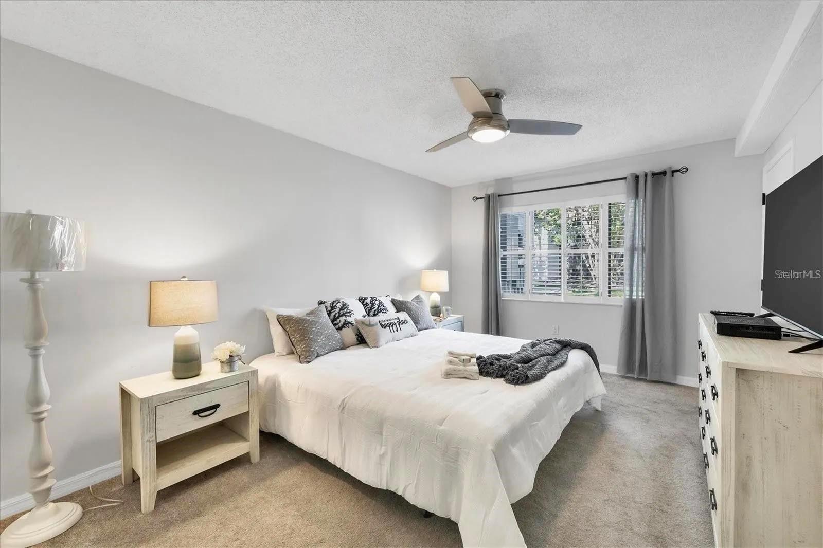 - Ceiling Fans(s), Eat-in Kitchen, Open Floorplan, Primary Bedroom Main Floor, Solid Surface Counters, Solid Wood Cabinets, Split Bedroom, Thermostat, Walk-In Closet(s), Window Treatments