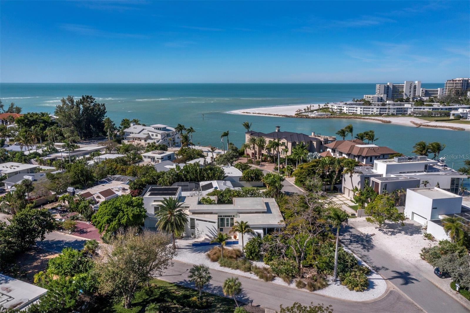 An icon of modern design in the style of the world-renowned Sarasota School of Architecture, 1235 Center Place combines award-winning pedigree with exceptional luxury in a setting that is as coveted for its natural beauty and access to amenities as for its storied mid-century and modern estates. Known as the Light Box House for its distinctive angles and use of glass walls to showcase courtyard and exterior views, this home was custom built in 2012 by the current owners to foster both idyllic privacy and elevated hospitality. The home and architect Jonathan Parks have been widely celebrated for its design, winning the AIA Tampa Bay Merit Award for Architecture and the Grand Aurora Award for a custom home, with features in the Herald-Tribune’s Style Magazine, Sarasota Observer, and HomeDSGN magazine. Occupying the corner lot of Westway and Center and two doors away from the famed Umbrella House, the home is thoughtfully oriented around a central pool that serves as a focal point for both reflection and recreation. Stretching between north and south wings that gently delineate spaces for private retreat and open entertaining, 3,700 A/C square feet encompass three bedrooms with three and a half bathrooms, an office, an open concept gourmet kitchen and adjacent dining and living space, all purposefully positioned to capture optimal light and accentuate the interplay of built features with the tropical landscape. An elegant contrast to the brilliant sky and foliage outside, the interior is a refined gallery that meticulously balances walls of glass with solid surfaces for display and function, from art-hung walls to Caesarstone countertops. While complementing the mid-century style of surrounding homes, contemporary construction here offers the significant advantages of elevation for flood consideration, high-efficiency impact rated materials, and modern integrations including heated primary bathroom floor, motorized window coverings, Generac generator, LED landscape lighting, and more. Recent upgrades include two Carrier Infinity HVAC systems installed in 2025 and 2024. Lido Shores is coveted for its concentration of mid-century, modern, and post-modern homes, with masterpieces by Paul Rudolph, Carl Abbott, Don Chapell, and others renowned for their architectural influence. Serene and private but within minutes of St. Armands Circle and Downtown, this special island enclave offers immediate access to the tropical waters of Sarasota Bay and the Gulf and innumerable cultural amenities that include fine and performing arts, dining, and shopping.