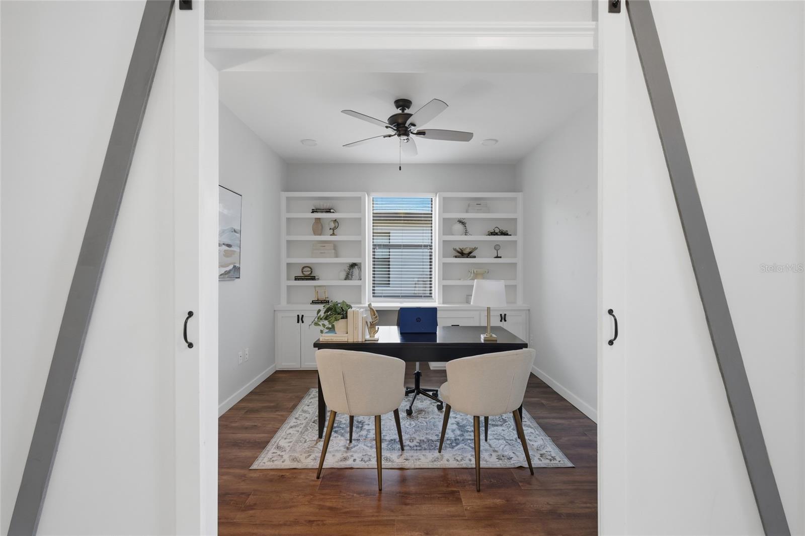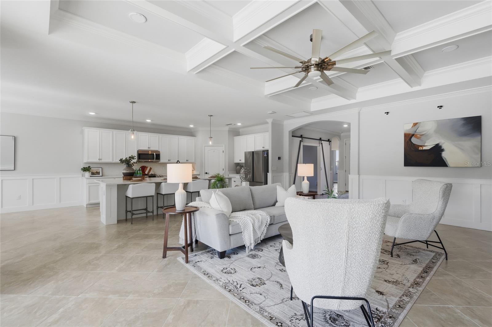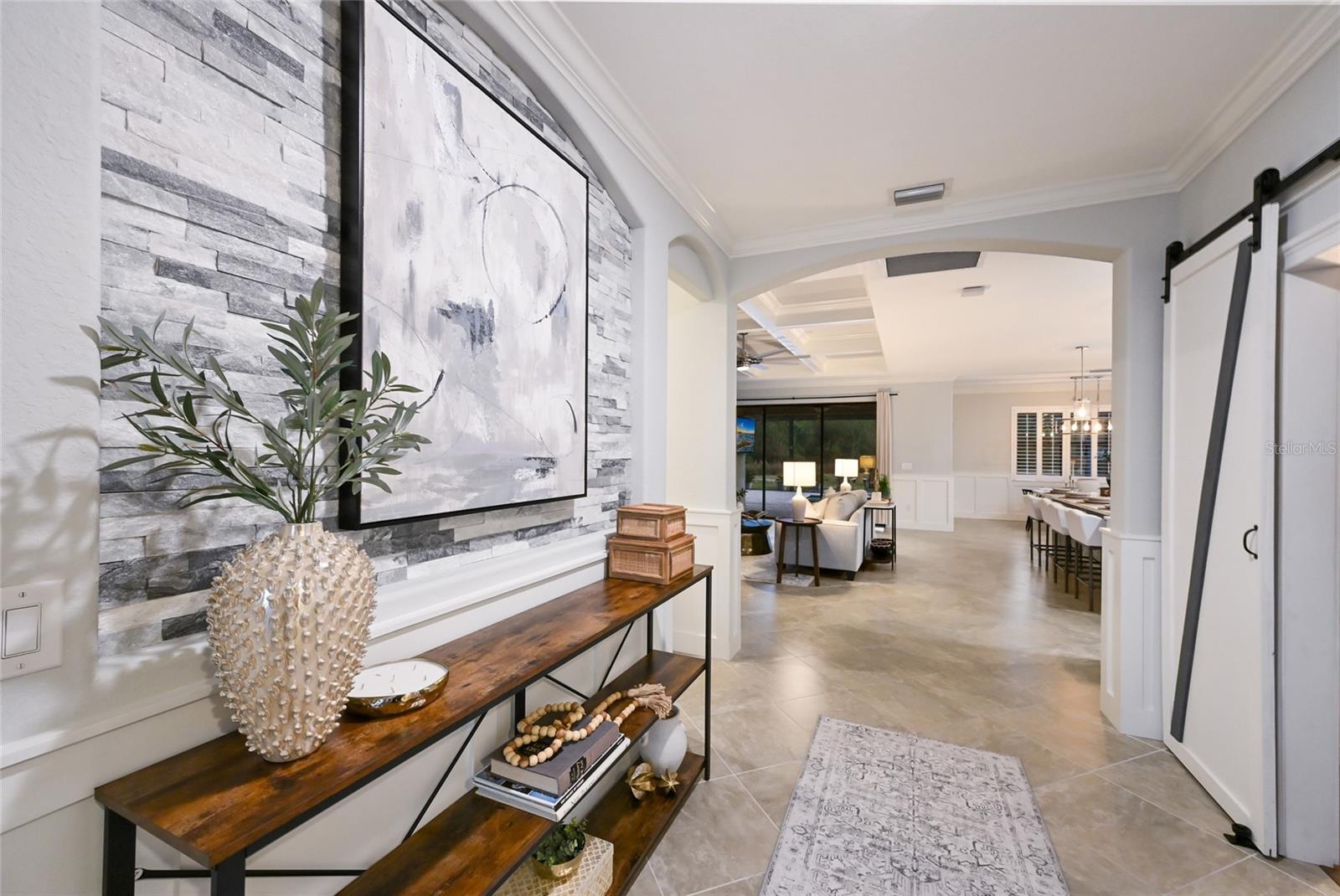 Prepare to be impressed by this STUNNING pool home on a beautiful pond in the highly sought after gated neighborhood of Copperleaf, located right on Lakewood Ranch’s doorstep! Meticulously cared for, this popular Summerville triple split floor plan features 3 bedrooms, a den/flex room, 3 full bathrooms, & a 3-car garage, as well as an incredible lanai with pool and spa overlooking a peaceful pond & conservation for the ultimate in privacy. This home's striking curb appeal will captivate you with its pavered driveway, lush landscaping, Mediterranean elevation & modern tile roof. A welcoming front porch brings you to the 8' double door entry, and inside you'll find a spacious & wide foyer adorned with board & batten walls & a beautiful architectural niche accented by stacked stone to showcase your favorite piece. A spacious bedroom is just off the foyer, with a full bathroom located just outside. Just beyond the foyer is your flex room with custom sliding barn doors, making this ideal to use as a home office, den, home gym, or even a 4th bedroom. A hallway beyond the foyer leads you to your open concept Gathering Room, kitchen, and dining room with modern chandelier. Your designer kitchen is PERFECT for entertaining & includes 42" cabinets w/crown molding, quartz counters, upgraded coil pull-down faucet, single bowl sink, SS appliances including NEW LG Microwave, subway tile backsplash, large corner pantry, & a HUGE extended island with board and batten accent. Your spacious gathering room features a gorgeous coffered ceiling, board & batten walls, and beautiful custom shiplap fireplace wall with mantle. And just wait until you see the backyard - wide triple sliders open to your GORGEOUS, extended, screened-in lanai with panoramic screen and salt water pool and spa that overlooks a magnificent pond. Your heated pool & spa include a BRAND NEW Jandy pump and BRAND NEW heater, and pavers just beyond the pool cage create the perfect space for a future fire pit with tranquil nature views. Privacy hedges and tropical landscaping including lush palm trees surround the sides of the lanai, making this your own true private oasis. Situated at the back of the home is your spacious Primary Retreat, complete with coffered ceiling, dimensional custom accent wall, rich bamboo floors, & sliders that lead out to the lanai. The spacious en-suite Primary Bath includes 2 vanities & sinks, upgraded faucets, walk-in shower with glass enclosure, garden tub, 2 large walk-in closets each with built-ins, & water closet. Just off the foyer, a hallway leads to the laundry room and private guest suite. The laundry room is well equipped with an LG washer and dryer, utility sink, and convenient pass-through to the garage, while the guest suite offers its own en-suite bath w/walk-in shower, stone-topped vanity with modern faucet, and added shelving. Other notable upgrades include NEW interior paint, security system with sensors on all doors & windows, plantation shutters, luxury vinyl plank flooring in den & secondary bedrooms, water softener, epoxy floors & overhead storage racks in the garage, & more. Situated in highly desired Copperleaf, enjoy the maintenance free Florida lifestyle with NO CDD fees. HOA fee includes access to the Community Pool, Spectrum Internet, Cable TV, Mowing & Landscaping. Prime location with quick & easy access to 64, LWR Blvd, I-75, & the Ft. Hamer boat ramp, with world class dining, shopping, beaches, golf courses, & recreation nearby.