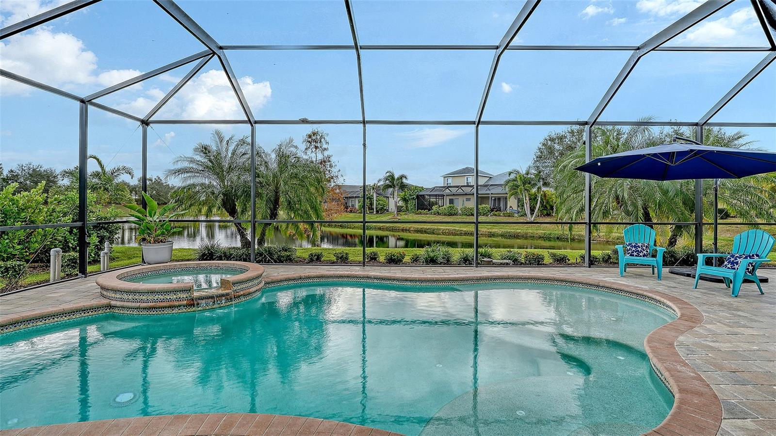 Under contract-accepting backup offers. This 3 bedroom, 3 full bath home includes an oversized den/office, a gas heated pool and spa, water view, and tastefully stunning upgrades. The kitchen features 42” cabinetry, quartz countertops, a tile backsplash, a single basin undermount sink, oversized drawers, stainless steel appliances, brand new LG refrigerator, a breakfast nook, and double glass French doors to the lanai. Interior features include tray ceilings, quartz countertops throughout, and LVP flooring in the guest bedrooms. The primary bedroom offers a tray ceiling, shiplap half walls, plantation shutters, access door to the lanai, and two custom walk in closets, and the ensuite bath includes shiplap accent walls, a chandelier, an oversized shower, a garden bath, and dual split vanities. The oversized den/office features bamboo flooring, a built in desk and cabinets, transom windows, a slider leading to the lanai, board and batten accent half walls, and a water view. The pool bath is located right off the pool and includes a shiplap accent wall, with the lanai entrance directly across from the pool bath. The laundry room is customized with two rows of upper cabinets and a linen closet. Exterior features include a front porch, a pavered lanai, exterior surge protetor, and gas-heated pool and spa with water view. ***HOA COVERS: Gated Community, Community Manager, Common Grounds Maintenance Trimming & Irrigation, Park & Pavilion, 2 Dog Parks, Playground & Splash Pad, Tennis Courts that sub as Pickleball Courts, and Sports Fields. ***LOCATION: Centrally located. Just outside the gates are A+ schools, Gullett Elementary, Lakewood Ranch High School, and Mona Jain Middle School, LECOM, & Manatee Tech East Campus. Minutes to shopping, restaurants, gyms, salons, bars, etc. Minutes to downtown, Sarasota International Airport, the top rated beaches in the country, UTC Shopping.