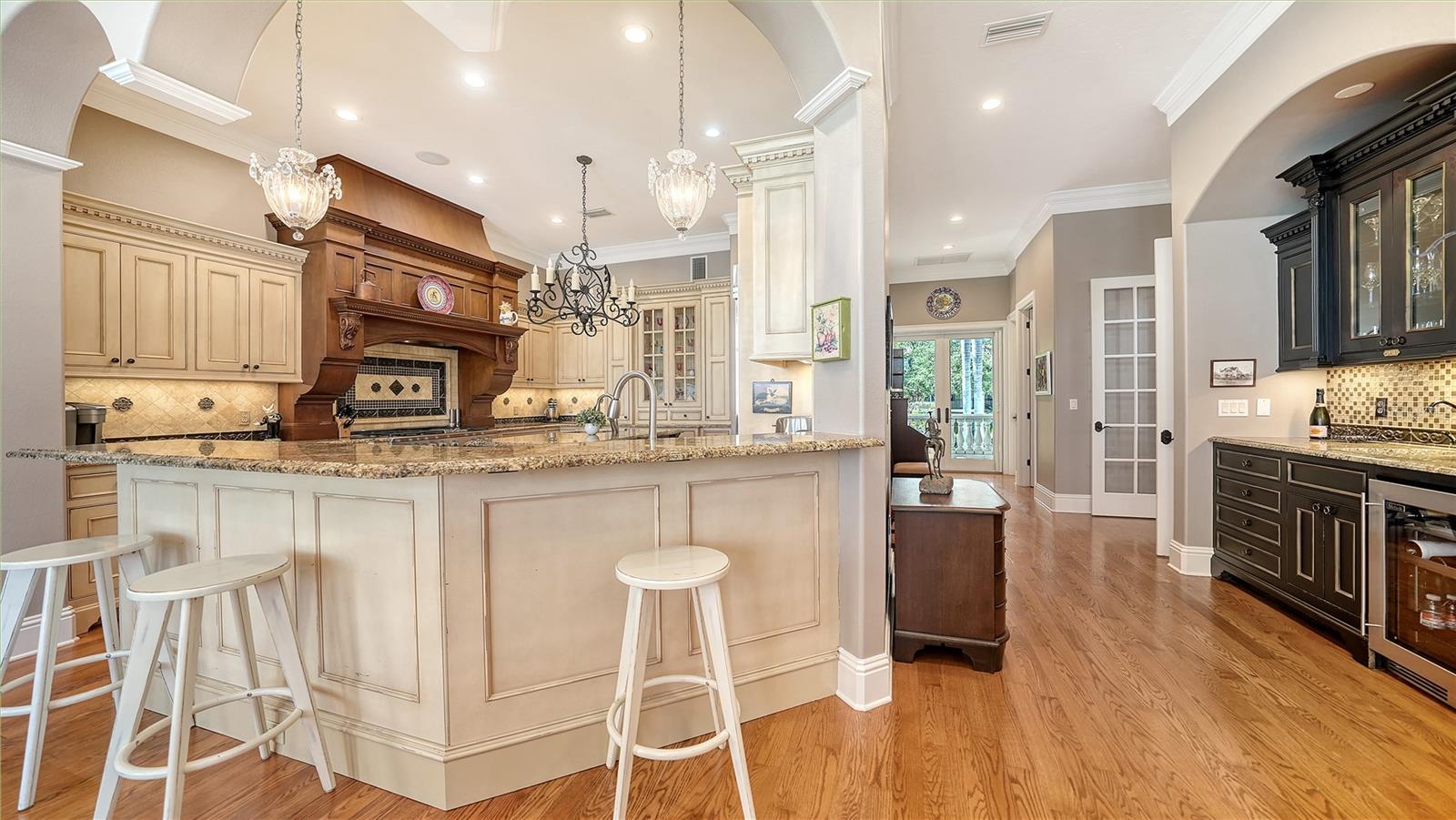 - Built-in Features, Cathedral Ceiling(s), Ceiling Fans(s), Crown Molding, Eat-in Kitchen, High Ceilings, Kitchen/Family Room Combo, Living Room/Dining Room Combo, Primary Bedroom Main Floor, Solid Wood Cabinets, Split Bedroom, Stone Counters, Thermostat, Vaulted Ceiling(s), Walk-In Closet(s), Wet Bar, Window Treatments