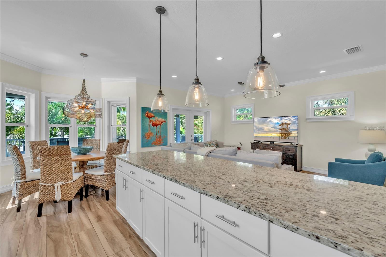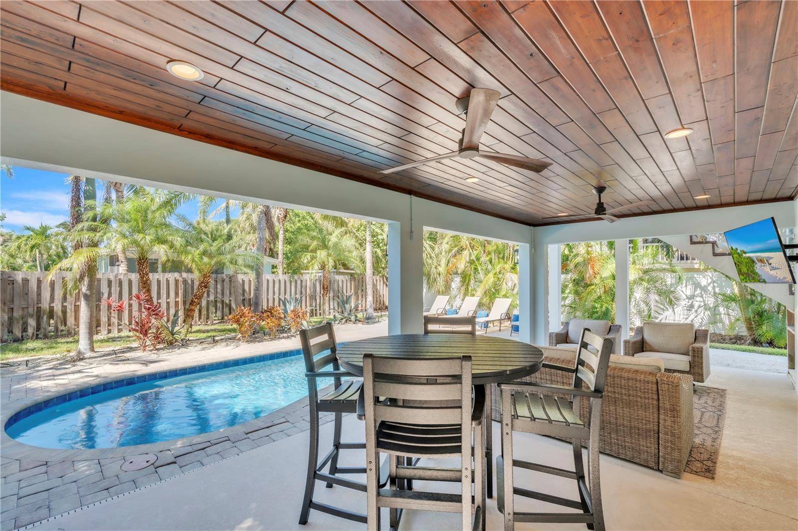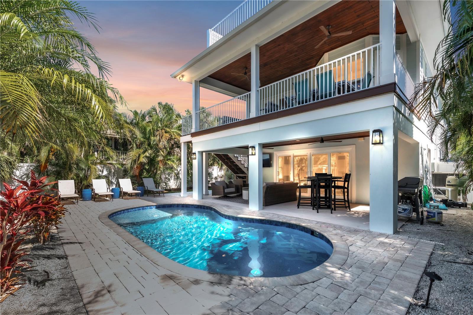 Perfectly placed on a quiet street, this 3BD/2BA elevated island home blends coastal charm with practical comfort, making it equally suited for personal enjoyment or continued success as a vacation rental. The open concept layout invites relaxed living, with a bright kitchen featuring granite counters, stainless steel appliances, and a large breakfast bar that flows effortlessly into the living and dining areas. French doors open onto a covered balcony overlooking swaying palms. The primary suite offers a peaceful escape with its own private balcony and an ensuite bath complete with a double vanity and spacious walk-in shower. Two additional bedrooms are thoughtfully positioned to provide privacy and comfort for guests. On the ground level, you'll find a bonus space off the garage, offering added flexibility to suit your needs. The tropical backyard delivers that island lifestyle with a sparkling heated pool and shaded outdoor seating area. Sold turnkey, this home is ready to enjoy from day one. Tucked within a weekly rental zone and just moments from local shops, restaurants, and only steps to the beach, it checks all the boxes for coastal living with income generating potential.