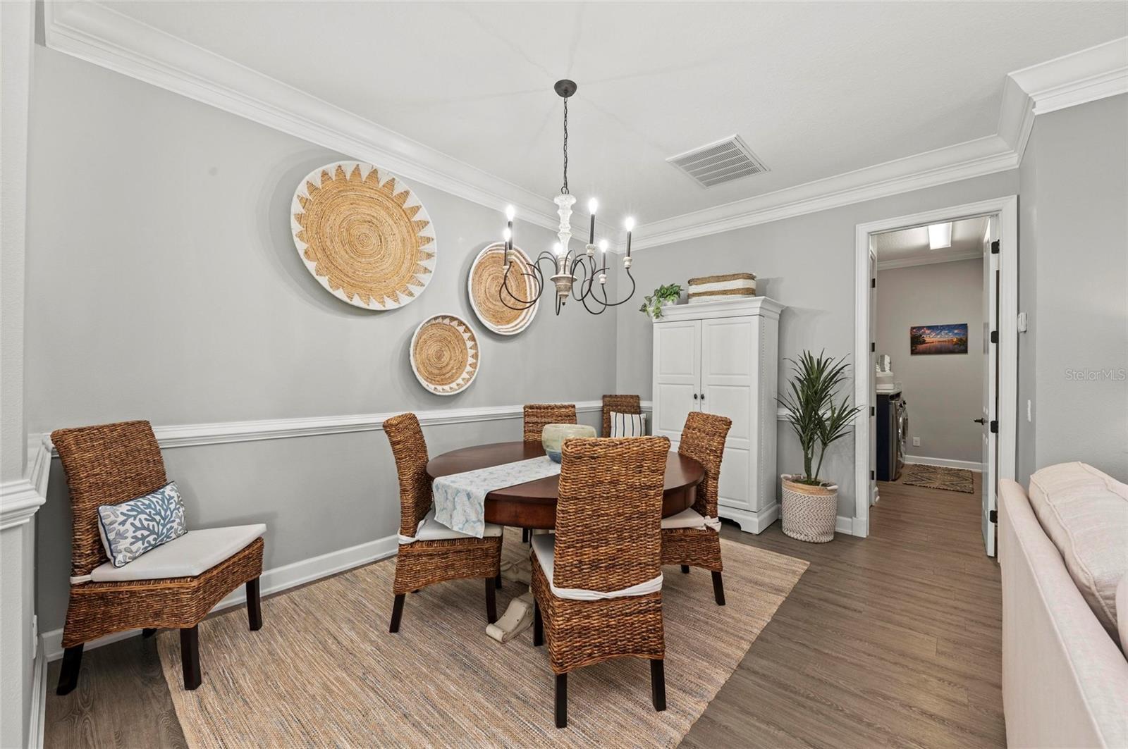 - Built-in Features, Cathedral Ceiling(s), Ceiling Fans(s), Crown Molding, In Wall Pest System, Living Room/Dining Room Combo, Open Floorplan, Primary Bedroom Main Floor, Solid Wood Cabinets, Split Bedroom, Stone Counters, Thermostat, Walk-In Closet(s), Window Treatments