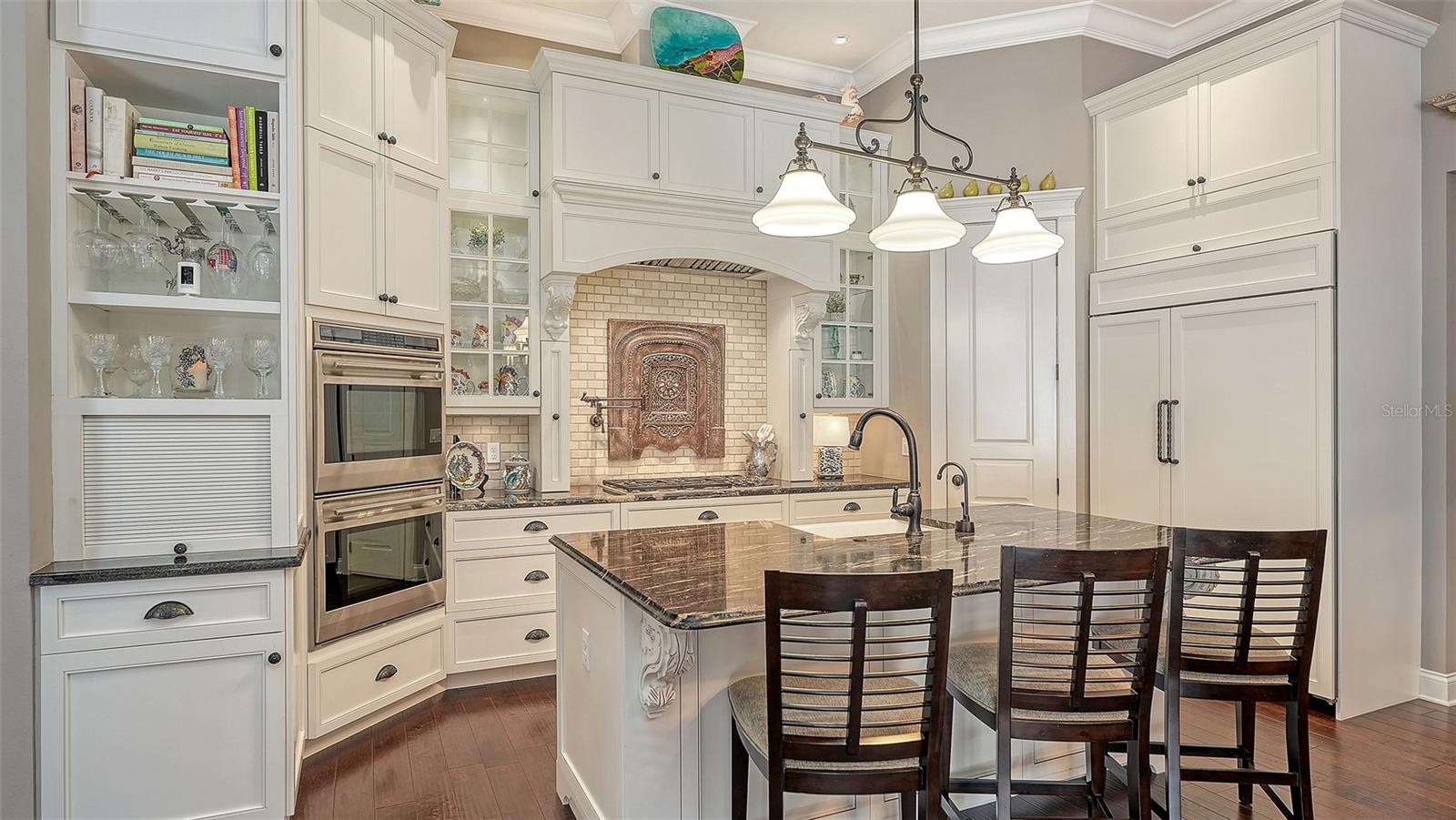 Simply stunning custom residence crafted by Todd Johnston, set within a private, oversized homesite west of the Trail. Designed for effortless one-level living, this refined home offers an open, flowing floor plan with three spacious bedrooms—each with an en-suite bath—plus a well-appointed powder room. Warm and inviting interiors feature rich wood floors throughout and generous living spaces ideal for both everyday comfort and elegant entertaining. A handsome study just off the living room showcases custom woodwork and built-ins, creating a distinguished retreat for work or reading. The gourmet kitchen is a standout, appointed with extensive cabinetry, a large center island, paneled appliances, gas cooktop, double ovens, a full-size wine refrigerator, and an oversized walk-in pantry. Expansive sliding glass doors open to a screened patio and pool area, seamlessly blending indoor and outdoor living. Designed with entertaining in mind, the outdoor space includes a built-in gas grill and refrigerator, a cozy gas fireplace, and a heated pool and spa for year-round enjoyment. A private massage room just off the patio adds a spa-like touch rarely found. Additional highlights include a side-load 2.5-car garage with abundant storage, an impressive 26-foot elevation—among the highest in the area—and construction with the highest quality materials, including full impact windows and doors for comfort and peace of mind. Ideally located within easy walking distance to Southside Village and Southside Elementary School, this exceptional home offers privacy, quality, and convenience in equal measure. Truly a residence that is sure to please.