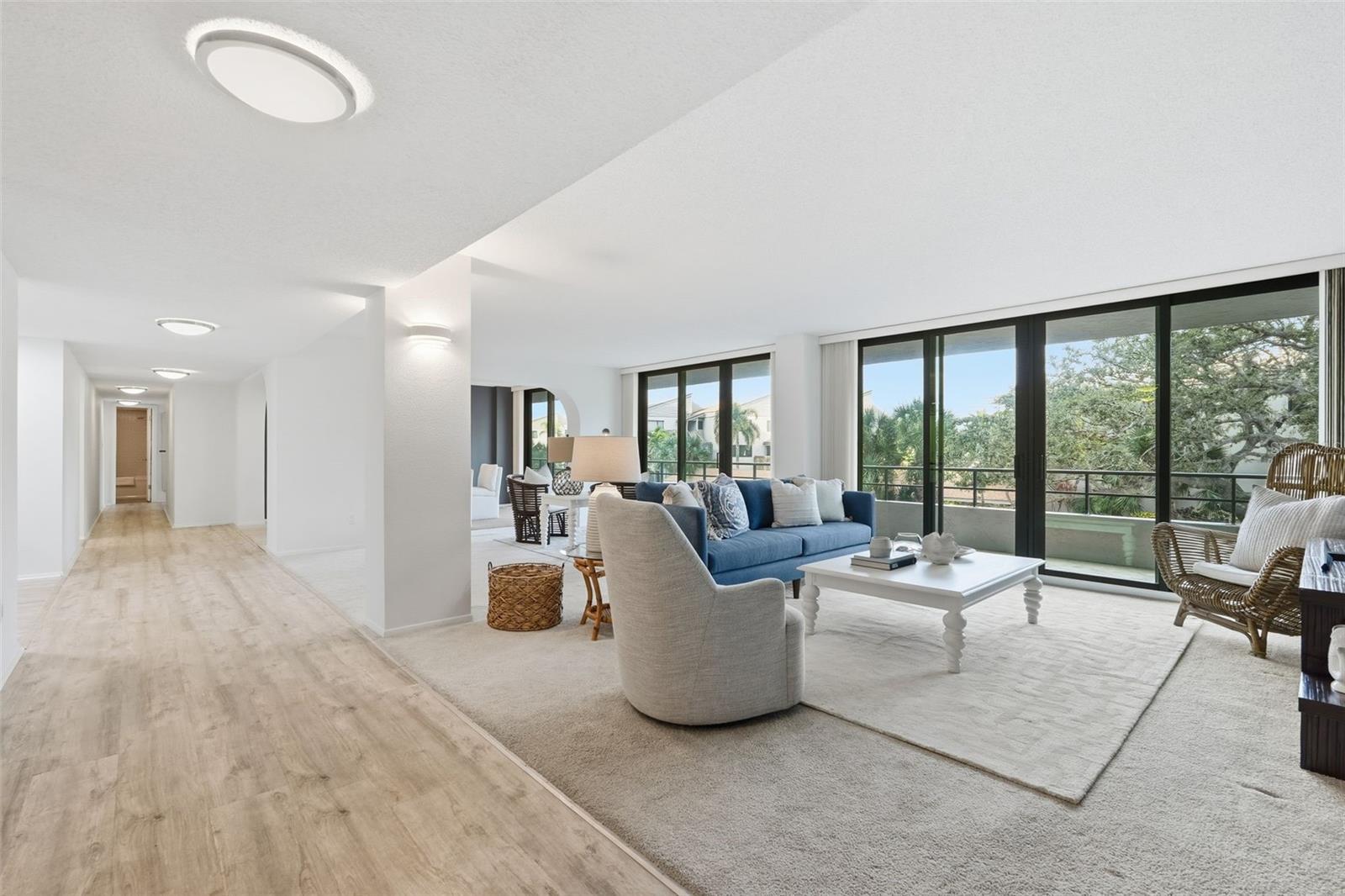 Deeded beach access, Intracoastal waterway frontage with boat dockage AND room for the whole family! Discover the epitome of coastal living in this fabulous three-bedroom, two-and-a-half-bath residence, boasting 2,358 square feet of interior space and an expansive balcony spanning the entire length of the home. Recently upgraded with $80,000 worth of high-impact hurricane sliders, the spacious floor plan offers multiple living and dining areas, with a split layout ensuring privacy. This is a real gem for investors as it is one of only eight 3-bedroom units in the building. At the Anchorage, owners and renters enjoy deeded, gated beach access right across the street, a canal with boat dockage and kayak/paddleboard launch, and beautiful sprawling park-like grounds overlooking the intracoastal waterway. Other amenities include a gated entrance, heated pool, fitness center, clubhouse, tennis and pickleball courts, shuffleboard courts and kayak racks. Onsite rental management and a one-week minimum rental make this community very popular with vacationers and savvy investors alike. Come see why The Anchorage is the place to be year-round on Siesta Key.