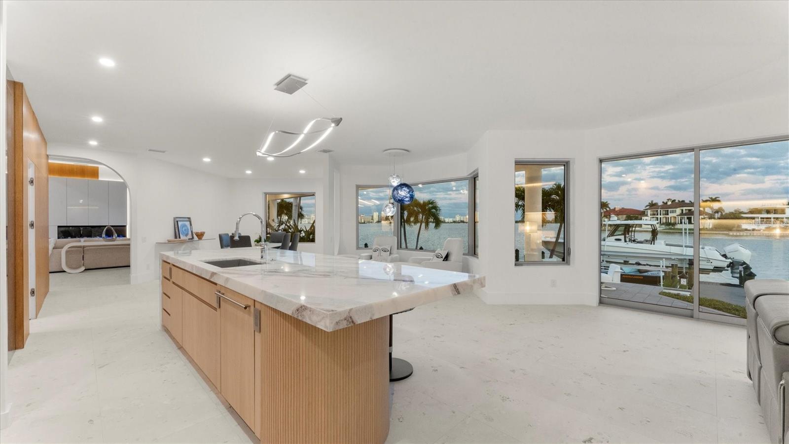 Perfectly positioned on coveted Robin Drive at the front of Bird Key, this fully reimagined bayfront residence captures Sarasota living at its finest. Originally built in 1996 and completely remodeled with exceptional attention to detail, the home blends timeless elegance with clean, modern lines and elevated materials selected for beauty and performance. Elevated above floodplain with a ground level over 10 feet the panoramic vistas span Sarasota Bay, the downtown skyline, and the iconic Ringling Bridge, presenting a stunning scene from sunrise through sunset. As evening falls, city lights shimmer and the Ringling Bridge illuminates, casting a soft sparkle across the Bay—a timeless view that never loses its allure. Set on protected waters ideal for boating, the property offers 120 feet of deep-water frontage at the junction of Bird Key’s Pompano Pass waterway, with unobstructed access to Sarasota Bay, Big Pass, and the Gulf —an exceptional opportunity for boating enthusiasts. Inside, more than 4,000 square feet of thoughtfully designed living space unfolds across two light-filled levels. Soaring ceilings up to 14 feet and expansive walls of glass frame stunning bay views throughout. The front sitting room features a statement fireplace wall and flows seamlessly into the dining area, gourmet kitchen, and family living space—perfect for entertaining and everyday living. The chef’s kitchen offers custom cabinetry, generous storage, a well-proportioned center island, and a discreet back kitchen and pantry with additional sink, appliances, and prep space. Premium Sub-Zero, Wolf, Bosch, and Miele appliances are complemented by sleek pop-up outlets. A nearby powder bath provides convenient access to the pool. Sliding glass doors open to an expansive pavered pool deck for seamless indoor-outdoor living. The primary suite, privately located on the main level, features direct pool access, dual walk-in closets, a dressing area, and a luxurious spa-inspired bath with dual vanities, a seated vanity, soaking tub, and designer lighting. A spacious office and second powder bath are also located nearby. Upstairs are two en-suite bedrooms with bay views and a versatile bonus room ideal for guests or media use. Outdoors, enjoy a private waterfront oasis with a sun-drenched deck, pool, heated spa, and stone steps leading to the bay. The newly constructed seawall and Trex dock include fish and dock lights, a 24,000-pound boat lift, and kayak and jet ski lifts. Additional features include a circular driveway, three-car garage with Tesla charger, new metal roof, and irrigation well. Located in prestigious Bird Key, residents enjoy proximity to downtown Sarasota and St. Armands Circle, with optional membership at the Bird Key Yacht Club and nearby Bird Key Park. This is a rare offering of refined waterfront luxury in one of Sarasota’s most sought-after bayfront locations.