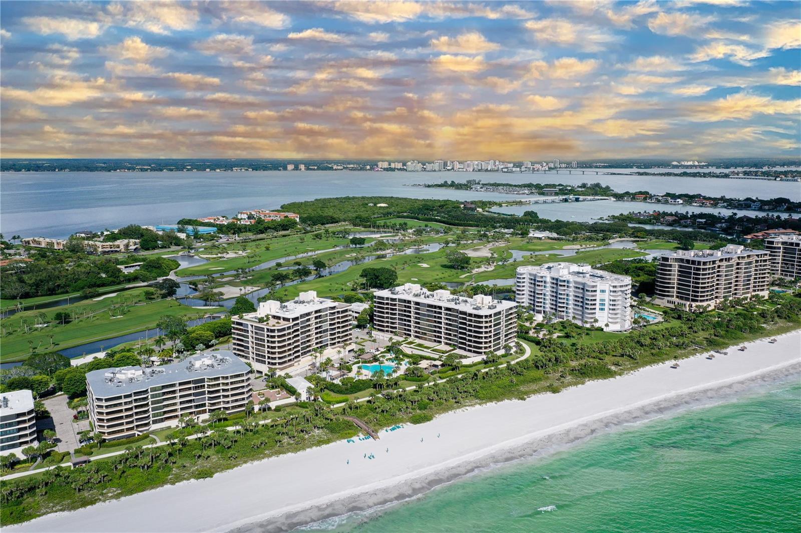 Bright, spacious and beautifully maintained, this 3BR/2.5BA fifth-floor residence at The Sanctuary offers refined coastal living in one of Longboat Key’s most sought-after gated communities, ideally positioned on the island’s desirable southern end. Upon entry, walls of floor-to-ceiling glass sliders immediately draw your eye to sweeping panoramic views of the Sarasota city skyline, shimmering Sarasota Bay and the emerald fairways of the Links golf course. By night, downtown’s twinkling lights create a dramatic and ever-changing backdrop. The popular Brittany floor plan features recessed lighting, crown molding, 18-inch tile flooring throughout the main living areas and a tiled open terrace perfectly suited for sunrise coffee or evening cocktails. The kitchen has been opened to enhance flow and functionality, offering solid-surface countertops, a center island, tile backsplash and an eat-in area framed by a wall of glass. Double doors lead to the oversized primary suite, filled with natural light and offering terrace access, a walk-in closet and a spa-inspired bath with soaking tub, walk-in shower and dual vanities. Wraparound terraces further enhance the indoor-outdoor lifestyle, making this residence ideal for both everyday living and entertaining. The Sanctuary delivers an unparalleled resort-style experience with 1,200 feet of pristine white-sand beachfront, private boardwalk beach access, a heated Gulf-side pool with 25-meter lap lane, outdoor whirlpool spa and beachfront gazebo. Additional amenities include two lighted Har-Tru tennis courts, a state-of-the-art fitness center, saunas, an entertainment room, on-site management, 24-hour guard-gated security and coveted under-building parking. Pet-friendly with restrictions. Nestled behind the gates of the exclusive Longboat Key Club, this exceptional residence offers the perfect blend of luxury, privacy and breathtaking views—truly one of Longboat Key’s premier addresses.