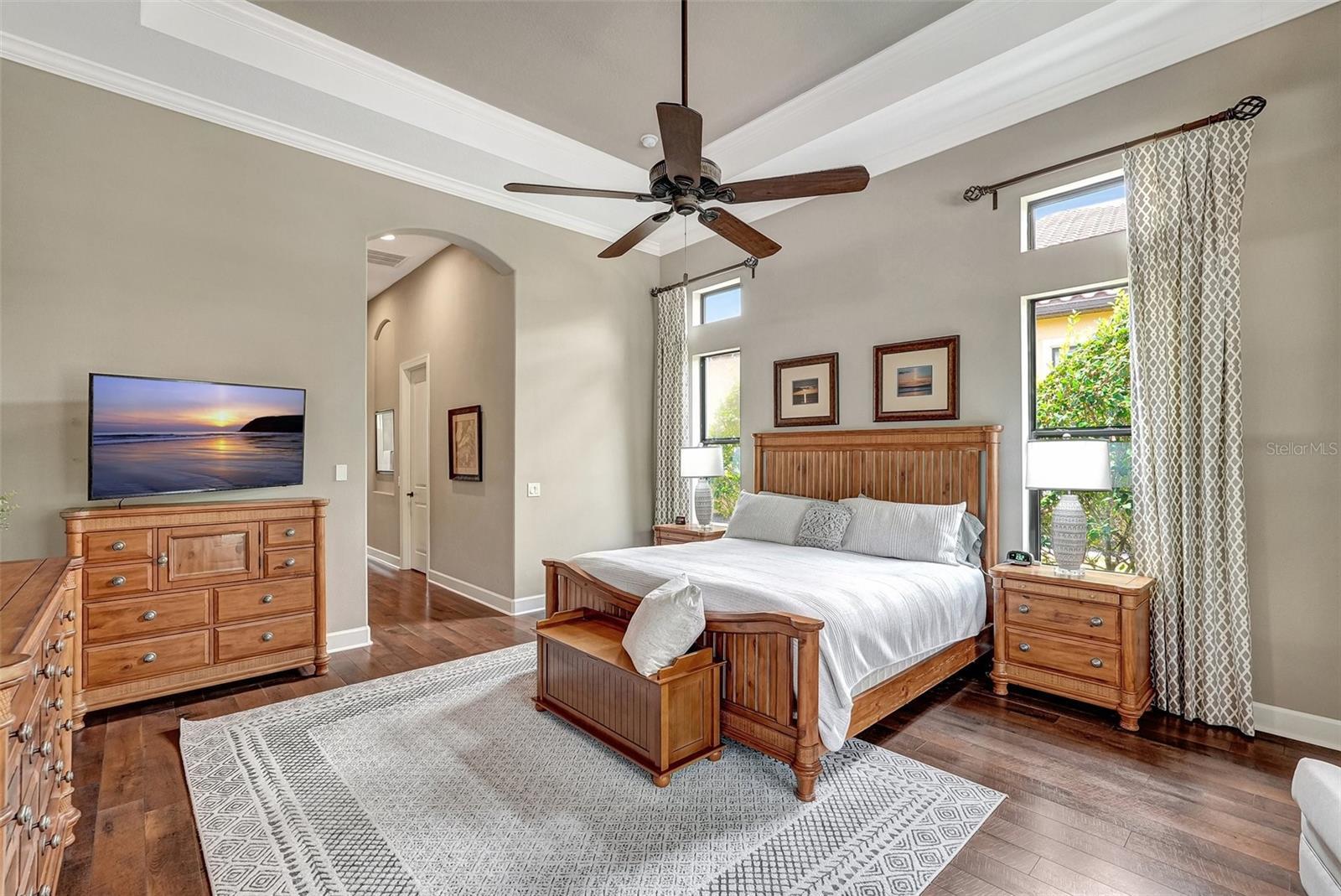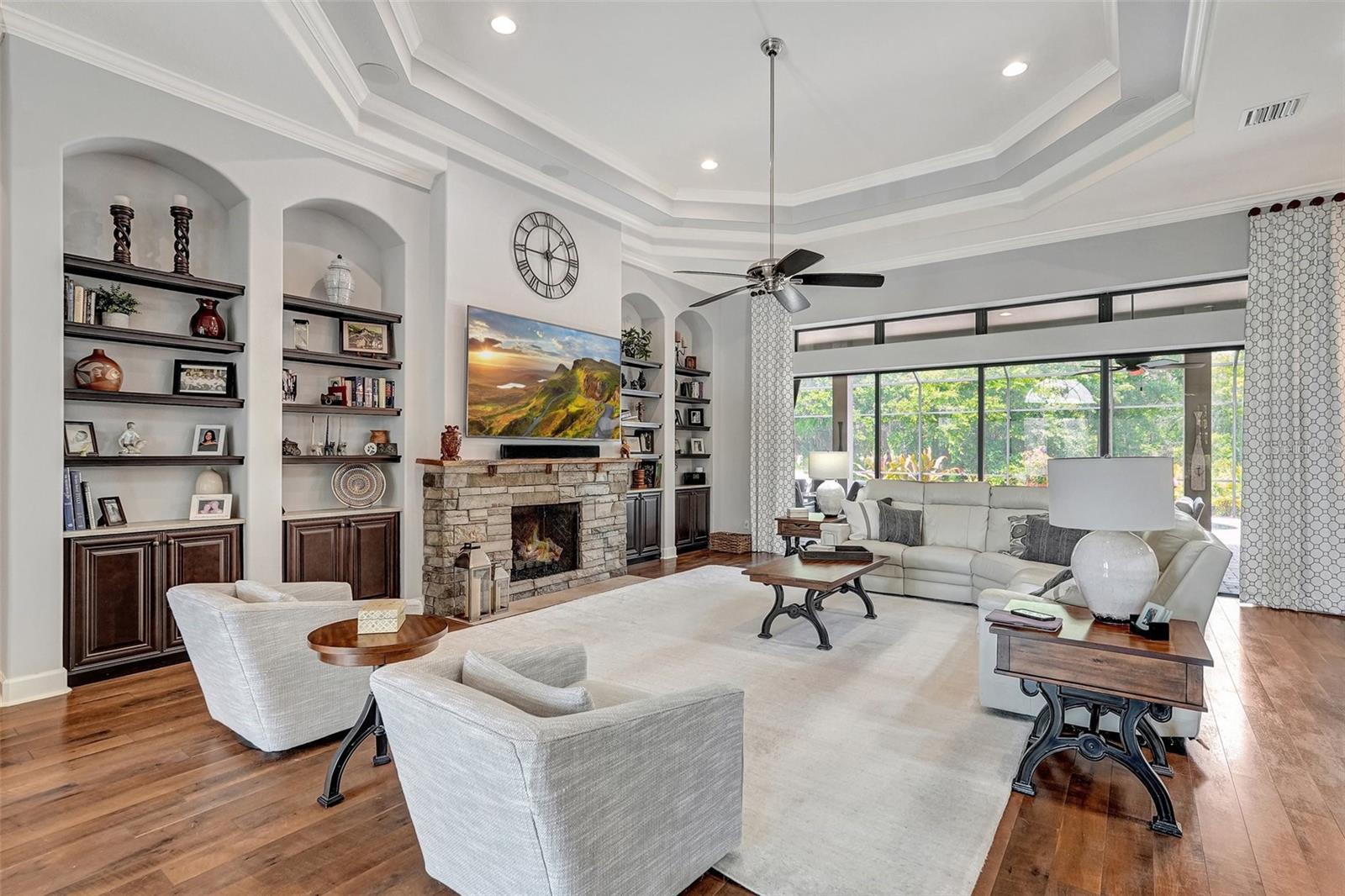 - Built-in Features, Ceiling Fans(s), Crown Molding, Open Floorplan, Split Bedroom, Stone Counters, Thermostat, Tray Ceiling(s), Walk-In Closet(s), Window Treatments