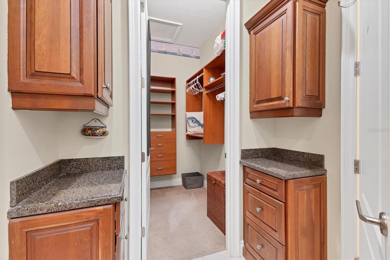 - Built-in Features, Ceiling Fans(s), Central Vaccum, Crown Molding, High Ceilings, Living Room/Dining Room Combo, Open Floorplan, Solid Surface Counters, Solid Wood Cabinets, Split Bedroom, Stone Counters, Thermostat, Walk-In Closet(s), Window Treatments