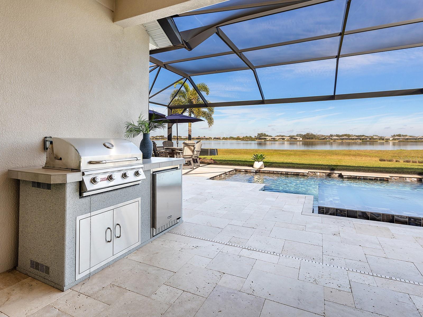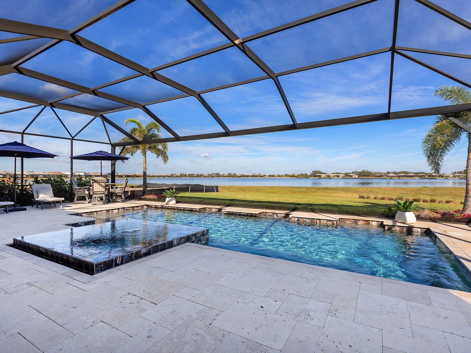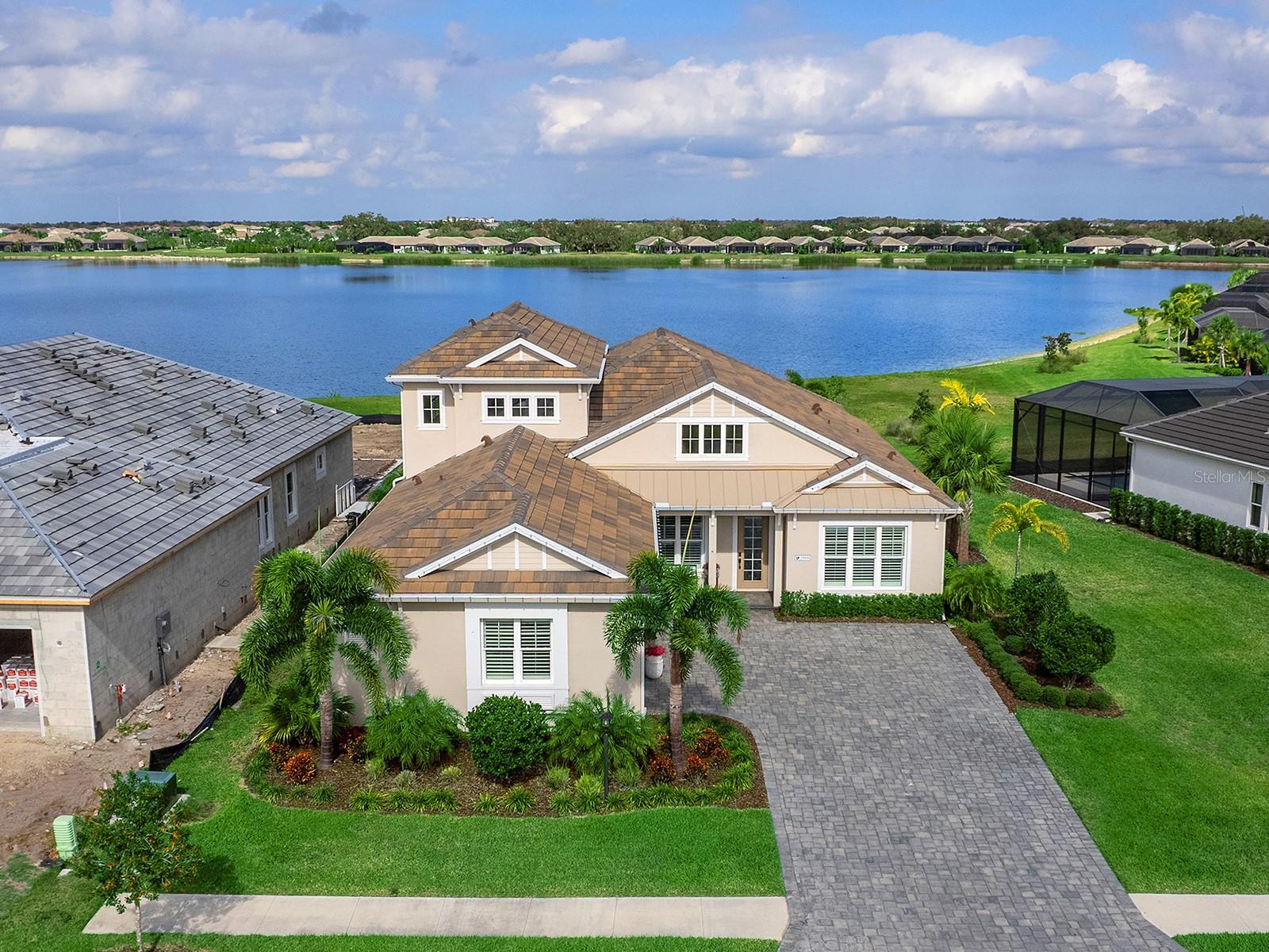 Elegant former model home filled with resplendent upgrades on a lakeside setting could be yours! This 2023 built model home offers every upgrade available on a premium homesite on Lake Ibis in Lakehouse Cove, just minutes from Waterside. This home’s 3,500 SF is brimming with luxurious upgrades and modern style including engineered hardwood flooring, custom coffered ceilings, feature walls, designer light fixtures, 2025 window shades and plantation shutters, and a warm blend of textures and colors throughout. From the charming front porch you’re welcomed home with instant views of the lake from 9’ impact sliding glass doors. The central great room is the perfect place to gather, centered on a spectacular custom feature wall with fireplace, glass display shelving, and custom wood entertainment niche design. The adjacent formal dining room is flexible for upscale dinners to casual weeknights. Entertaining outdoors is just as delightful on the travertine lanai with views of Lake Ibis through the panoramic screen enclosure and surrounded by 2025 upgraded landscaping, covered entertaining area with ceiling fan, and 2025 outdoor kitchen including stainless steel Bull bar fridge and 30” grill. The heated pool and spa is the ideal place to take the northern views over the lake, and also includes water features, sunshelf, and 360 degree spill edge on the spa. Inside, chef’s will love the modern design of the kitchen with warm wood textured cabinetry on the perimeter and smart espresso cabinets on the island, counter-to-ceiling white beveled backsplash, large modern pendant lights, quartz counters, 2025 reverse osmosis system, and a stainless steel appliance suite by GE Monogram including a range with oven and gas burners, additional wall oven, microwave, refrigerator, and dishwasher. Extra storage is found in the custom butler’s pantry with wine refrigerator, coffee area, and floating shelving that’s connected to the spacious walk-in pantry with custom shelving. Even working from home is a joy at this residence with a lakeside rear study featuring frosted glass barn door for privacy, tray ceiling with uplighting, and impact sliders to the lanai. The nearby powder bathroom doubles as both a pool bath and a guest bath for even more functionality. The upscale custom finishes carry into the primary suite with coffered and shiplap ceiling, shiplap and mirrored feature wall, impact sliders with sparkling lake views, and dual walk-in closets. The spa-like en-suite bath showcases dual split floating vanities, designer wallpaper, and an oversized walk-in shower with multiple showerheads and frameless glass enclosure. Guests have the ultimate choices in privacy, with one guest bed with en-suite bath on the main level, and a second guest bedroom with adjacent bath on the upper level. Also on the upper level is the ultimate bonus room featuring a custom wet bar with wine refrigerator and floating shelves, custom ceiling, and custom designed feature wall. Additional spaces include a laundry with lots of cabinetry, mudroom entry, and 3-car side-loading garage. Peace of mind is ensured with impact windows and doors, 2025 Generac 24kw whole-house generator, and 2025 Generac surge protection. Lakehouse Cove offers the best amenities in Waterside with an upscale clubhouse, lakeside pool and spa, fitness center, playground, dog park, walking trails, tennis and pickleball courts, dock house for lake access and kayak storage.