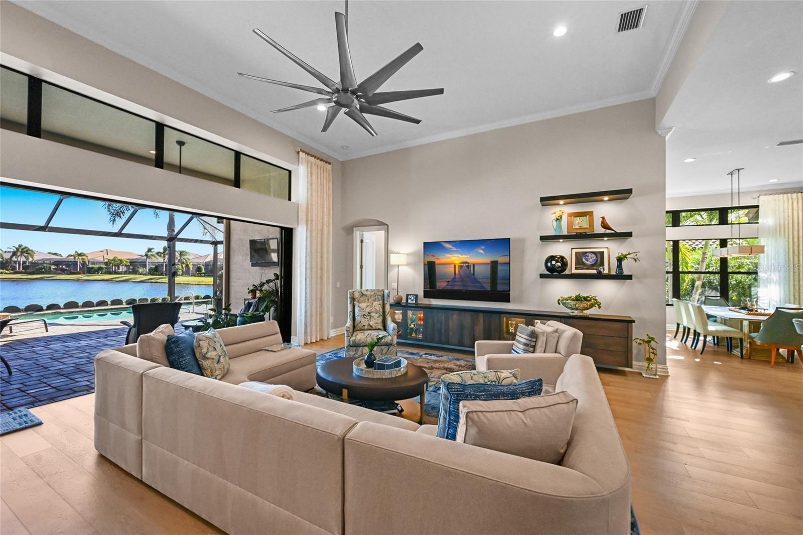 Under contract-accepting backup offers. Situated on a picturesque lake setting, this expanded Dolcetto 3 residence in the gated Lakewood Ranch community of Country Club East showcases sumptuous engineered wood flooring throughout, ideally proportioned indoor-outdoor living, soaring ceilings, architectural built-in detailing, and the addition of IMPACT WINDOWS. Altered from Cardel’s original floor plan, this four bedroom residence boasts 3,874 square feet of expansive one-story open living and a breathtaking outdoor living area with open and under cover spaces, pavered deck, Summer kitchen, PebbleTec heated saltwater pool/spa, panoramic clearview screen, and surrounded by premium landscaping and vistas. Seamlessly connecting this outdoor oasis to the oversized great room, kitchen and dining areas are disappearing glass doors revealing inspiring volume ceilings and built-in credenza with accent lighting. Meanwhile chefs will delight in the well-appointed gourmet kitchen with high-performance appliances, new 2026 refrigerator, reverse osmosis, sprawling granite counters, oversized island, wood cabinetry with pull outs, dovetail soft-close drawers, and customized walk-in pantry. Unwind in the elegant owner’s retreat on a private wing, offering direct lanai access, oversized dual-entry customized closet, plantation shutters, and a luxuriously appointed spa-like bath with separate vanities, inviting soaking tub, and invigorating shower. Family and guests alike will be right at home in this split bedroom floor plan with three additional guest suites all with customized walk-in closets and engineered wood flooring, one with its own private ensuite full bath, and the other two centered by an adjoining full bath. Off the home’s fourth full bath is a voluminous club room with built-in wet bar, double French doors, built-in credenza, and wood flooring all surrounded by windows boasting serene water views. Additionally, the residence offers a private study/den off the foyer with double French entry doors, wood flooring and crown molding. Other highlights of this all-encompassing 5,312 square foot residence includes a stunning laundry room with abundant cabinetry, quartz counters, pull outs and sink, a custom drop zone with built-in shelving and cabinetry, the addition of 8’ solid interior doors, addition of impact windows, remote hurricane cevlar screens on lanai, water softener, new outdoor sconce lighting, addition of batting insulation to interior walls of bedrooms 3 and 4, an oversized three car garage with electric car charger, attic stairs, storage cabinetry, storage room, and so much more. Country Club East provides its residents with the privacy of gated-community living, three community pools, and fitness center, all within a community known for its vibrant Lakewood Ranch lifestyle near dining, shopping, polo, golf, tennis, community events, Waterside, Centerpointe, and still close to the UTC area, the beaches of Sarasota, and, of course, in an A-rated school district near Out-of-Door Academy and just a few miles from IMG. Residents also have the non-mandatory option to become members of the Lakewood Ranch Golf and Country Club, which offers four championship golf courses, two clubhouses, tennis, pickelball, fitness center, heated pools, full social calendar and so much more.