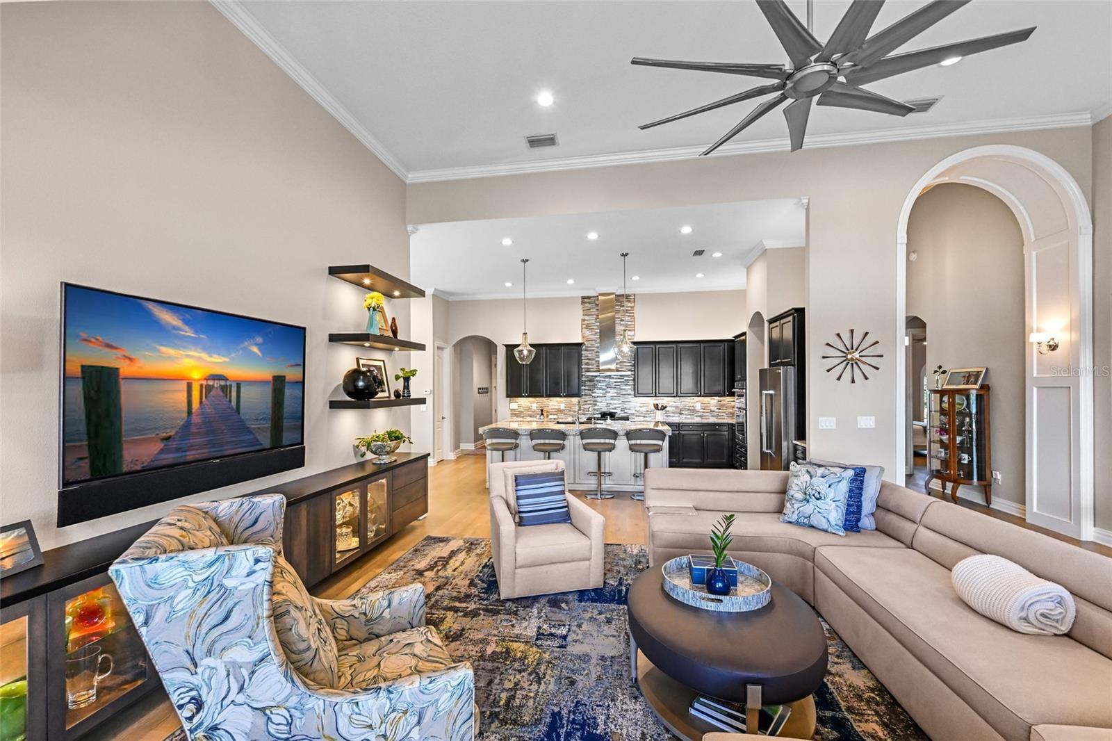 - Built-in Features, Ceiling Fans(s), Coffered Ceiling(s), Crown Molding, High Ceilings, Open Floorplan, Primary Bedroom Main Floor, Solid Surface Counters, Solid Wood Cabinets, Split Bedroom, Tray Ceiling(s), Walk-In Closet(s), Wet Bar, Window Treatments