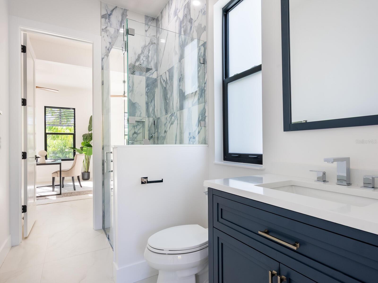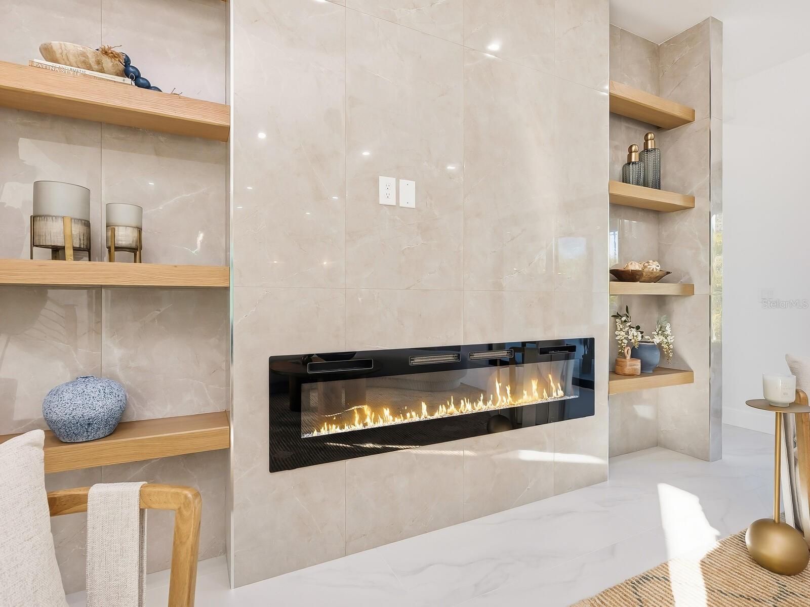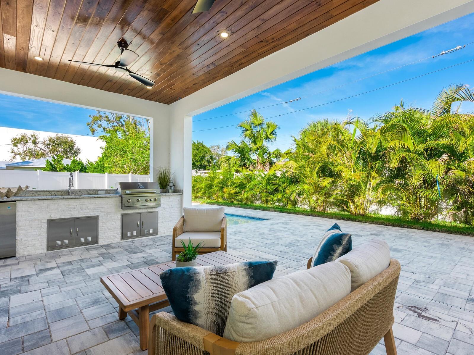 In the well-established Loma Linda Park neighborhood in Sarasota, this new construction, Divald Homes custom-built two-story home offers a blend of modern design and traditional elements. The home is ideally near downtown Sarasota, Siesta Key and Sarasota Memorial Hospital, with no deed restrictions or HOA fees. The home features four bedrooms and three baths, including a spacious primary suite on the main floor. The open-concept floor plan featuring a 24-by-48-inch modern floor tile throughout, hurricane impact sliding doors and windows offers a light-filled welcoming space ideal for entertaining. The main floor includes a gourmet kitchen, dining area, living room, private den/bedroom 4, primary suite with an ensuite bath and a dedicated laundry room. The chef’s kitchen is a centerpiece, showcasing Bosch appliances, an oversized island with waterfall quartz countertop, and custom floor-to-ceiling full-overlay cabinetry in a beautiful honey-stained wood tone. The living room is highlighted by a striking tile accent wall with custom wood shelving and modern designed 42-inch linear electric fireplace. The living room opens seamlessly to the lanai, complete with an outdoor kitchen, including a gas grill, refrigerator and sink. You will also enjoy the pool with sundeck, oversized outdoor patio and a beautiful backyard with lush native plantings. A convenient pool bath offers direct access from the lanai and the private den. The dining area is elegant and inviting, featuring a statement iron chandelier and a wall of windows overlooking the backyard. Just off the kitchen, the main-floor primary suite serves as a private retreat with a luxurious en-suite bath featuring a marble stone accent wall, a large walk-in shower with seamless glass enclosure, a sculptural slipper tub, double vanity with quartz countertops, natural wood cabinetry, LED mirrors and a spacious walk-in closet with custom built-ins. The laundry room is conveniently near the oversized two-car garage with 12-foot ceilings, large windows for natural light and direct access to the side yard. Upstairs, an ornate wrought-iron and hardwood staircase leads to two additional bedrooms, a beautifully finished guest bath and a versatile flex room ideal for a game room, study or guest accommodations. This thoughtfully designed home offers refined finishes, flexible living spaces and an exceptional location, ideal for enjoying the Sarasota lifestyle.