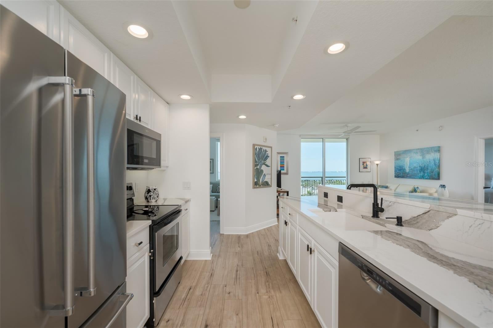 Indulge in elevated coastal luxury within this exquisitely redesigned two-bedroom, two-bath residence, ideally positioned in the heart of downtown Sarasota. Nearly every surface has been thoughtfully reimagined, resulting in a home defined by refined elegance, modern comfort and exceptional functionality. Upon entry, a luminous interior and open floor plan immediately draws the eye toward unobstructed westerly water vistas of Sarasota Bay. In the south tower on the eighth floor, this residence enjoys one of the building’s desired exposures, delivering expansive views and abundant natural light throughout the day. Sunlight moves gracefully across the interiors, enhancing volume, warmth and connection to the surrounding coastal landscape. Wide-plank flooring in a soft, neutral palette flows throughout the residence, creating visual cohesion and understated sophistication. High-end CoreTec luxury vinyl plank flooring offers the look of wood with durability and comfort underfoot, while accented baseboards elevate the finished presentation. The home has been fully renovated with designer light fixtures, ceiling fans, updated plumbing fixtures, and Hunter Douglas automatic blinds in the living room. Rich quartz countertops in the kitchen and baths establish a cohesive contemporary aesthetic, while the stainless-steel appliance package, including a French-style KitchenAid refrigerator, anchors the kitchen with beauty and performance. A walk-in laundry room is complemented by an additional flexible space just off the kitchen, ideal for organized storage or a generous pantry, a rarely found feature unique to this floor plan. The primary suite offers a walk-in closet and a thoughtfully designed en-suite bath featuring a large walk-in shower, linen closet and dual anti-fog LED mirrors. Both baths showcase custom tile work, glass shower panels, and creative niches reflective of the building’s architectural design. The second bedroom, equally suited as a den or office, is generously sized and features two windows with Sarasota Bay views, an attribute shared by every room in the residence. Alinari is a classic contemporary 18-story luxury high-rise offering refined plazas, fountains, a private recreational parcel and resort-style amenities. In 2025, enhancements were completed to the pool area, planters, movie theater, game room and catering kitchen. The building features key-card entry, a redesigned lobby, 24-hour on-site security and full front-desk services. In Flood Zone X and outside the floodplain, Alinari was engineered with reinforced concrete construction and deep pilings, with the lobby and guest parking elevated approximately 17 feet above base sea level. This residence includes a climate-controlled assigned storage unit and two garage parking spaces on the second and third levels, placing vehicles more than 30 feet above sea level. The association maintains strong reserves with no current or upcoming assessments. Amenities include on-site management, secured parking, a resort-style pool, hot tub, grilling area, club room, wine room, fitness center, saunas, business center, resident theater and on-site guest suites. Perfectly in Sarasota’s cultural district, Alinari is moments from world-class arts, dining, waterfront promenades and vibrant social experiences, with Sarasota Bay Park project underway with a new bayfront greenspace with pier and more. Downtown Sarasota living meets convenient coastal.