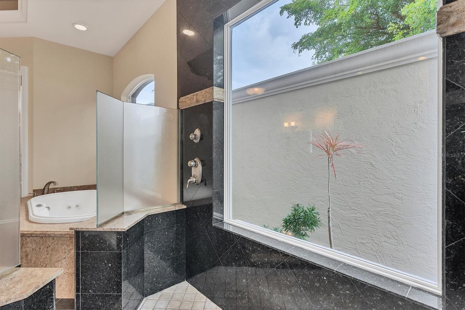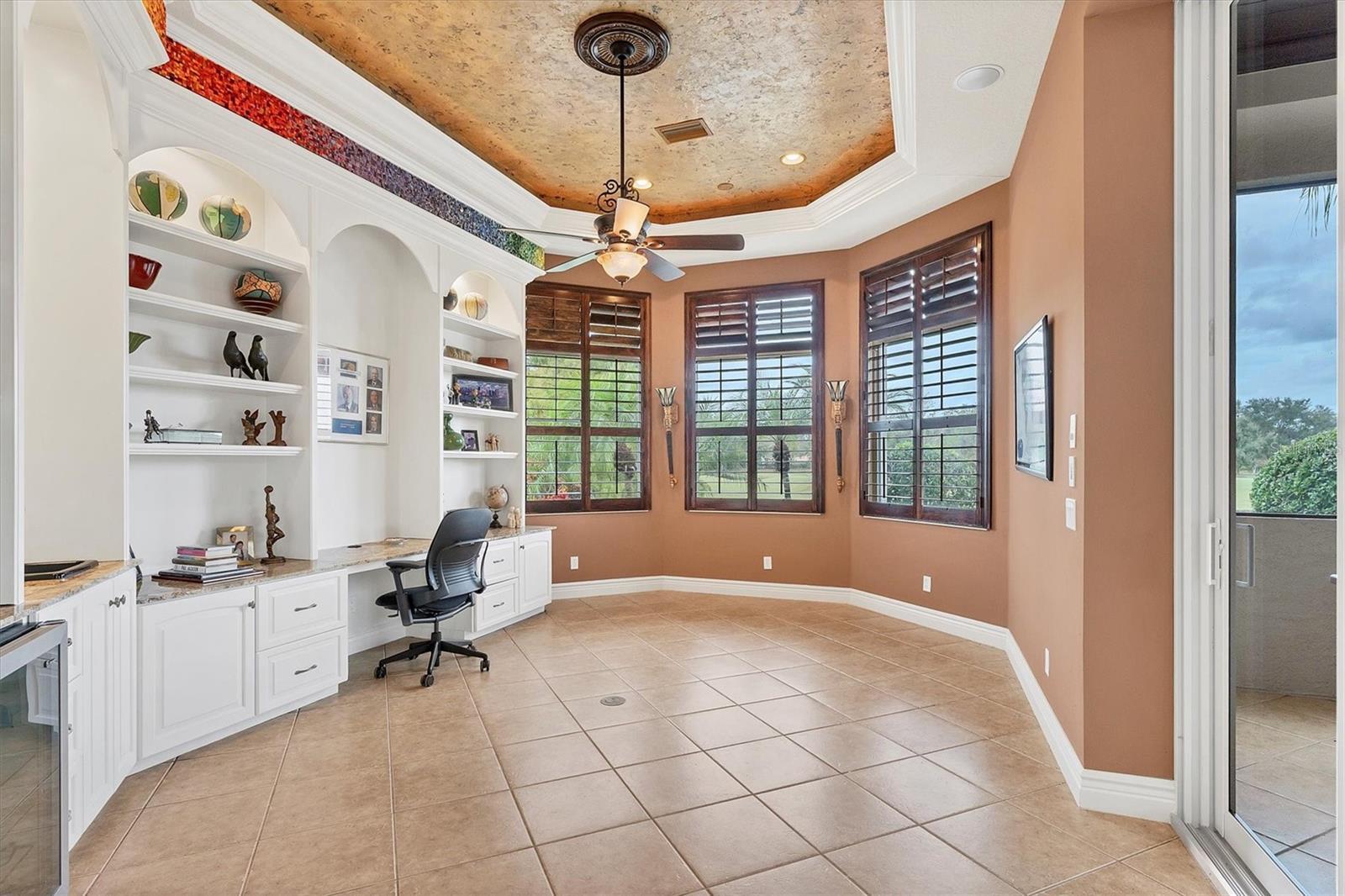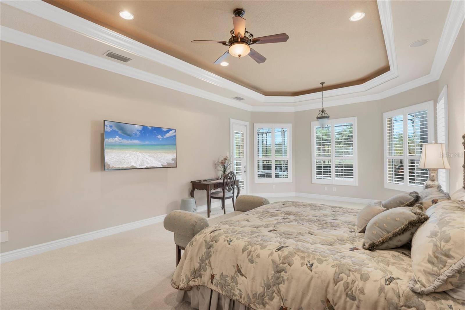 - Built-in Features, Central Vaccum, Crown Molding, Eat-in Kitchen, High Ceilings, Primary Bedroom Main Floor, Solid Wood Cabinets, Split Bedroom, Thermostat, Tray Ceiling(s), Walk-In Closet(s), Wet Bar, Window Treatments