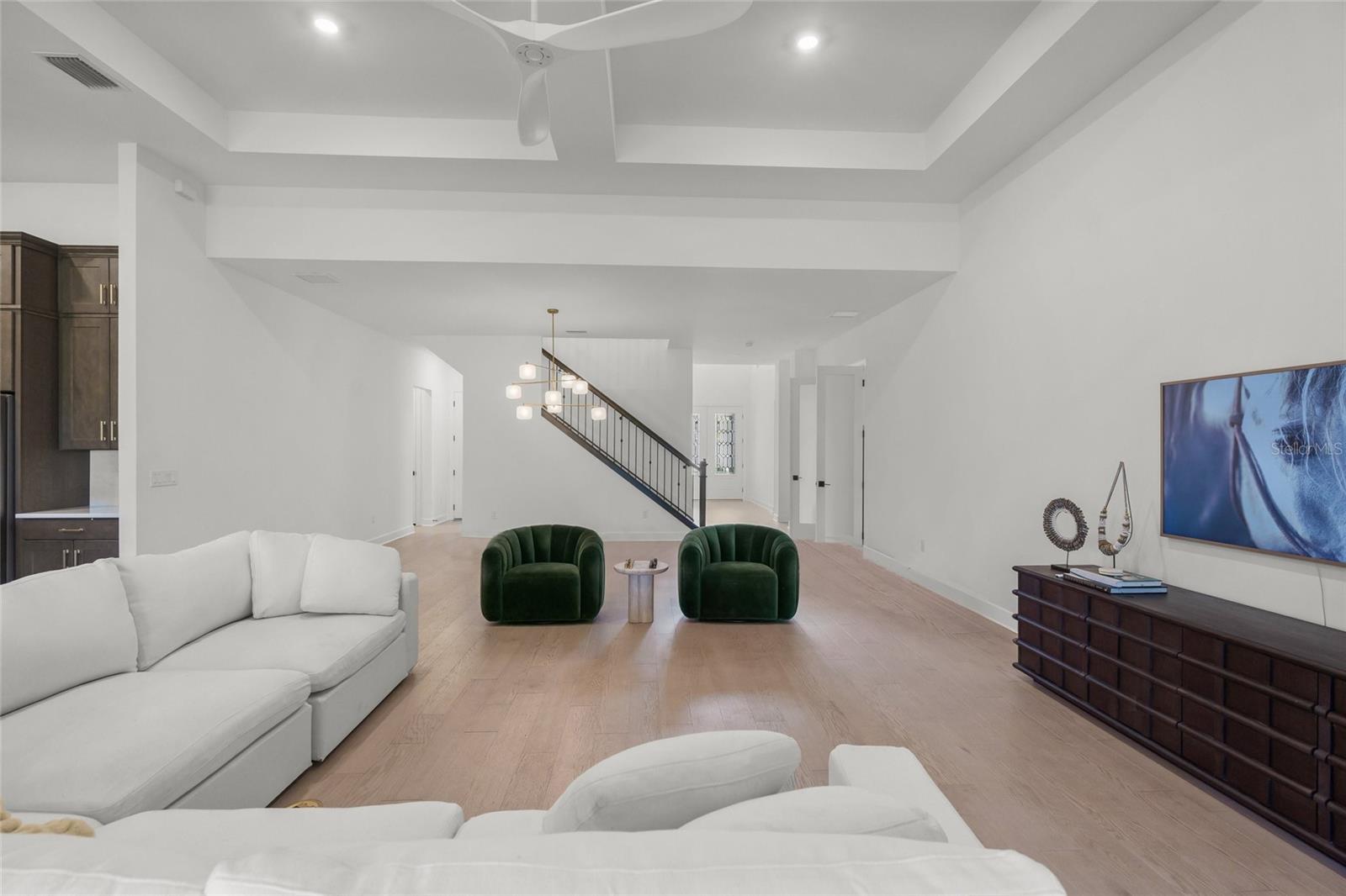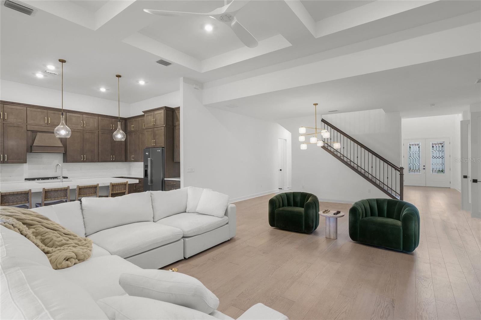 Set within the refined enclave of Shoreview at Lakewood Ranch Waterside, this extraordinary residence delivers a rare blend of contemporary sophistication, thoughtful design, and effortless luxury. Completed in 2024 (the newest home in the community) and spanning nearly 3,900 square feet, the home presents a striking architectural presence paired with interiors curated for elevated everyday living. With four generously sized bedrooms, four beautifully appointed baths, a private den, and a sprawling bonus room, the layout offers both flexibility and refinement for modern lifestyles. From the moment you arrive, the attention to detail is unmistakable. Double glass entry doors open to a dramatic foyer filled with natural light, soaring ceilings, and refined finishes that set the tone throughout. The main living level is anchored by engineered hardwood flooring and an expansive open-concept design that effortlessly connects the great room, dining area, and gourmet kitchen—creating a seamless flow ideal for entertaining on any scale. Impact-rated windows and doors provide peace of mind, while designer lighting and plantation shutters lend a polished, custom feel. At the heart of the home, the chef’s kitchen is both stunning and functional, featuring double-stacked cabinetry, quartz countertops and backsplash, a built-in KitchenAid oven and microwave, gas cooktop, and an oversized walk-in pantry. A dramatic center island with mitered-edge detailing becomes a natural gathering space for casual meals or elegant entertaining. Walls of glass sliders extend the living area outdoors to a covered lanai overlooking tranquil water views—perfect for al fresco dining, sunset cocktails, or quiet moments of relaxation. The primary suite on the main level is a true retreat, offering serene views and a spa-inspired en suite bath with dual vanities accented by gold hardware, a spacious walk-in shower, and a custom-designed walk-in closet. Two additional main-level bedrooms with nearby baths provide comfort and privacy for guests or family, while a well-equipped laundry room with additional storage enhances daily convenience. Upstairs, a large bonus room, private bedroom, full bath, and storage closet create an ideal space for guests, a media lounge, or multi-generational living. Every detail has been elevated, from iron and wood stair railings to floor-to-ceiling tiled showers, marble countertops in select guest baths, custom mirrors, updated HVAC system and epoxy-coated garage flooring—ensuring this home feels both luxurious and impeccably finished. Residents of Shoreview enjoy a maintenance-free lifestyle complemented by resort-style amenities, including a stunning clubhouse, fitness center, sparkling pool, pickleball and tennis courts, kayak launch, and inviting social spaces. Just moments away, Waterside Place offers vibrant dining, boutique shopping, live music, weekly farmers markets, and community events. With effortless access to Lakewood Ranch and the cultural attractions, beaches, and dining of Sarasota, this is more than a home—it’s a lifestyle defined by elegance, connection, and the luxury of having everything at your fingertips.