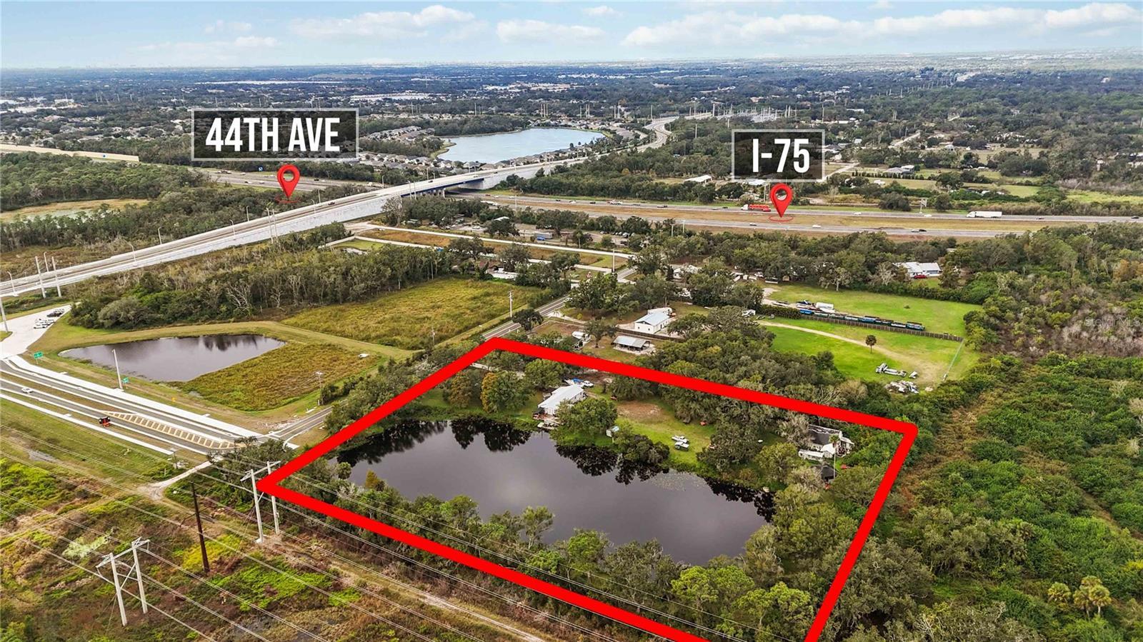 Welcome to 8011 41st Avenue East, Bradenton, FL 34211! This expansive five-acre property perfectly combines natural beauty and future potential. Nestled in the highly sought-after 34211 zip code, the property is just minutes away from I-75 and 44th Avenue East, placing it at the heart of a rapidly developing area. Currently zoned agricultural, this property offers an exceptional investment opportunity. The county's future plans for eminent domain mean that approximately half of the land—including the picturesque lake—will be acquired, ensuring a guaranteed return on investment at appraised value. This leaves roughly two and a half acres of prime, road-front land along Lena Road—set to become a major thoroughfare connecting SR 64 and SR 70—offering tremendous commercial development potential. The property includes a charming three-bedroom, two-bath home, complete with lakefront patio and two-car garage with a spacious workshop above. This allows for financing options, making it accessible for investors looking to hold and benefit from future growth. Additionally, there’s an opportunity to purchase an adjacent two-and-a-half-acre plot, further enhancing the property's value and development potential. In summary, 8011 41st Avenue East is more than just a property; it’s a strategic investment in a booming area, offering both immediate value and long-term gains.