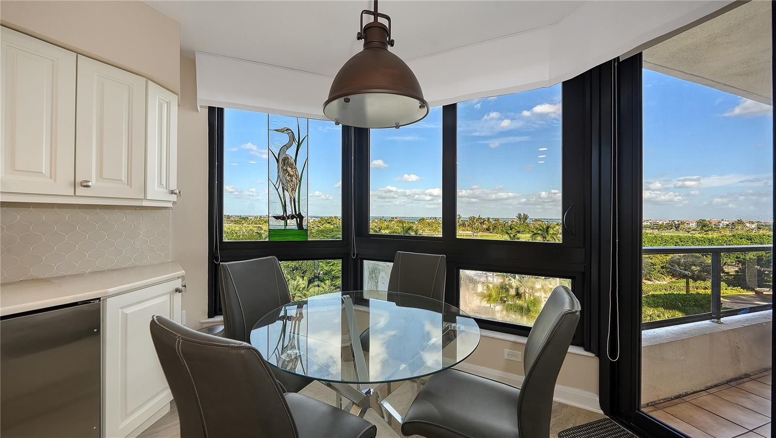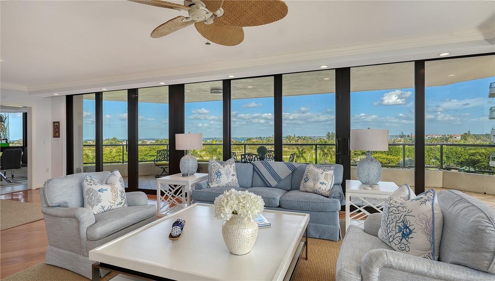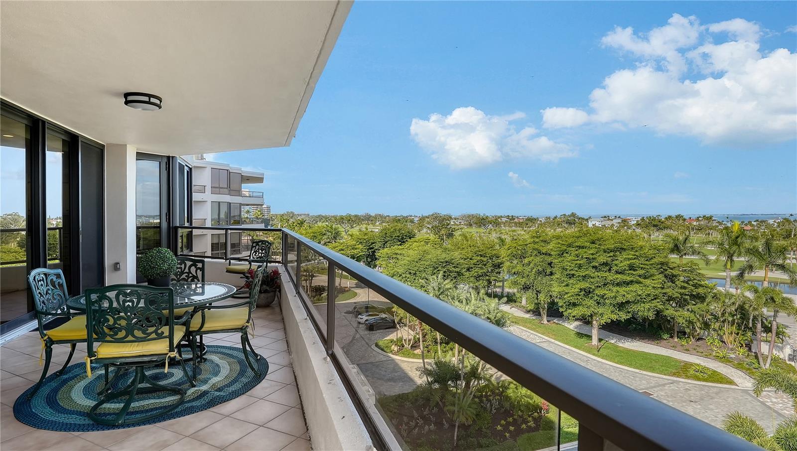 Positioned on the south side and fifth floor of Building 2 at Sanctuary at Longboat Key Club, Residence B506 offers a refined coastal lifestyle with sweeping views of the Gulf of Mexico, Sarasota Bay, and the Harbourside Golf Course. This corner residence spans approximately 2,375 square feet of interior living space, 700 square-foot balcony, and showcases a thoughtful three-bedroom, three-bath layout where every bedroom is en-suite. The residence was enhanced with impact-rated windows and sliding glass doors in 2011, creating a quieter, more energy-efficient interior while framing expansive water and golf course vistas. The kitchen, updated in 2017, features custom cabinetry, a center island, farmhouse sink, tile backsplash, and a breakfast nook surrounded by bay windows—an inviting space for casual dining with morning light. The primary suite is designed as a private retreat, complete with custom built-ins and a spa-inspired bath featuring quartz countertops, under-cabinet lighting, oversized tile flooring, dual vanities, soaking tub, glass-enclosed shower, and a private water closet. Guest suite two enjoys walls of oversized windows capturing sunny bay and golf course views, along with a built-in planning desk that discreetly tucks away and a quartz-finished bath with a dedicated vanity station. The third bedroom has been converted to a full en-suite with a custom Murphy bed, offering flexible use as a guest suite or home office. Additional highlights include crown molding, wood and tile flooring, generous storage, and two under-building parking spaces. Sanctuary residents enjoy gated security, on-site management, resort-style amenities, and direct access to the private Longboat Key Club lifestyle. Ideally located behind the guard gates of Longboat Key Club, the Sanctuary places residents minutes from the island’s pristine beaches, Bay Isles Beach Club, championship golf, tennis facilities, marinas, and the boutiques and dining of St. Armands Circle. Downtown Sarasota’s cultural attractions—including the Ringling Museum, Van Wezel Performing Arts Hall, Selby Gardens, and Marina Jack—are just a short drive away, offering the perfect balance of coastal serenity and vibrant city life.