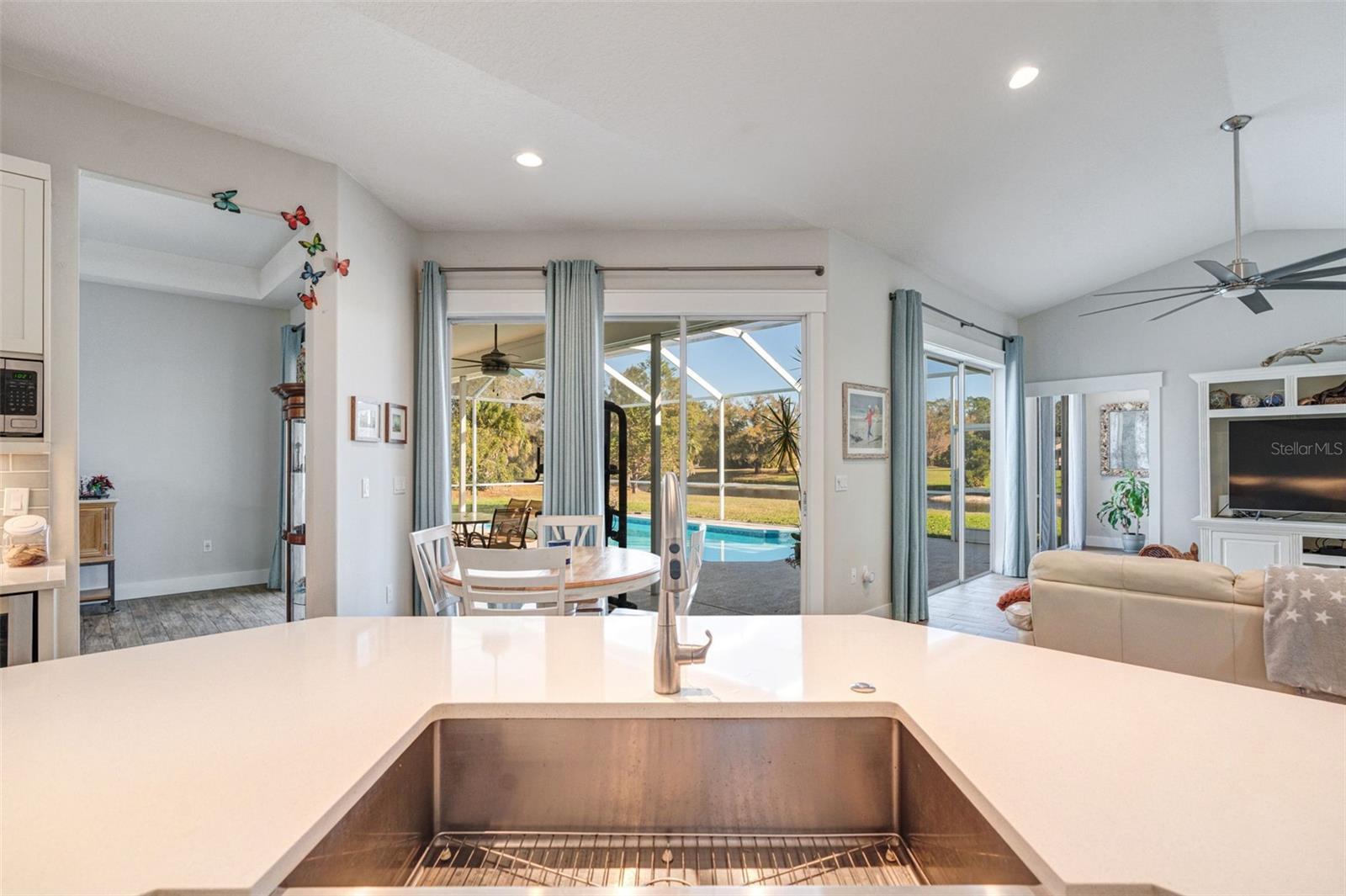 Set on 1.1 private acres with lake views in the quiet, deed-restricted Country Creek community, this 3-bedroom, 3-bath, 2,962 SF residence offers the space and comfort ideal for family living and hosting. The open floor plan with high and vaulted ceilings throughout creates a bright, expansive atmosphere, while the split bedroom layout, large office, and separate den provide privacy and flexibility for a growing family or multi-generational needs. Ceramic tile flows throughout the home, and the kitchen serves as a natural gathering place with full quartz slab countertops, a custom oversized quartz island, and soft-close cabinetry and drawers, perfect for everyday life and holiday entertaining. The home’s scale lends itself beautifully to seasonal décor and large gatherings, with a screened pool and generous outdoor space extending the living experience. A three-car garage and extended driveway easily accommodate multiple vehicles and guests, while a new metal roof, hurricane-grade front entrance, and thoughtfully landscaped side yard with unique plantings add peace of mind, privacy, and character. This is a home designed to grow into, celebrate in, and make lasting memories, all just minutes from Sarasota’s beaches, dining, and shopping.