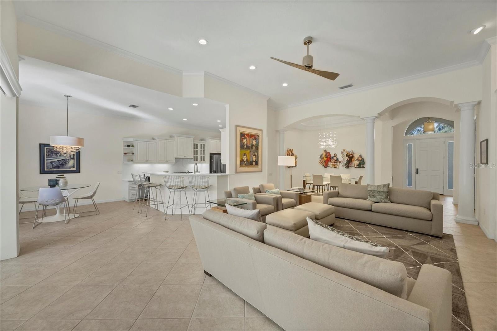 Welcome to this beautifully maintained and updated 3-bedroom, 2.5-bath residence in the desirable Kenwood Park neighborhood, featuring its own community pool. Framed by lush tropical landscaping, a gracious foyer welcomes you into a bright, open-concept home with soaring ceilings, crown molding, neutral paint tones, modern recessed lighting, and ceiling fans throughout. Diagonal tile and hardwood flooring flow seamlessly through most of the home, enhancing the airy feel and private, tranquil views. The updated eat-in kitchen is both stylish and functional, offering antique white cabinetry—some with glass inserts—sleek quartz countertops, under-cabinet lighting, and stainless steel appliances. A raised breakfast bar, center island with wine refrigerator, built-in desk area, and direct access to the lanai make this kitchen ideal for everyday living and entertaining. The living room features accent lighting, a modern ceiling fan, and a striking gas fireplace set on a custom accent wall. Triple sliding doors create effortless indoor-outdoor living, opening to a private lanai retreat with an aqua-colored pool, relaxing hot tub with waterfall feature, and convenient half pool bath. The outdoor kitchen, complete with grill, burner, sink, and hood, is perfect for entertaining while enjoying serene tropical views. Tile pavers and an electric roll-down hurricane shutter complete this inviting space. The spacious primary suite includes hardwood flooring, a seating area, abundant windows, double sliders to the lanai, and two large walk-in closets. The updated ensuite bath is a true retreat, featuring a zero-entry shower, freestanding soaking tub, double vanity with makeup area, granite countertops, modern fixtures, and a private water closet. Two charming guest bedrooms offer hardwood flooring and ceiling fans, while the shared guest bath features a walk-in shower. The laundry room includes a sink, cabinetry, and a holding shelf for added convenience. The 2-car garage features a separate side golf cart door. Notable upgrades include a NEW whole-house generator (2025), Bermuda shutters in select rooms, and modern window shades throughout. Move-in ready, this home delivers the very best of Florida living in award winning University Park Country Club. Some furnishings are available for purchase. University Park Country Club is consistently ranked one of the top courses in Florida featuring 27 holes of championship golf; tennis and pickleball; fitness center, croquet – as well as an array of social and group activities. Just a 15-minute drive outside this peaceful enclave is downtown Sarasota, with shopping, arts & theatres, museums, dining and entertainment, top-ranked healthcare, beaches and SRQ International Airport. Two miles east of UPCC is the convenience of I-75, University Town Center with 300 nationally known and homegrown shops, restaurants, fitness studios, services and attractions, the Nate Benderson Park, home of world-class rowing events and the Mote Marine Aquarium. Enjoy the club amenities with the required minimum of a Social membership at UPCC, which is owned by the residents through a Recreation District. Dining room chandelier does not convey.